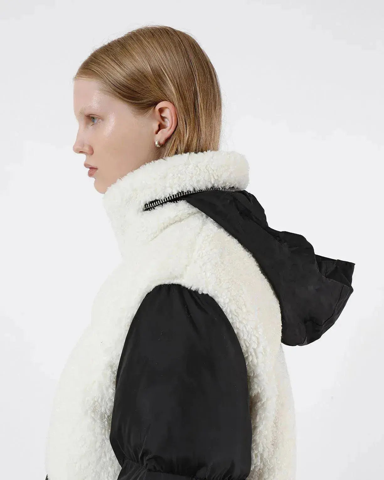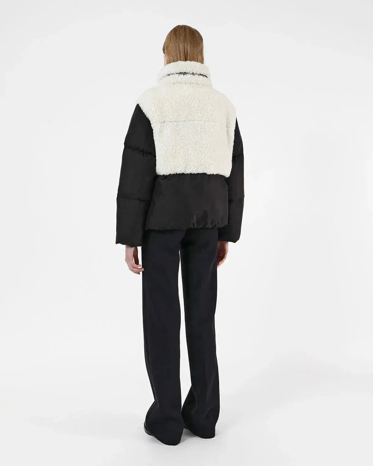 Piumino Apparis mixed media. Chiusura con cerniera. Collo alto con cappuccio nascosto. Polsini elasticizzati. Tasche con cerniera. Finiture e interni in shearling vegano riciclato a contrasto. Coulisse sull'orlo.