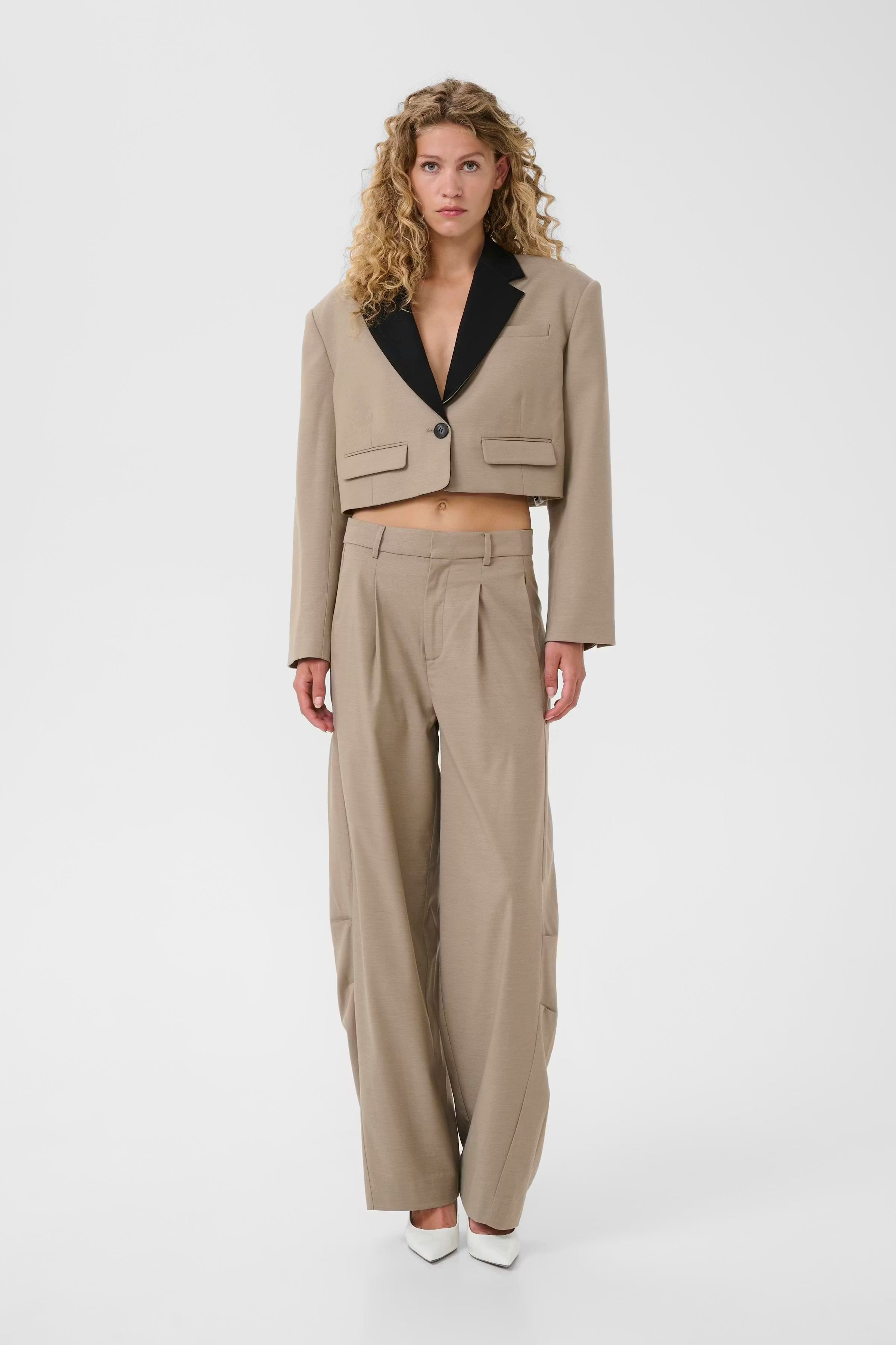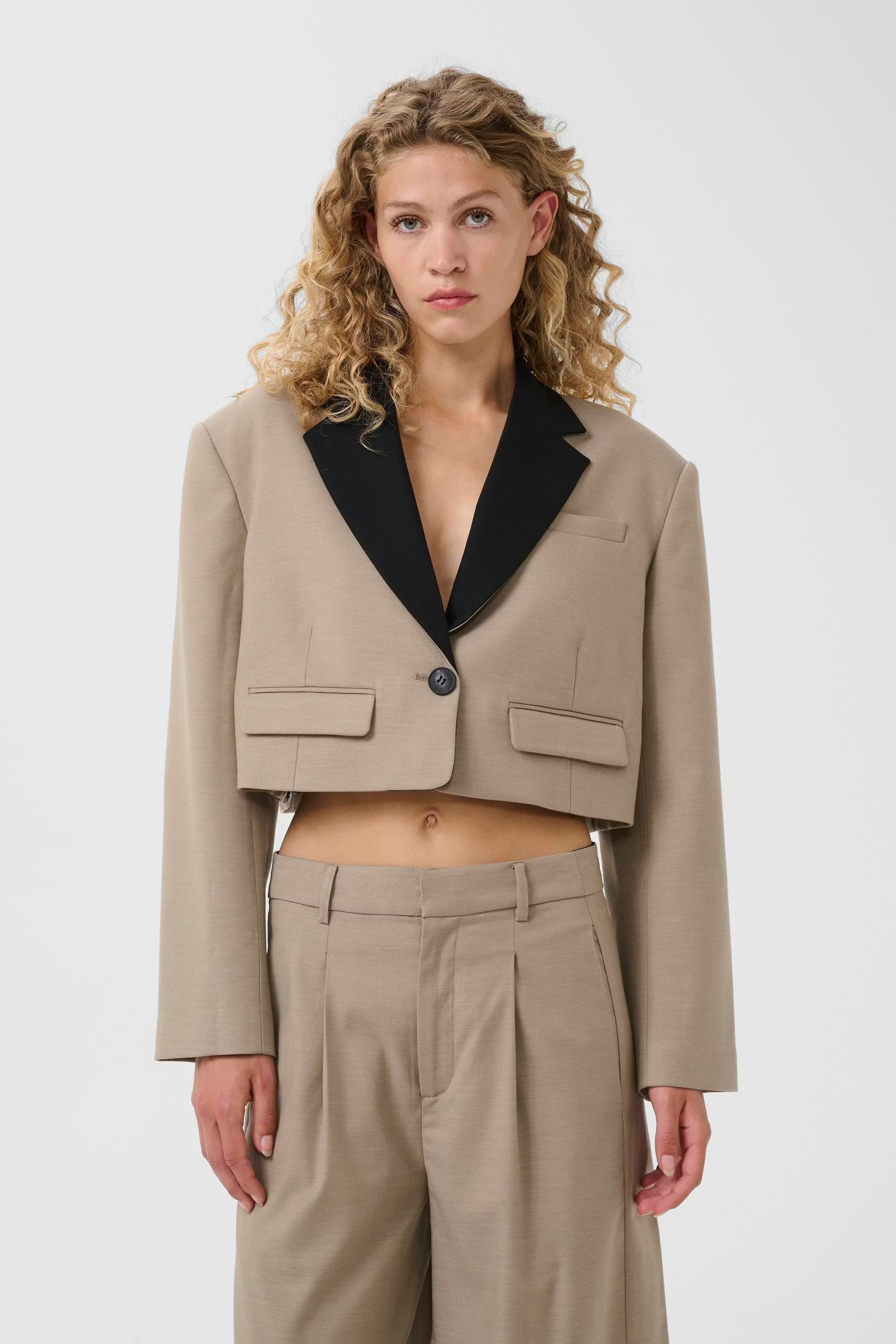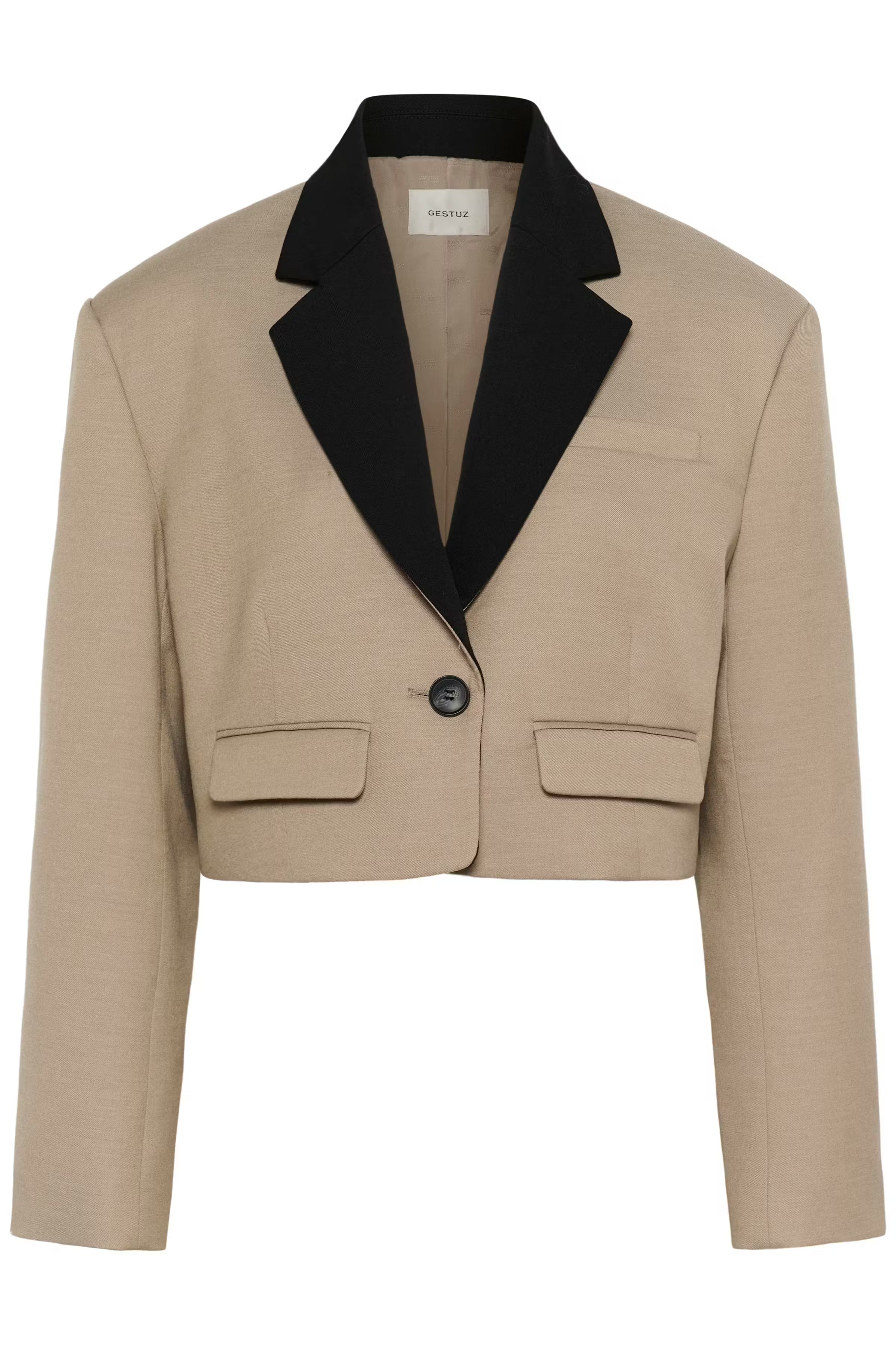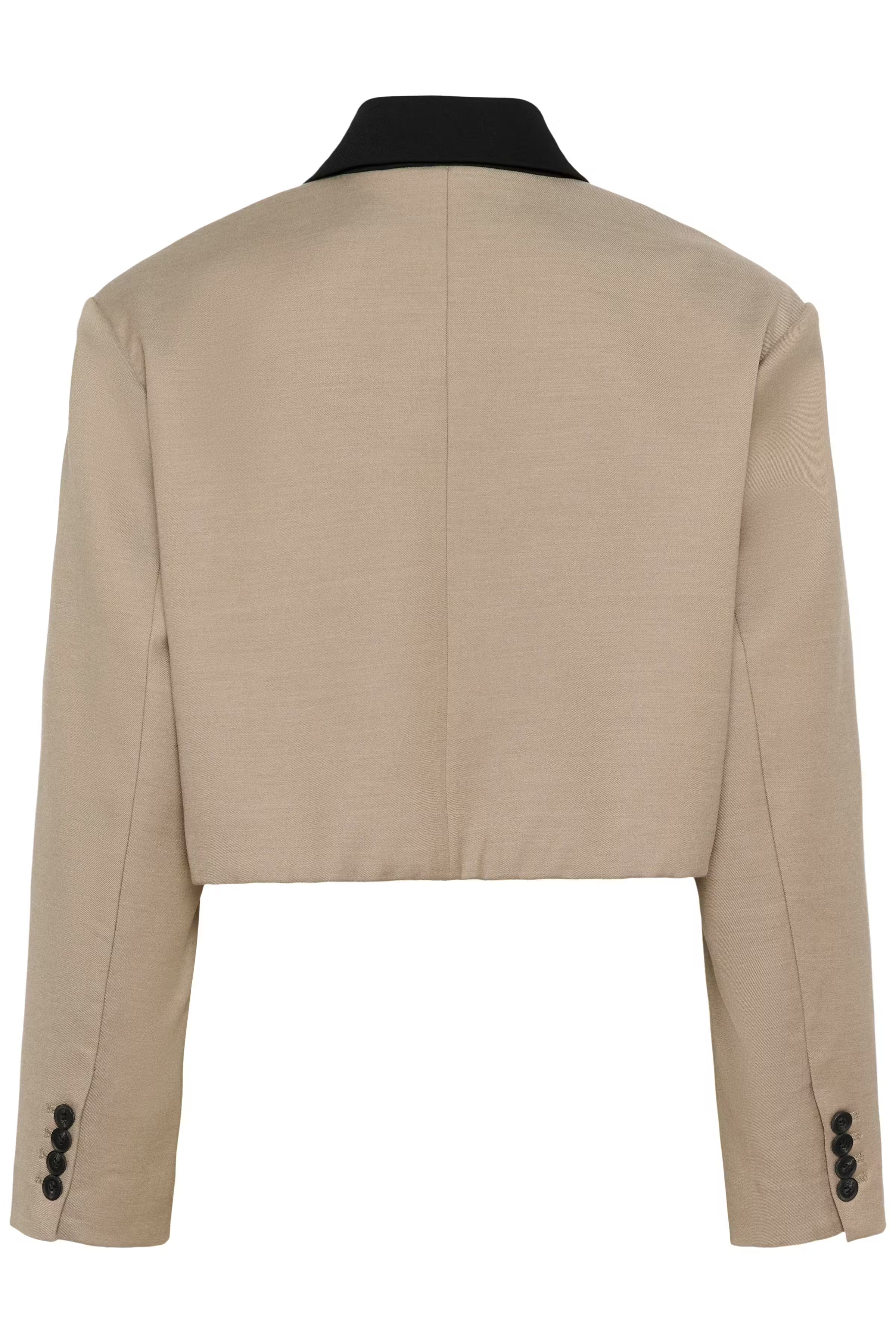 Cropped blazer for women with a modern tailored fit, featuring a sharp contrast lapel, long sleeves, and classic front flap pockets for versatile wear and comfort in any setting. Adjustable elastic at back hem. Hidden elastic at cuff.