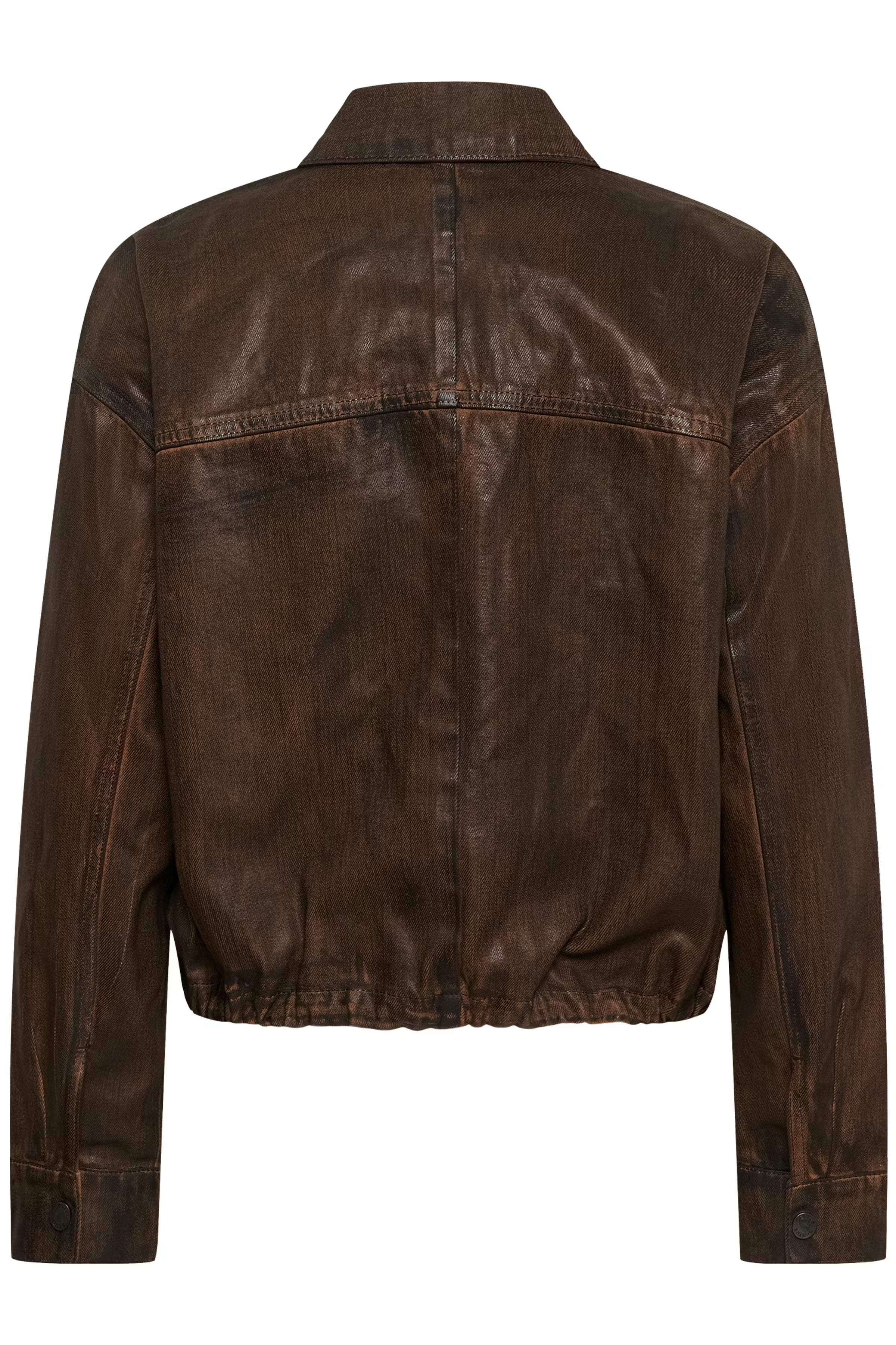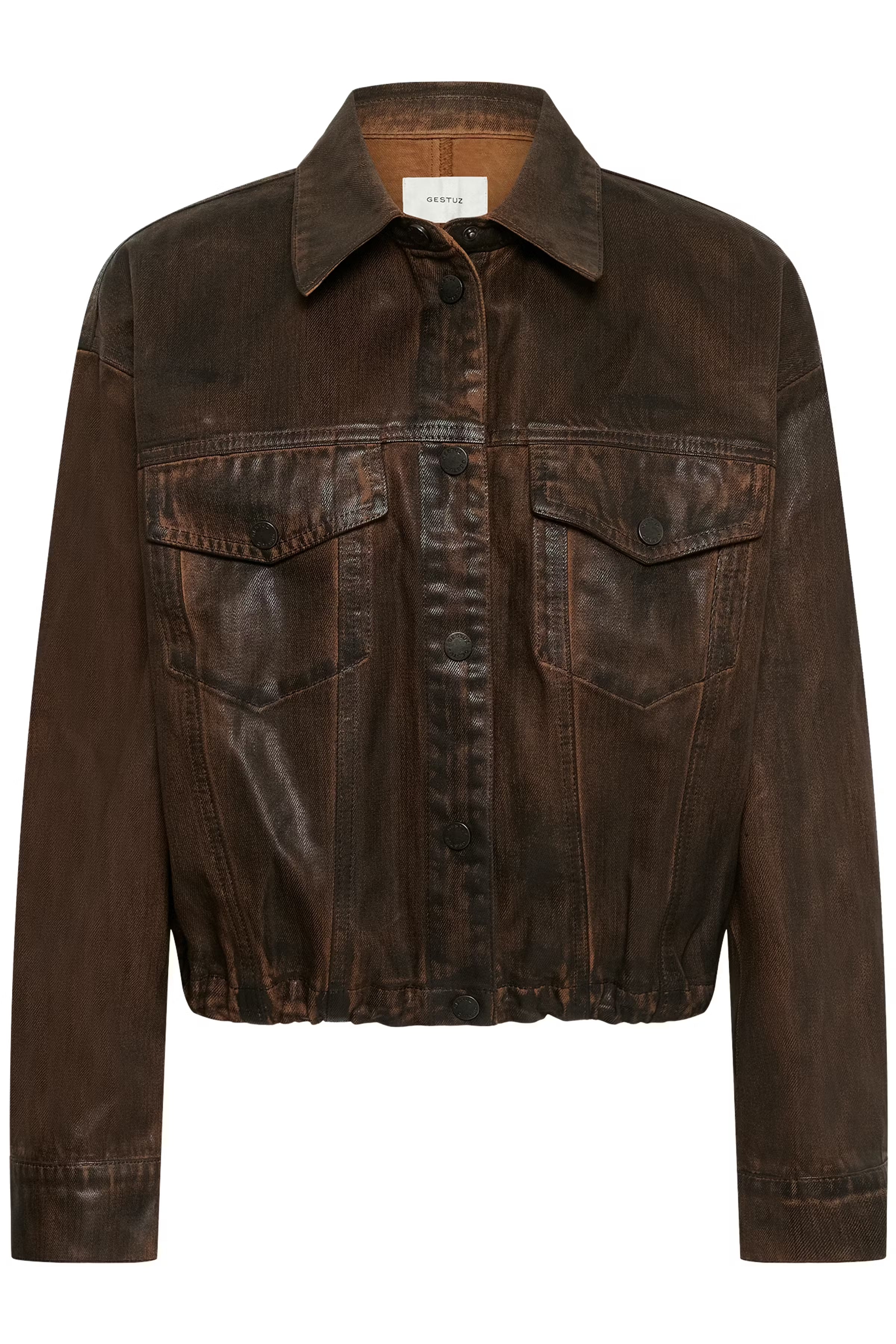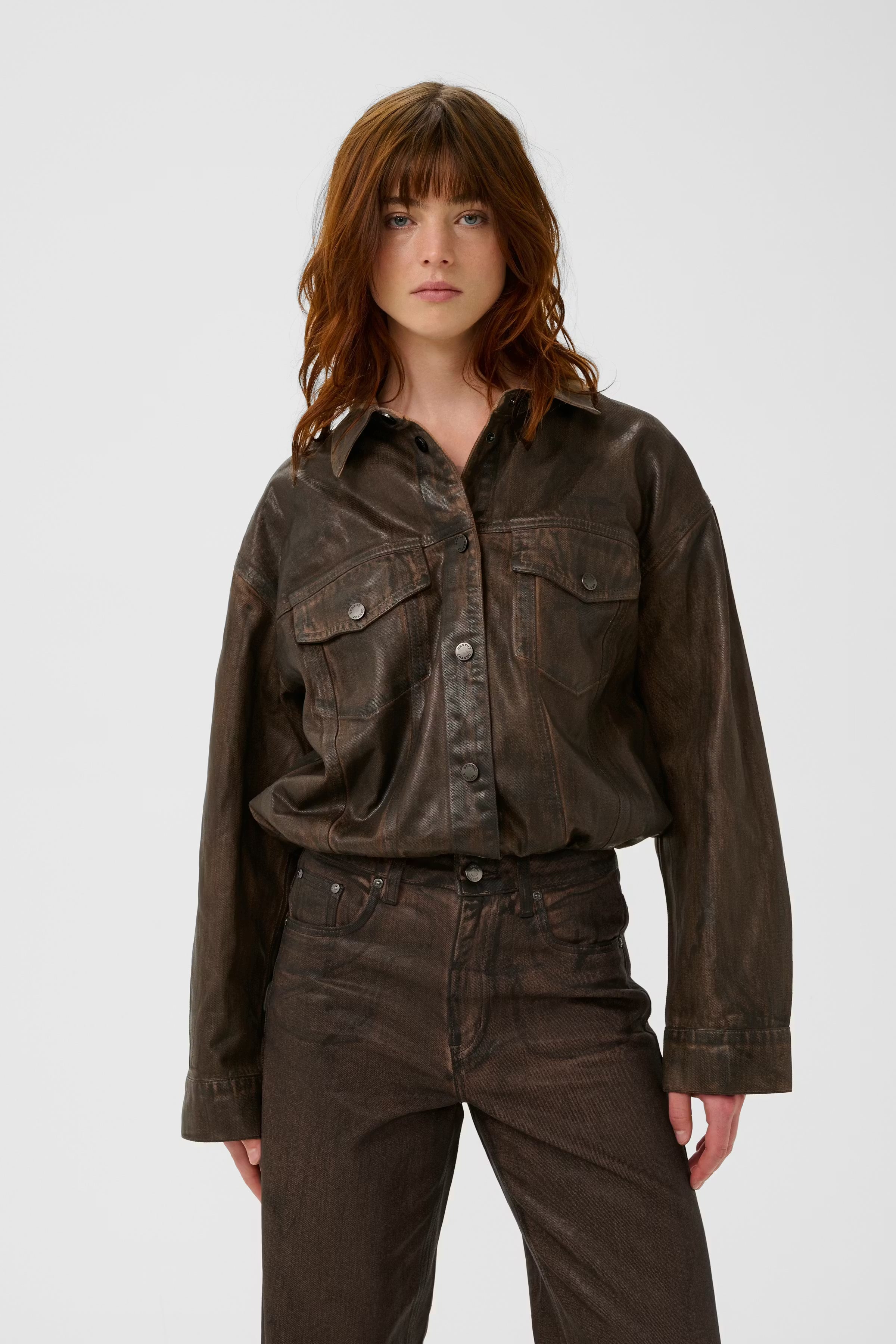 Denim jacket with boxy silhouette, structured point collar, snap button front, chest patch pockets, and subtle puckered hem. Long sleeves and visible seam details create a modern, confident edge.