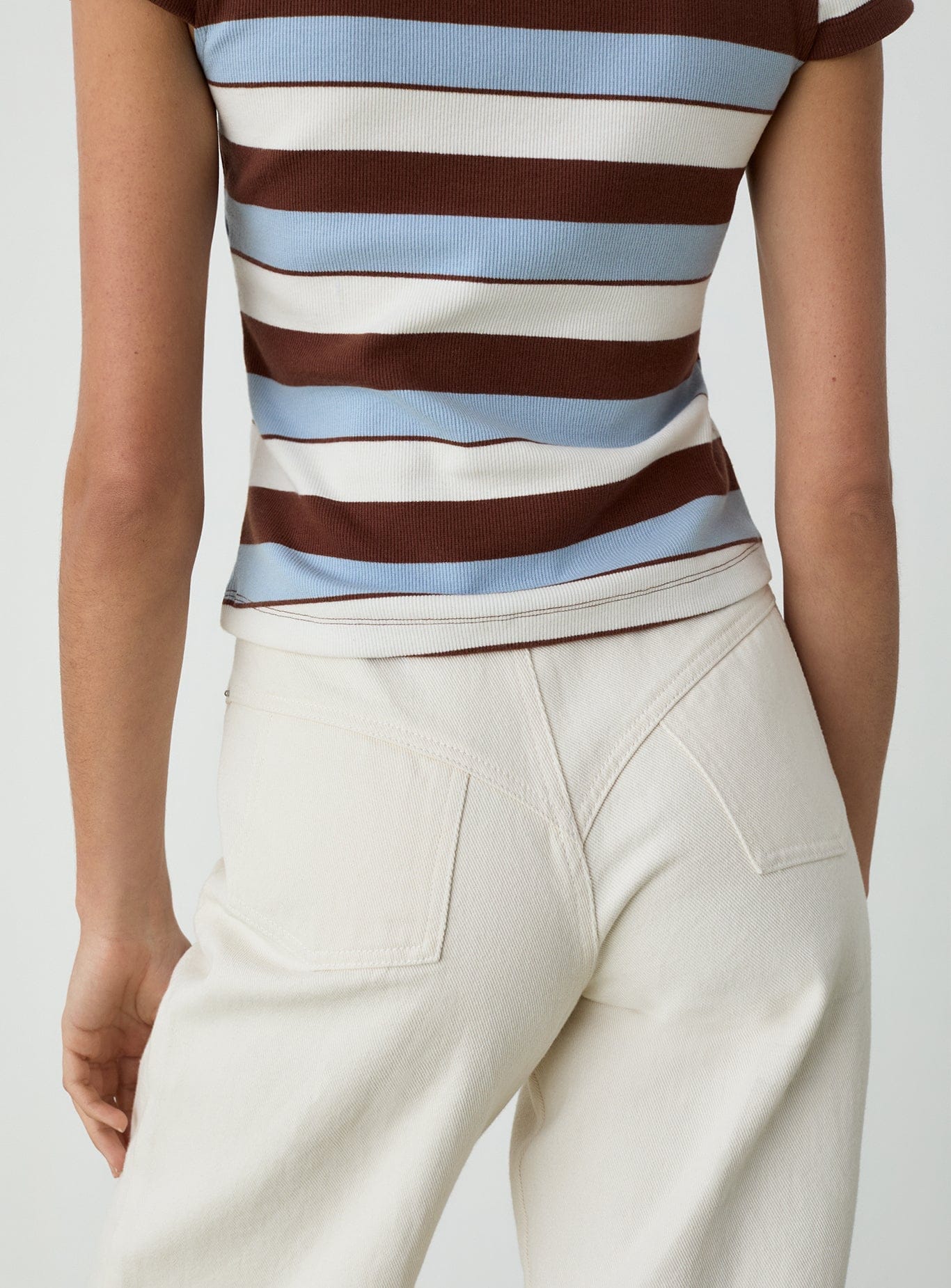 High-waist denim jeans with wide-leg silhouette and curved stitching details on front and back. Two front pockets and turned-up hem. Curved seam detail on back. Front zip and metal button closure.