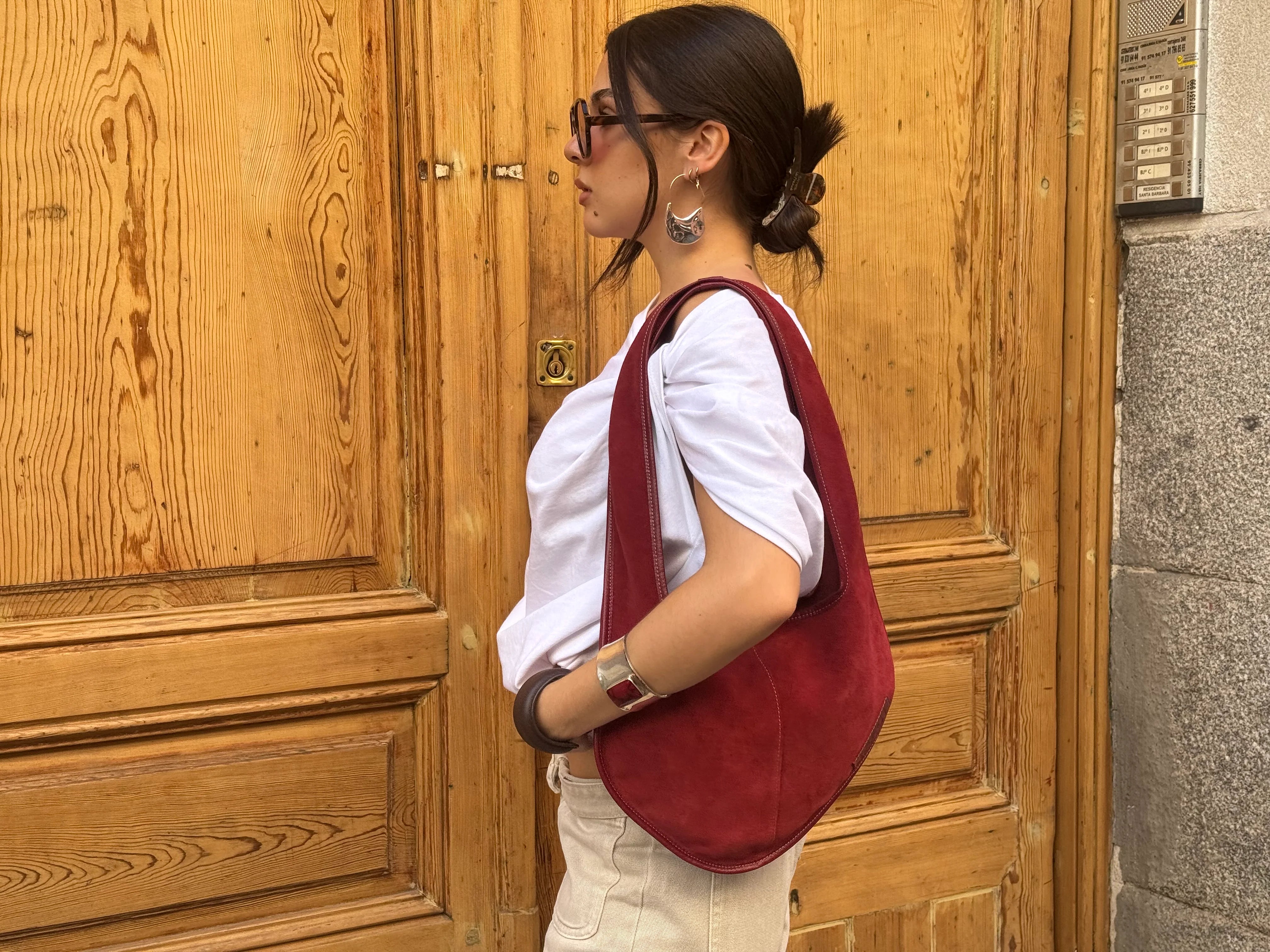 This bag is made of natural suede. Due to the characteristics of suede, it may show slight color loss, especially when worn with light-colored clothing or in humid conditions.