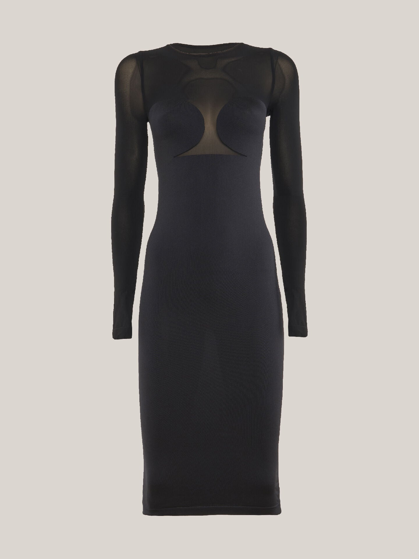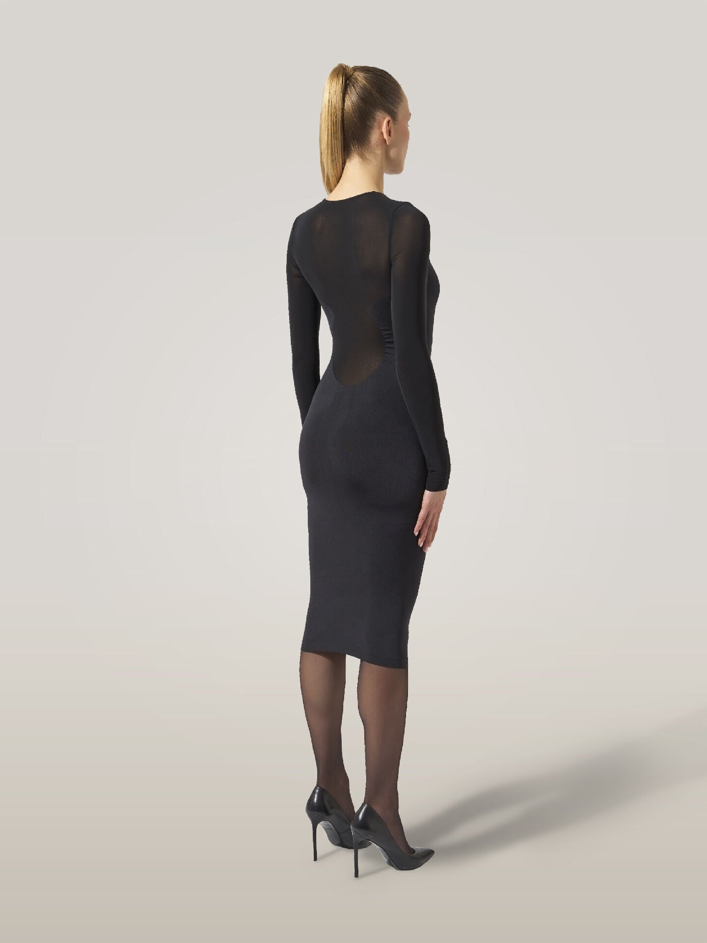 Scegli la silhouette aderente di quest'abito per non passare mai inosservata: la parte superiore stile corsetto e gli strati semi-trasparenti sulle maniche definiscono un fascino magnetico e femminile. Arricchito dal caratteristico gioco di texture opache e lucide di Wolford, è stato creato utilizzando la tecnica di lavorazione a maglia circolare, icona del brand. Rifinito con scollo rotondo e bordi integrati, la sua silhouette con vestibilità aderente arriva fin sotto il ginocchio.