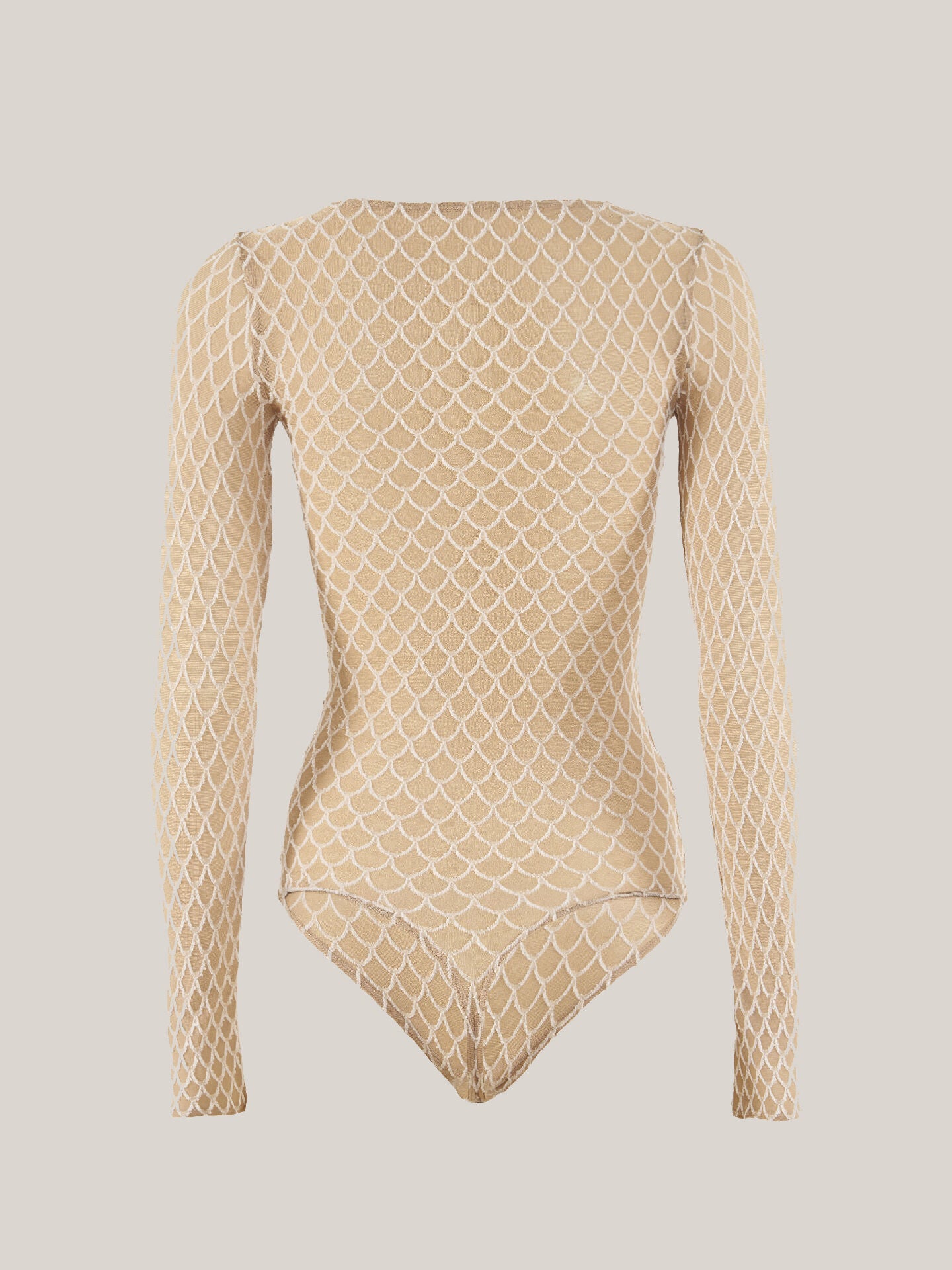 Un sorprendente motivo geometrico 3D arricchisce il body a maniche lunghe di un elemento grafico audace. L'iconica lavorazione a maglia circolare di Wolford alterna due texture diverse, trasparente e opaca, creando un gioco di contrasti. Rifinito con scollo rotondo e pratica chiusura con automatici, ha un look moderno grazie alla finitura liscia e opaca.