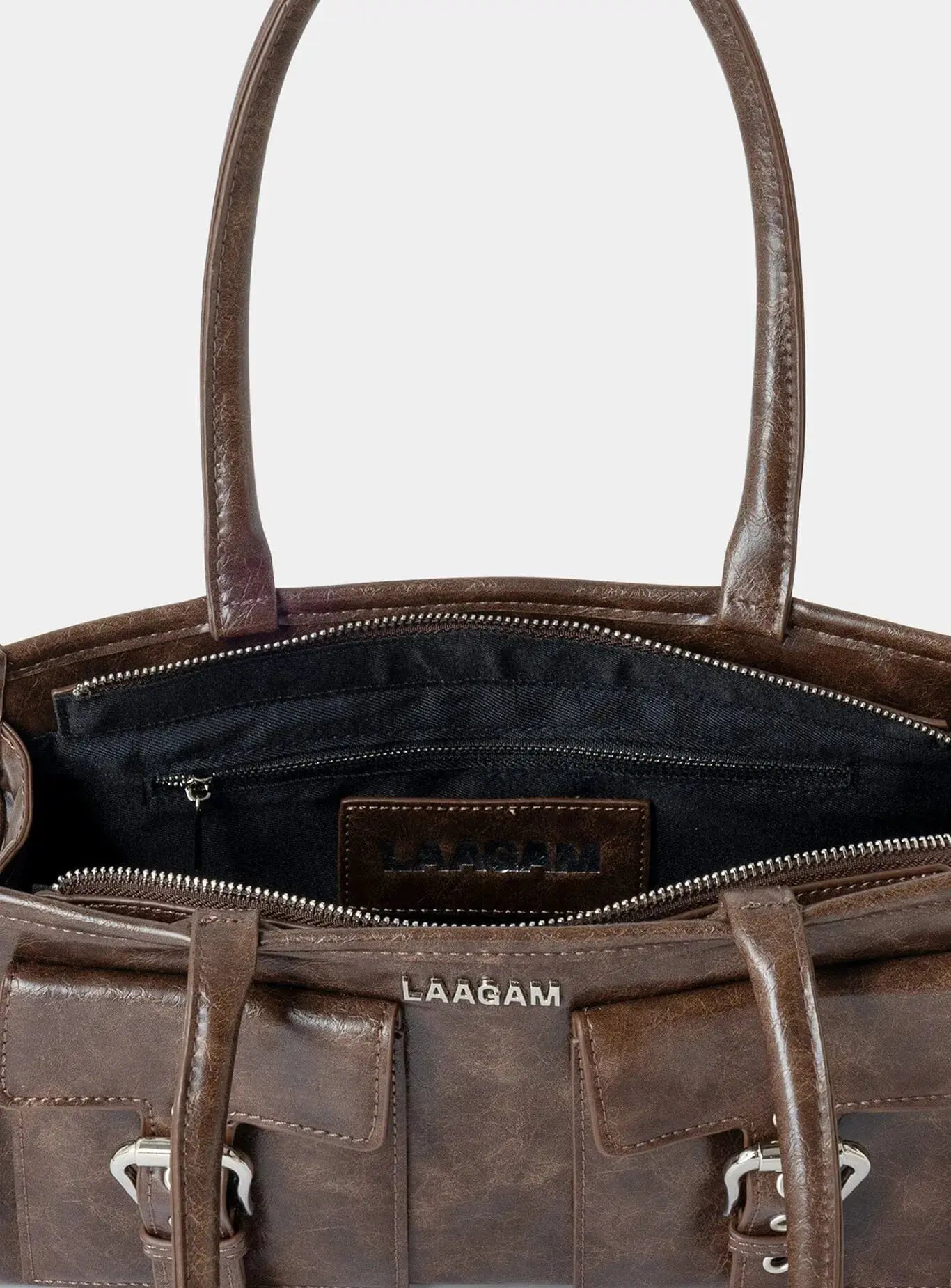 Borsa Laagam multitasche in pelle vegana marrone con logo e fibbie metalliche sul davanti. Manici a spalla, chiusura con cerniera in metallo e tasca interna. La pelle vegana utilizzata per questo stile ha consistenza e lucentezza.