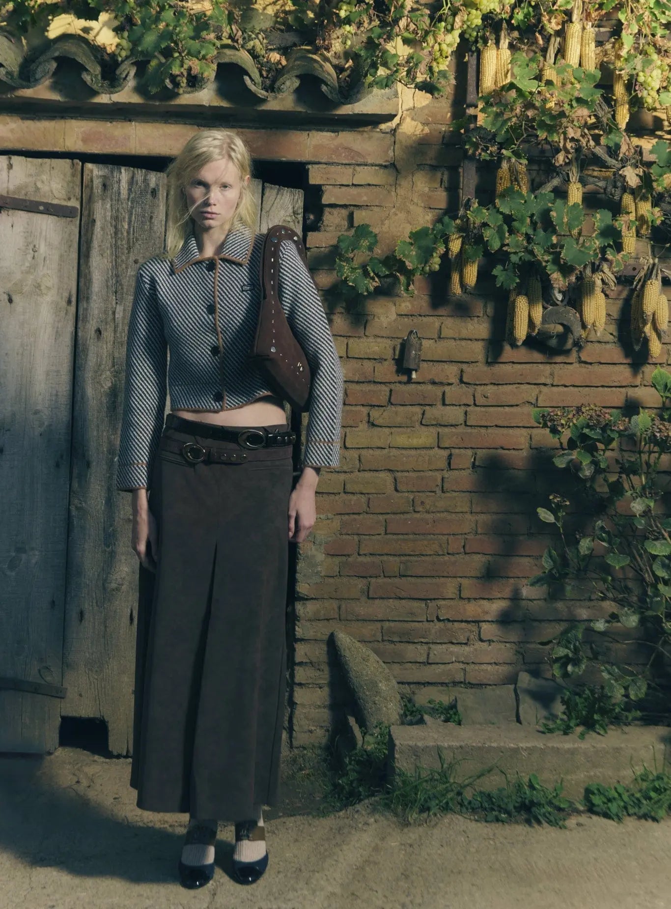 Real suede, square-shaped shoulder bag featuring a unique open-handle cutout design. Decorative studs line the edges, with a metal imagotype detail on the front. 28*6*40cm