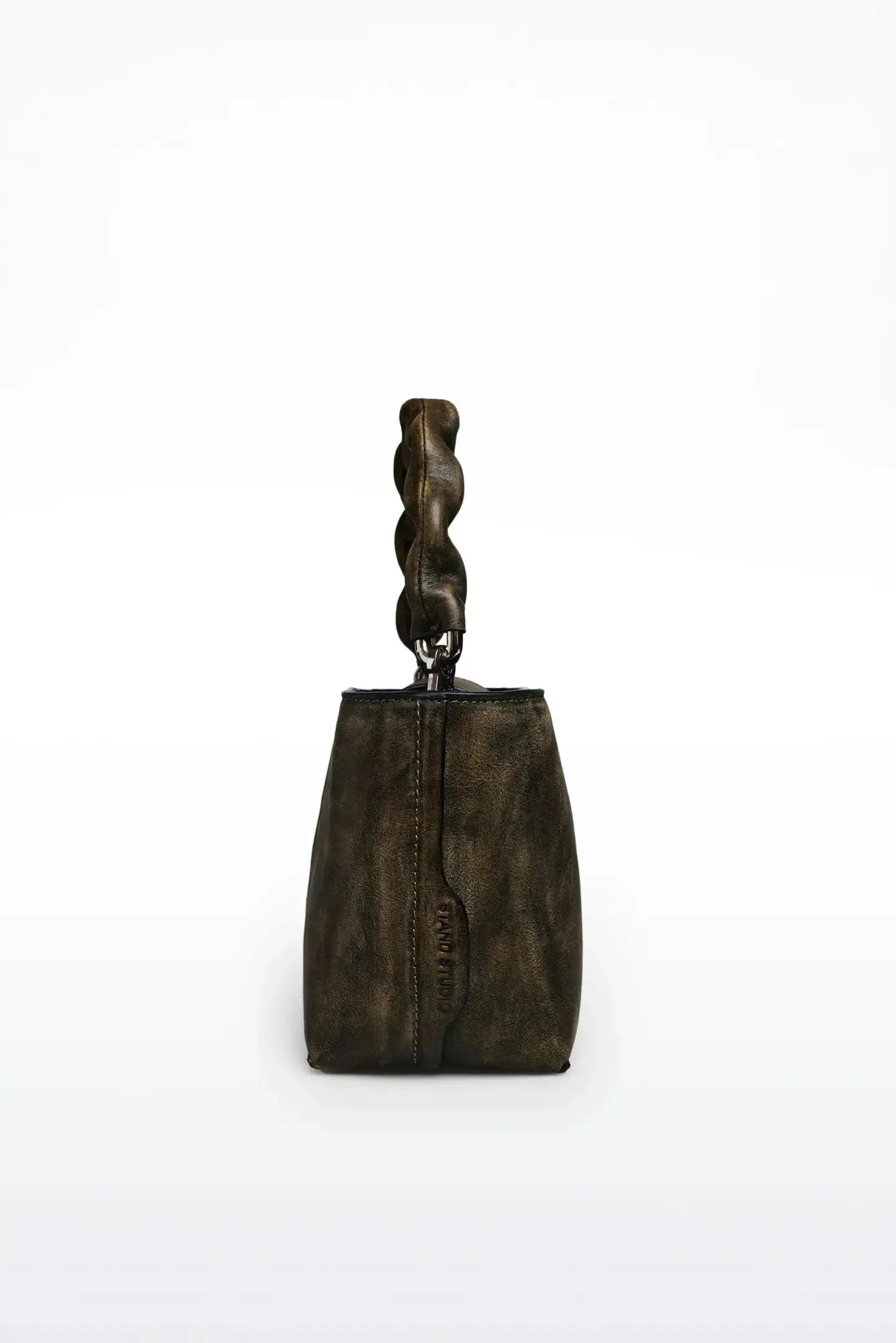 Finitura usurata, portabilità a mano o a spalla, tracolla in pelle staccabile e regolabile, chiusura magnetica nascosta sul coperchio superiore, tasca interna a marsupio, finiture argentate