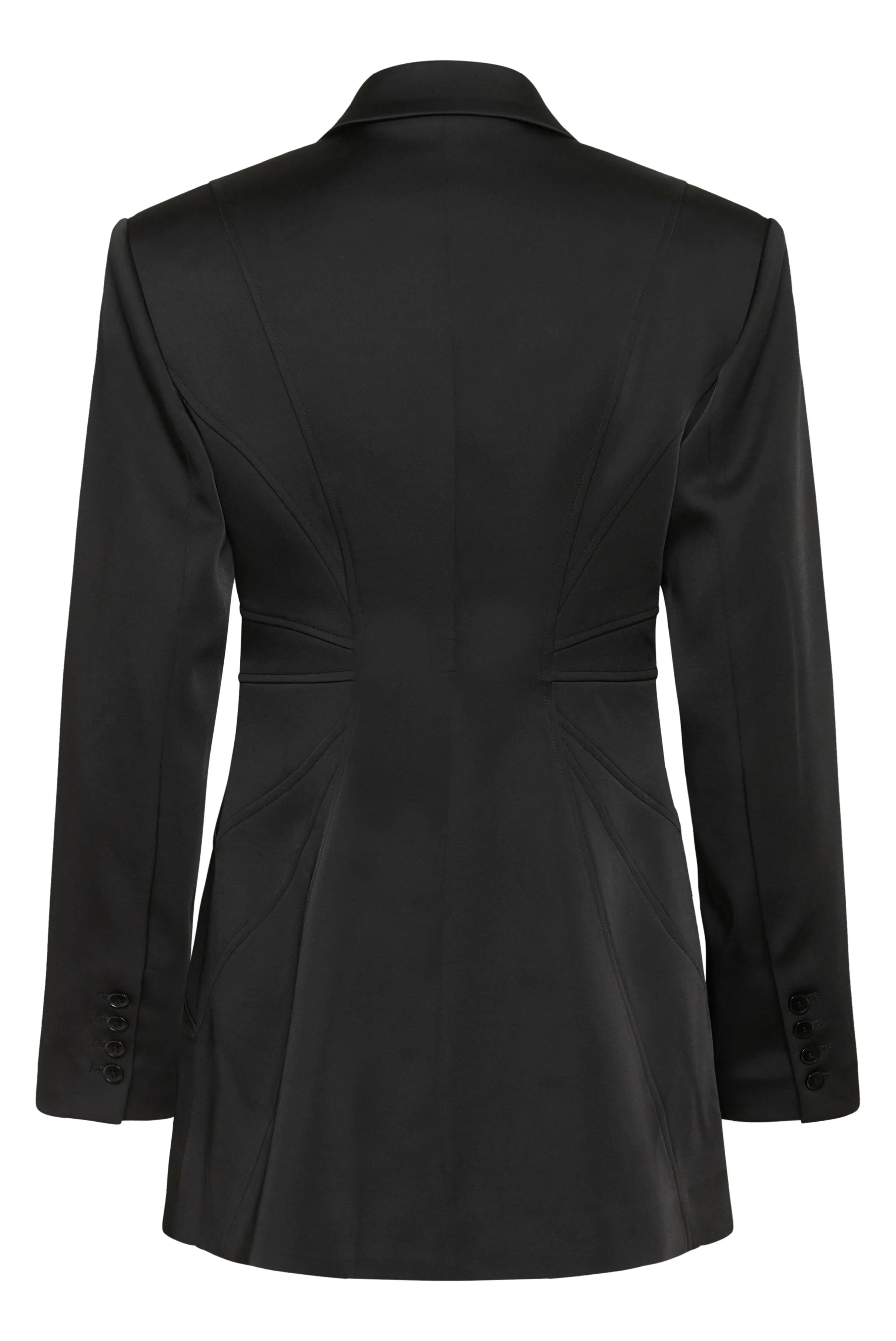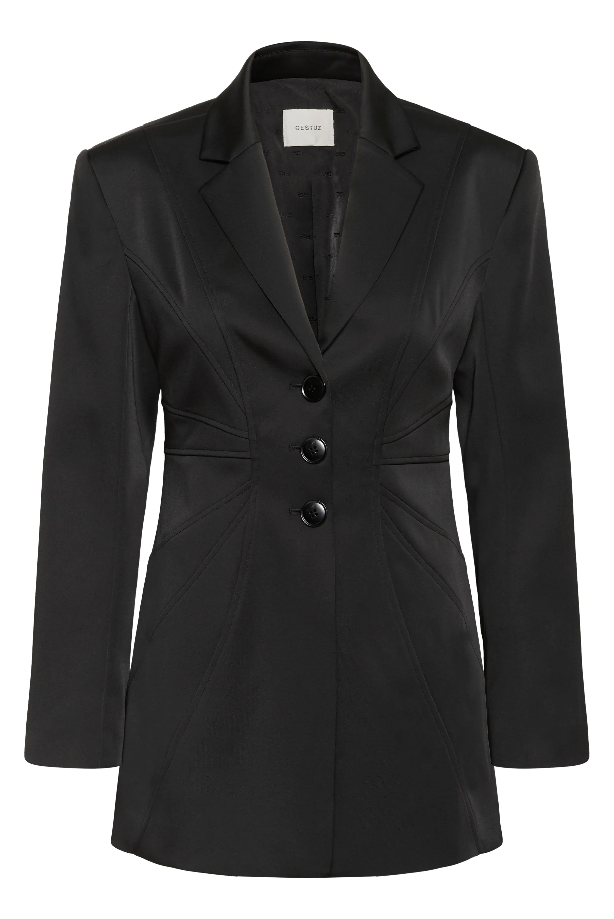 Blazer lungo Gestuz con vita scolpita, rever a lancia e chiusura a tre bottoni. Realizzato in tessuto liscio con cuciture dettagliate che esaltano la silhouette femminile.