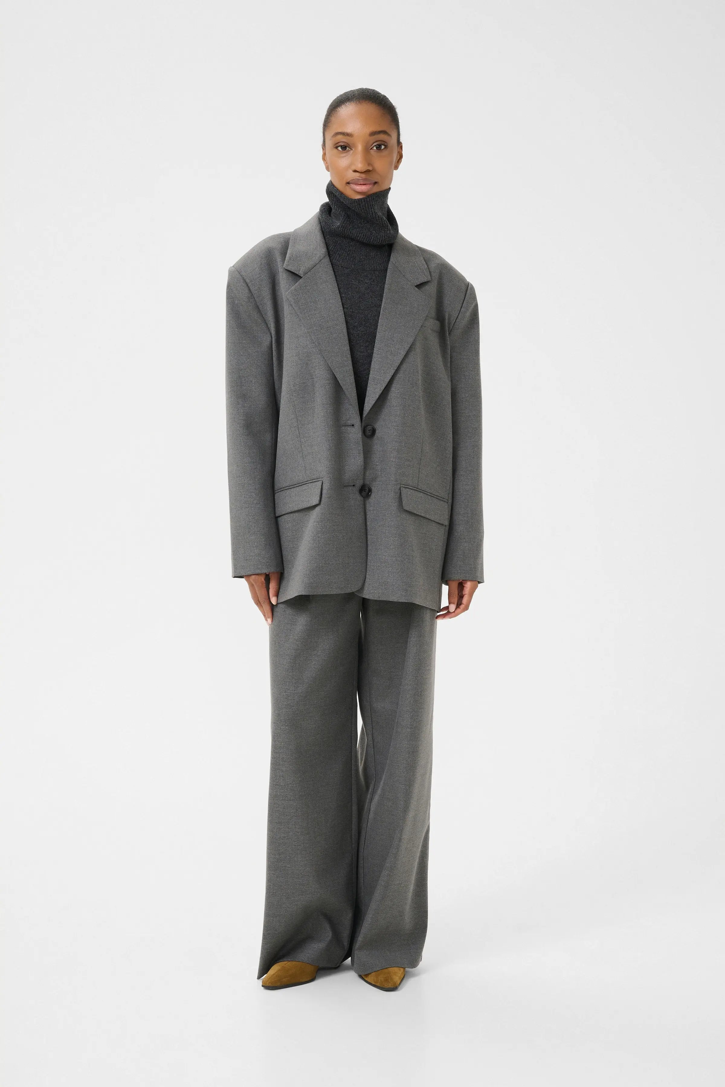 Oversized blazer with classic lapels, two-button front and flap pockets. A relaxed fit for effortless styling.