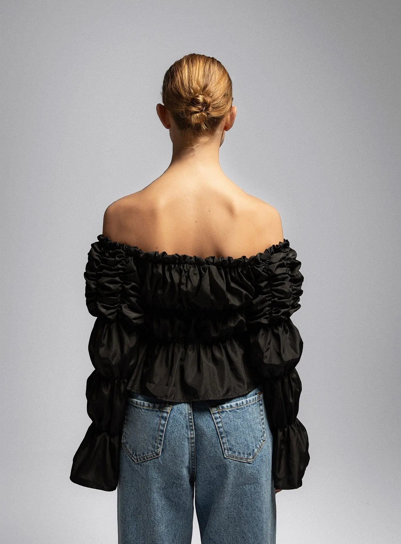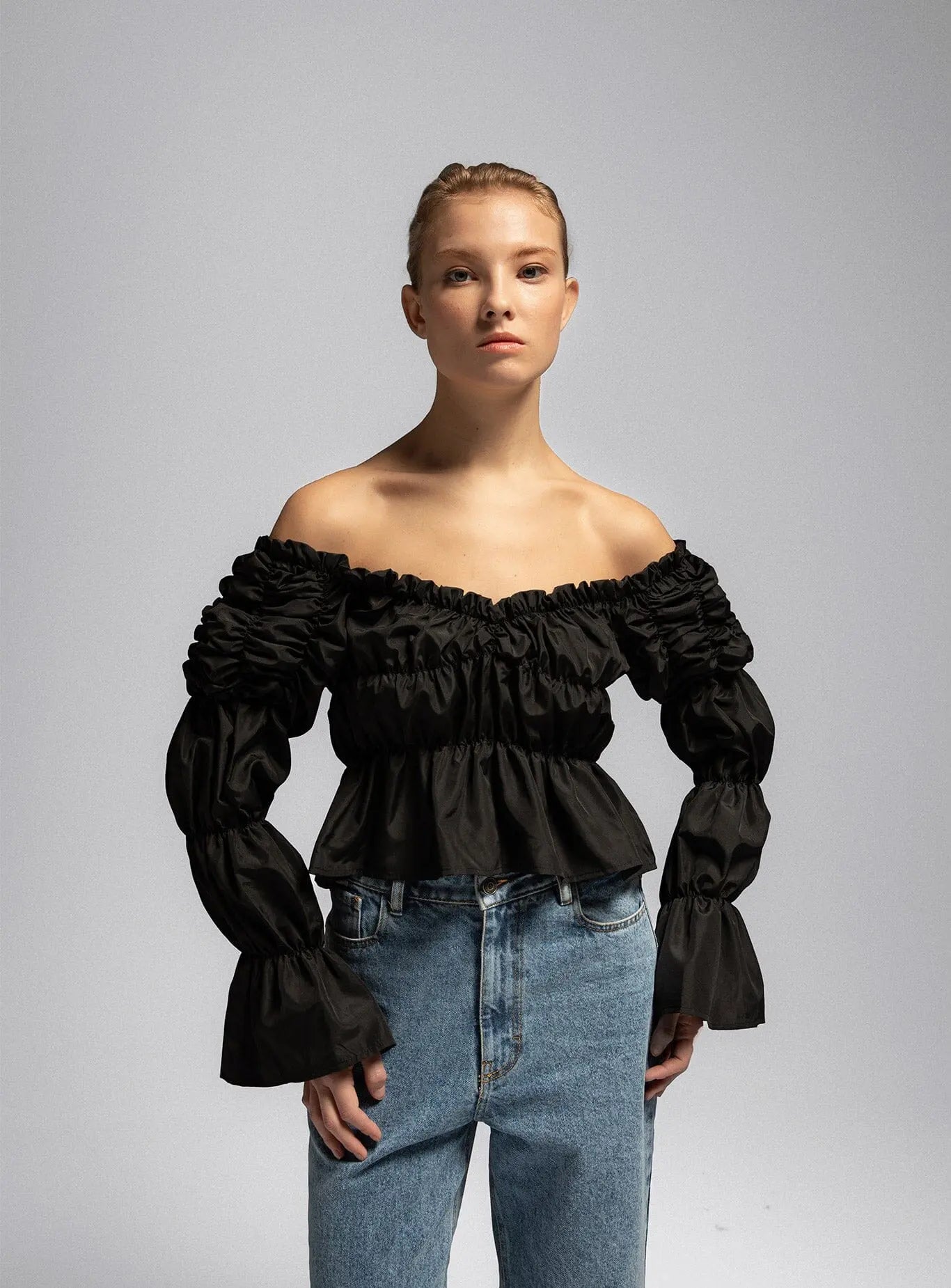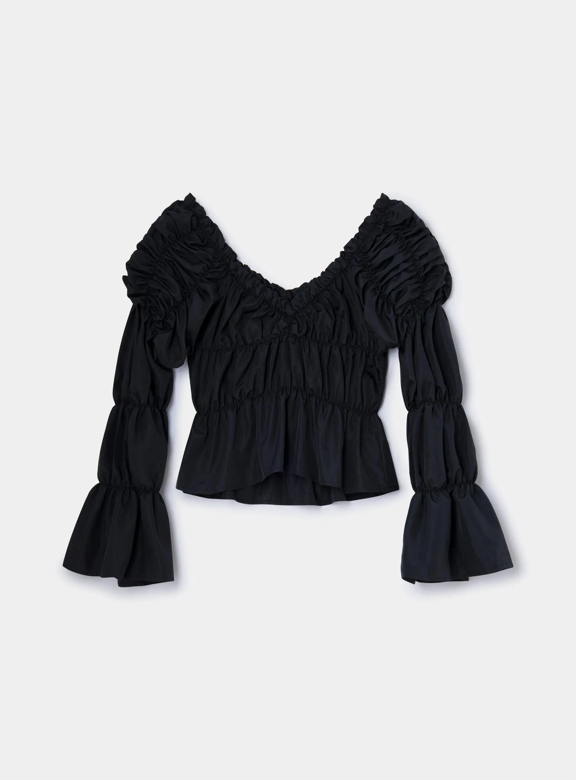 Blusa Laagam arricciata con volant sul fondo. Maniche lunghe e polsini svasati. Indossabile con le spalle scoperte o in posizione normale.
