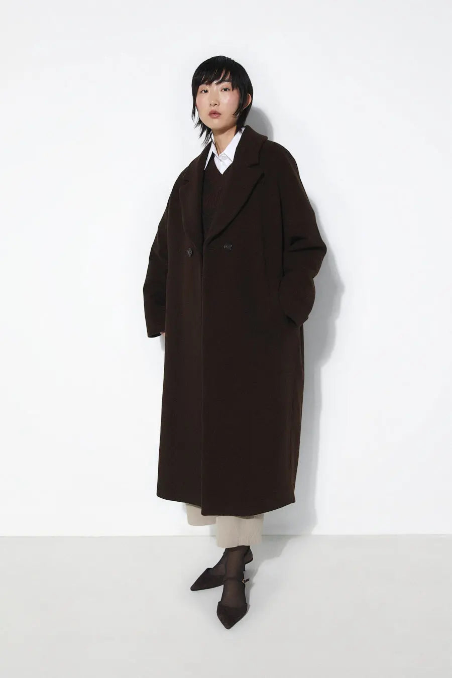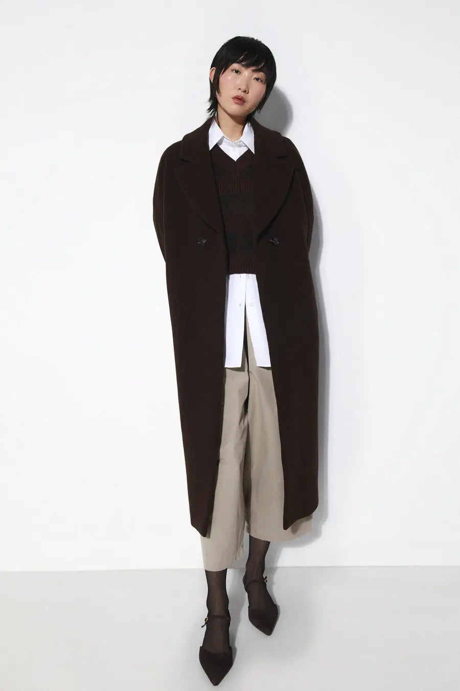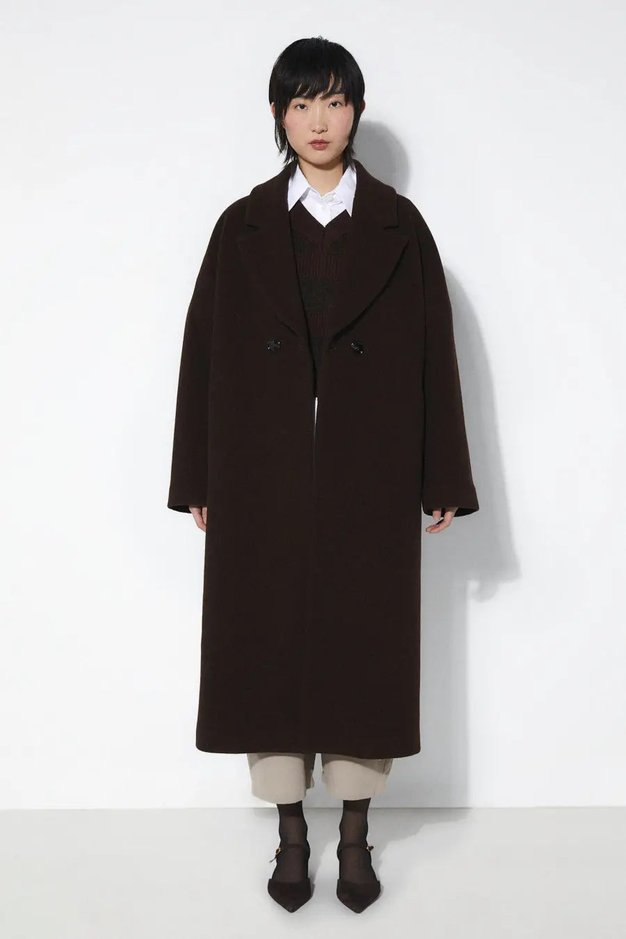 Cappotto Rita Row oversize in panno di lana double-face. Modello sartoriale con collo a rever e chiusura doppiopetto a due bottoni. Tasche laterali. Foderato.