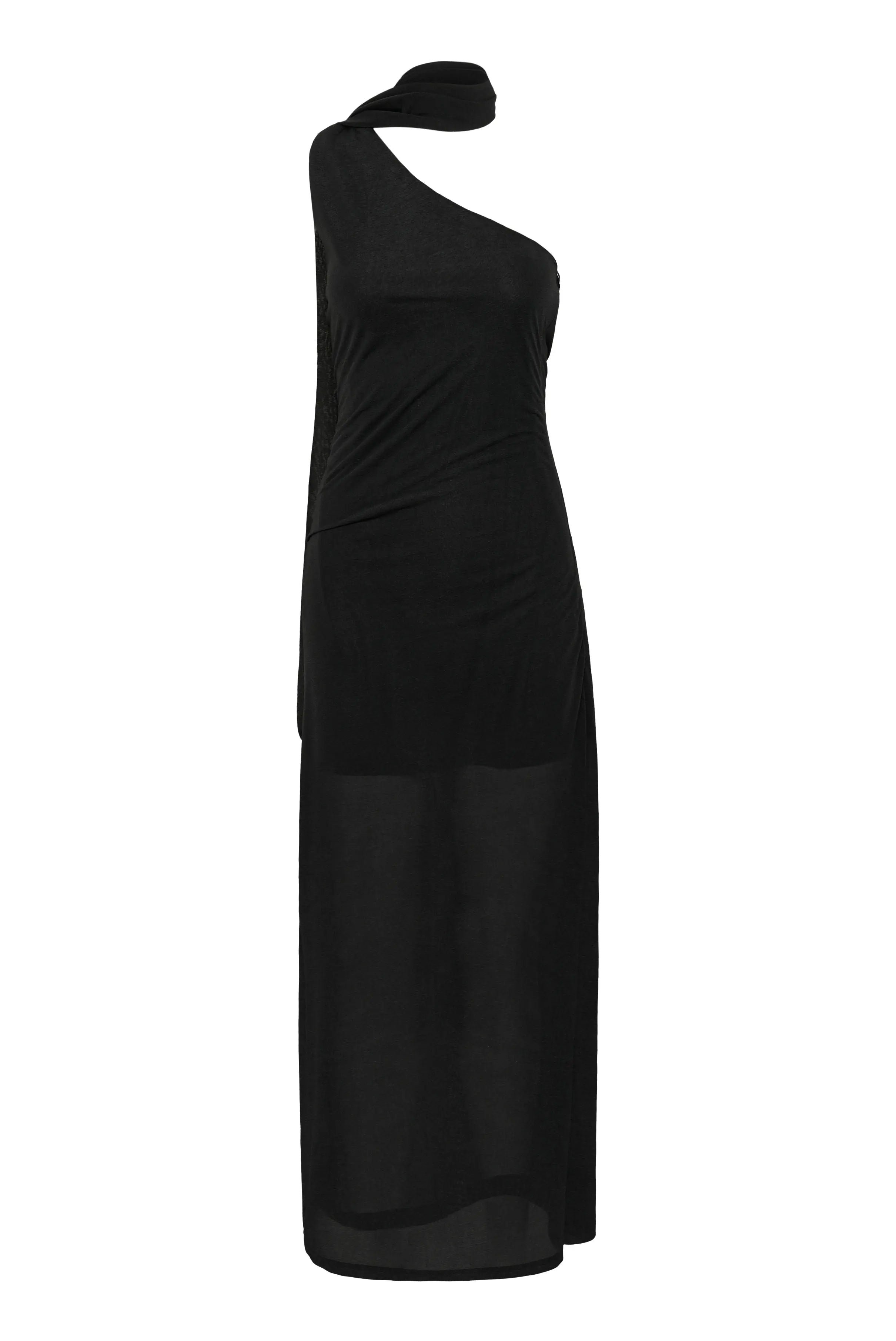 Abito lungo monospalla Gestuz con finitura semitrasparente e foulard allungato al collo. Progettato con vestibilità slim sul corpo, schiena scoperta e gonna dritta lunga fino a terra per una silhouette d'impatto.