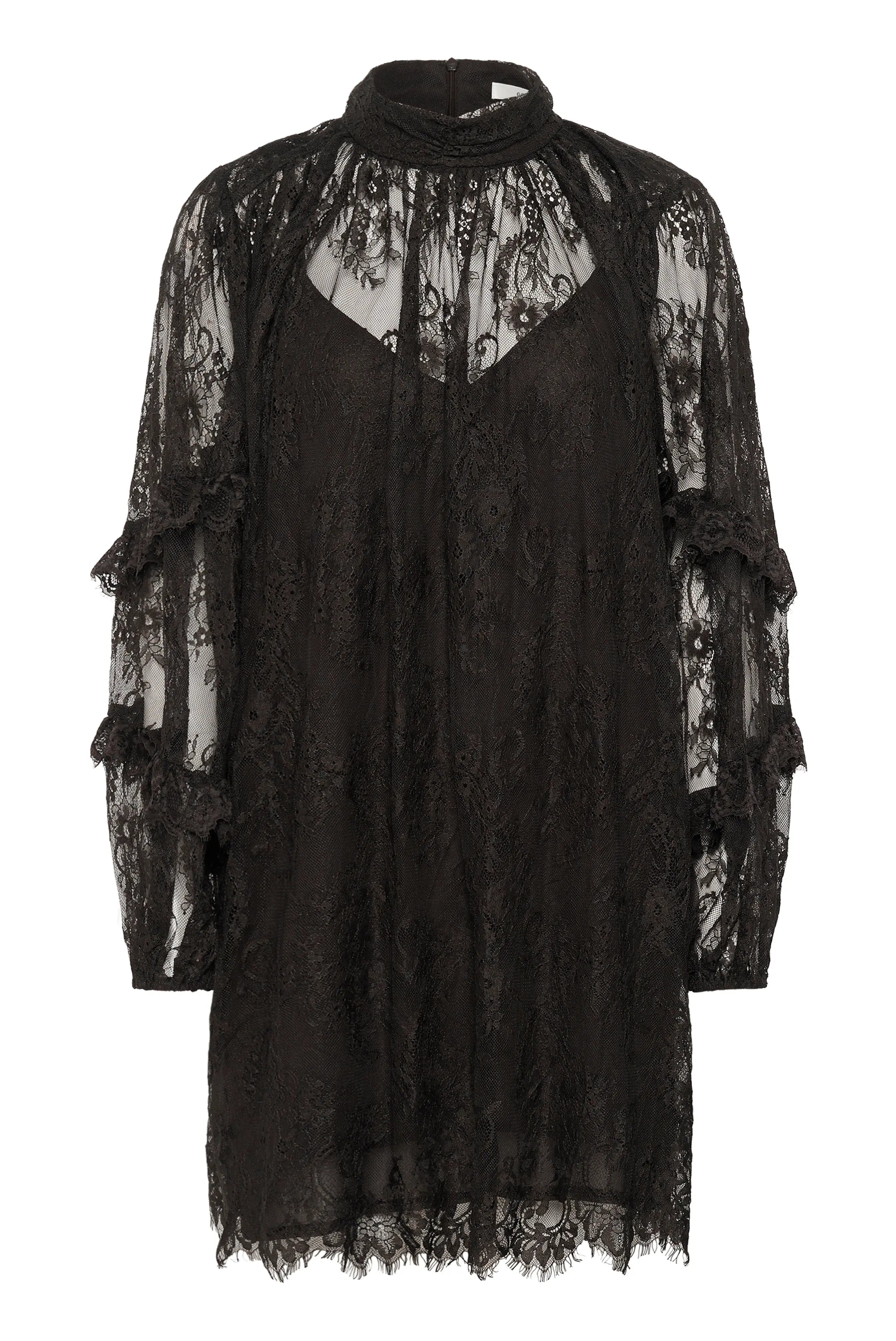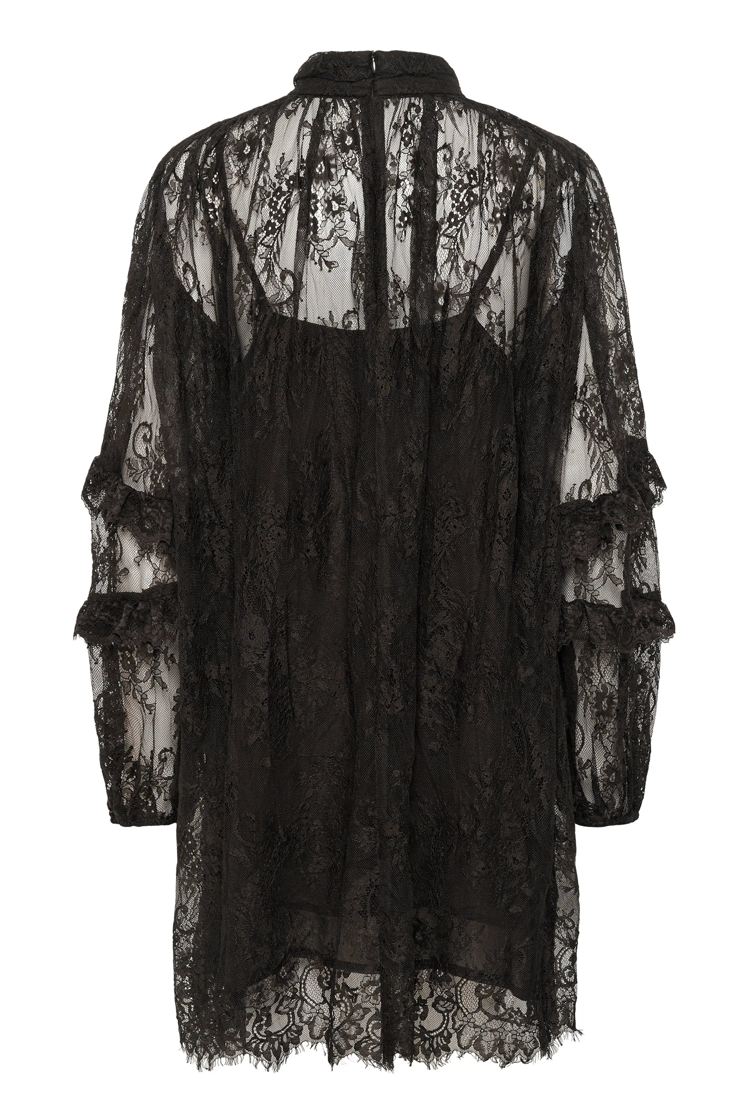 Lace dress with high neckline, long sleeves, and scalloped hem. Designed with delicate gathered details and layered sleeves for a soft, romantic silhouette.