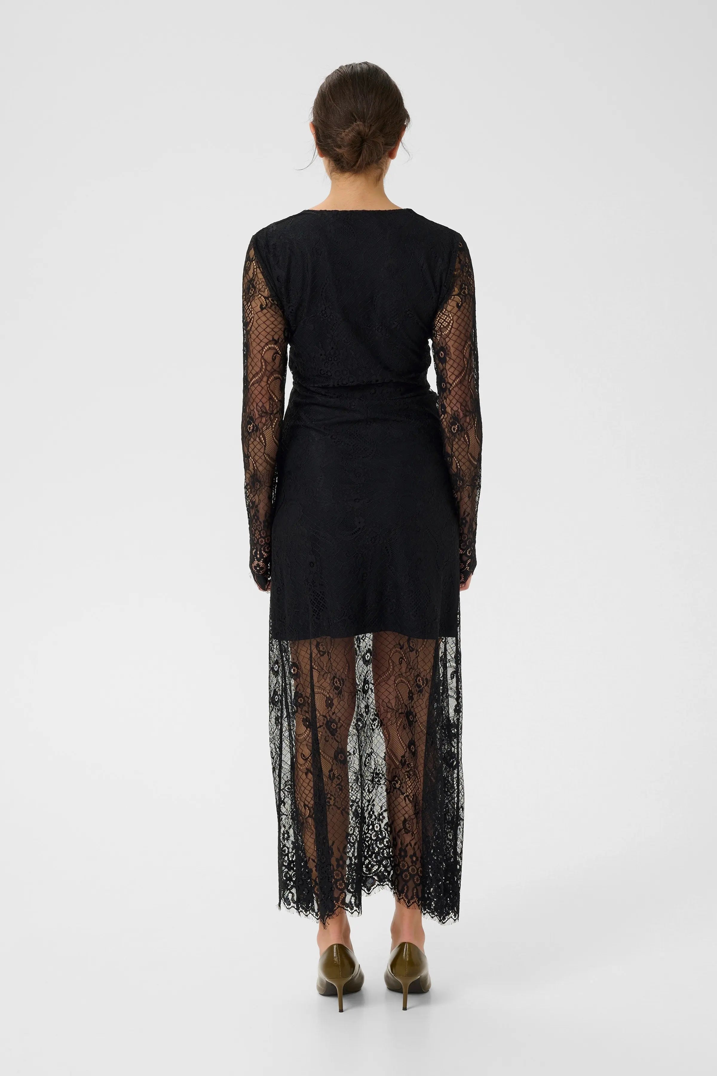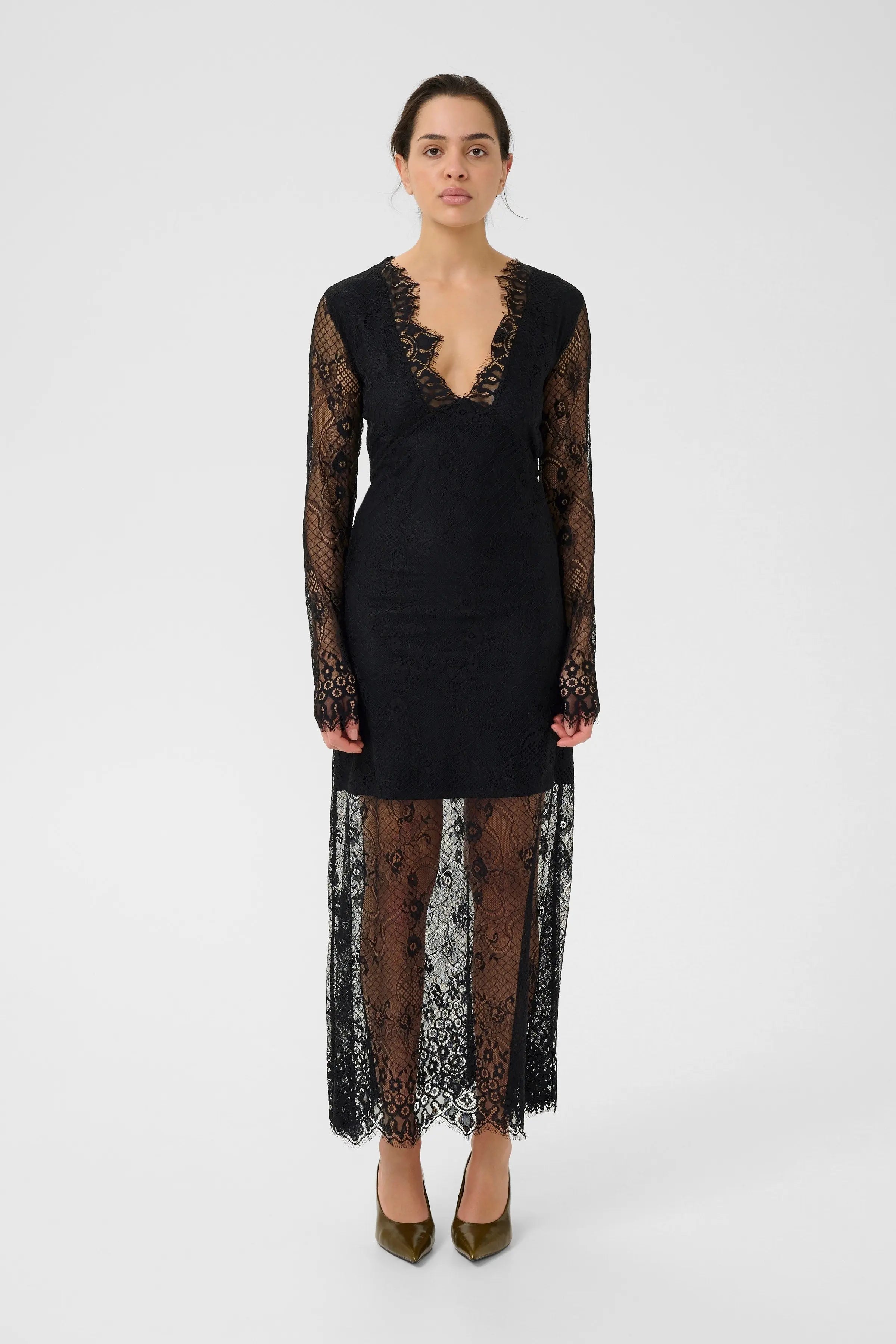 Abito in pizzo a maniche lunghe Gestuz Gzliani con maniche e gonna semitrasparenti. Presenta un profondo scollo a V, bordi smerlati e una silhouette dritta alla caviglia per un look elegante e raffinato.