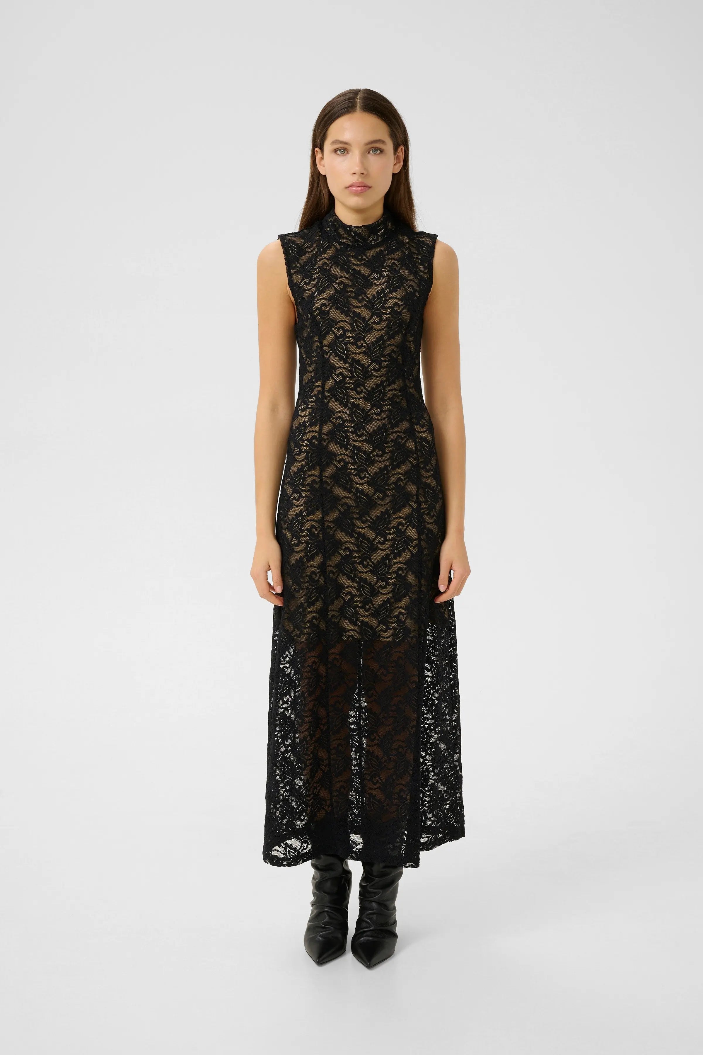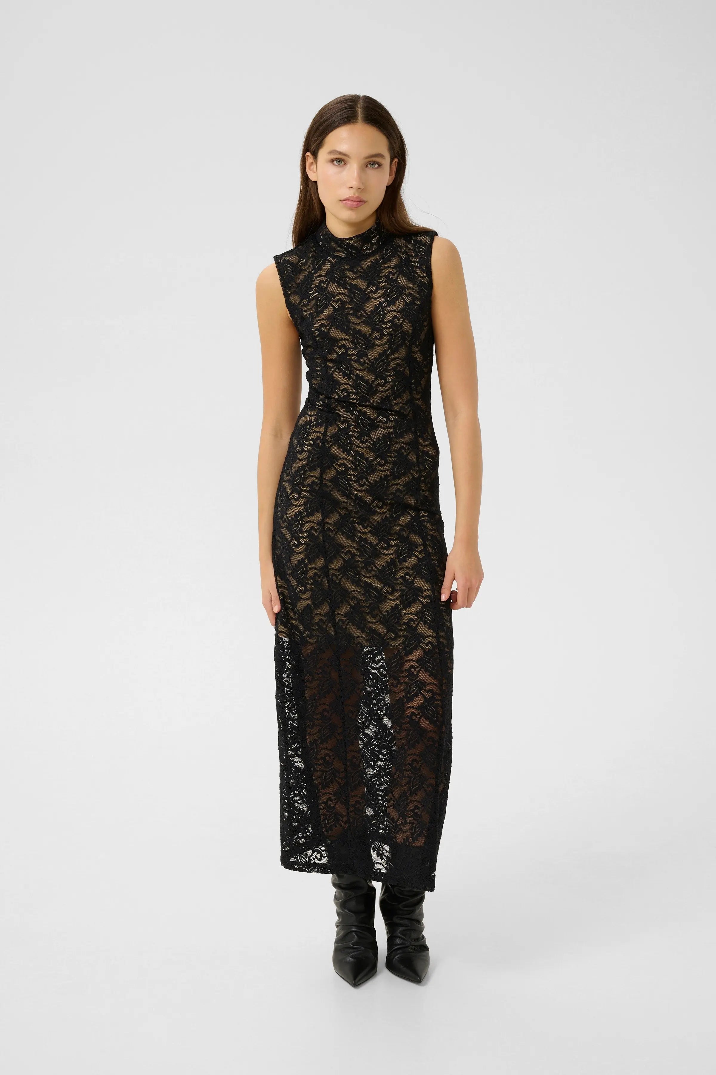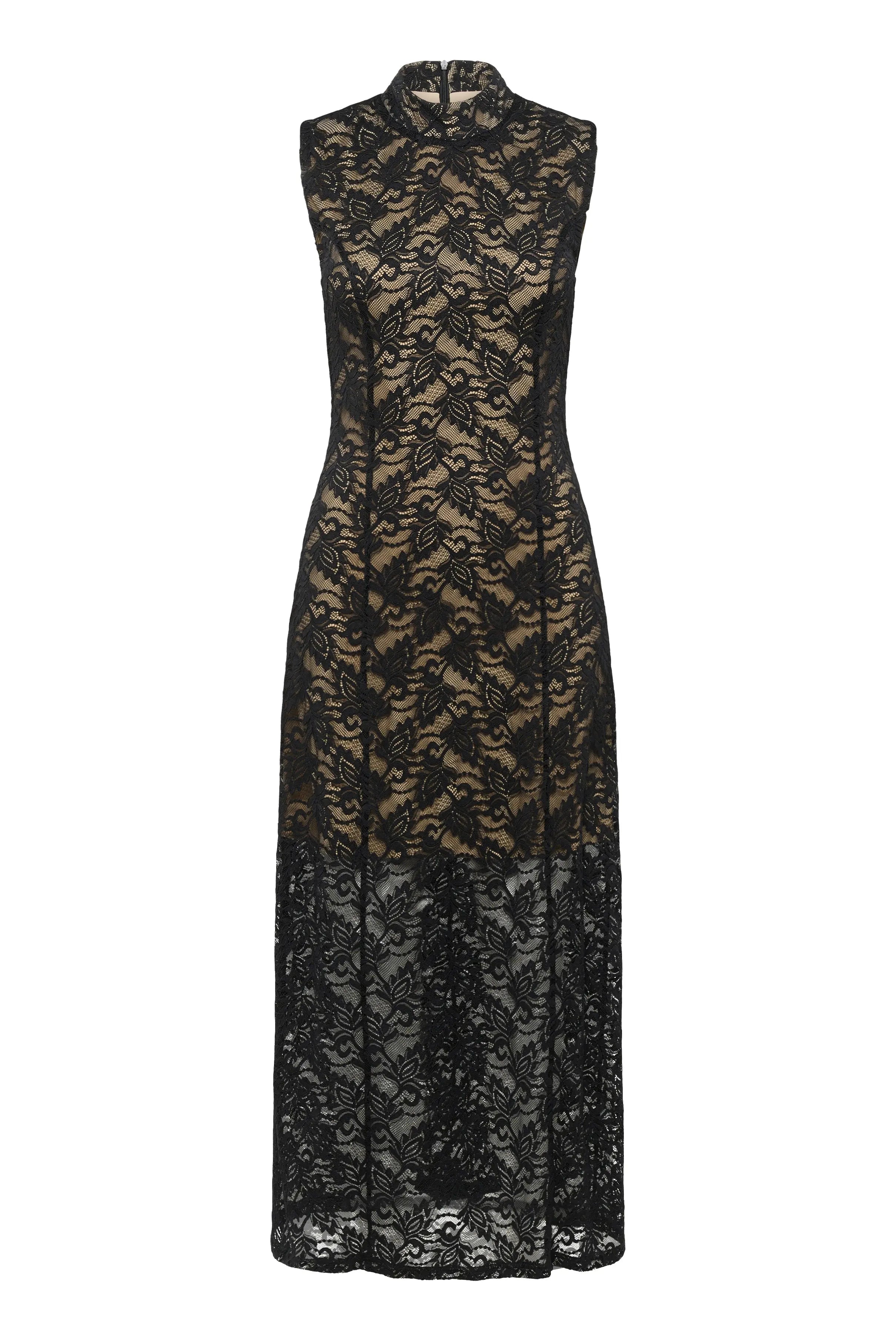 Elegante abito in pizzo smanicato con scollo alto e silhouette aderente che valorizza la figura. Lo strato di pizzo è trasparente, ma l'abito Gestuz include una sottoveste per un look sofisticato e moderno.