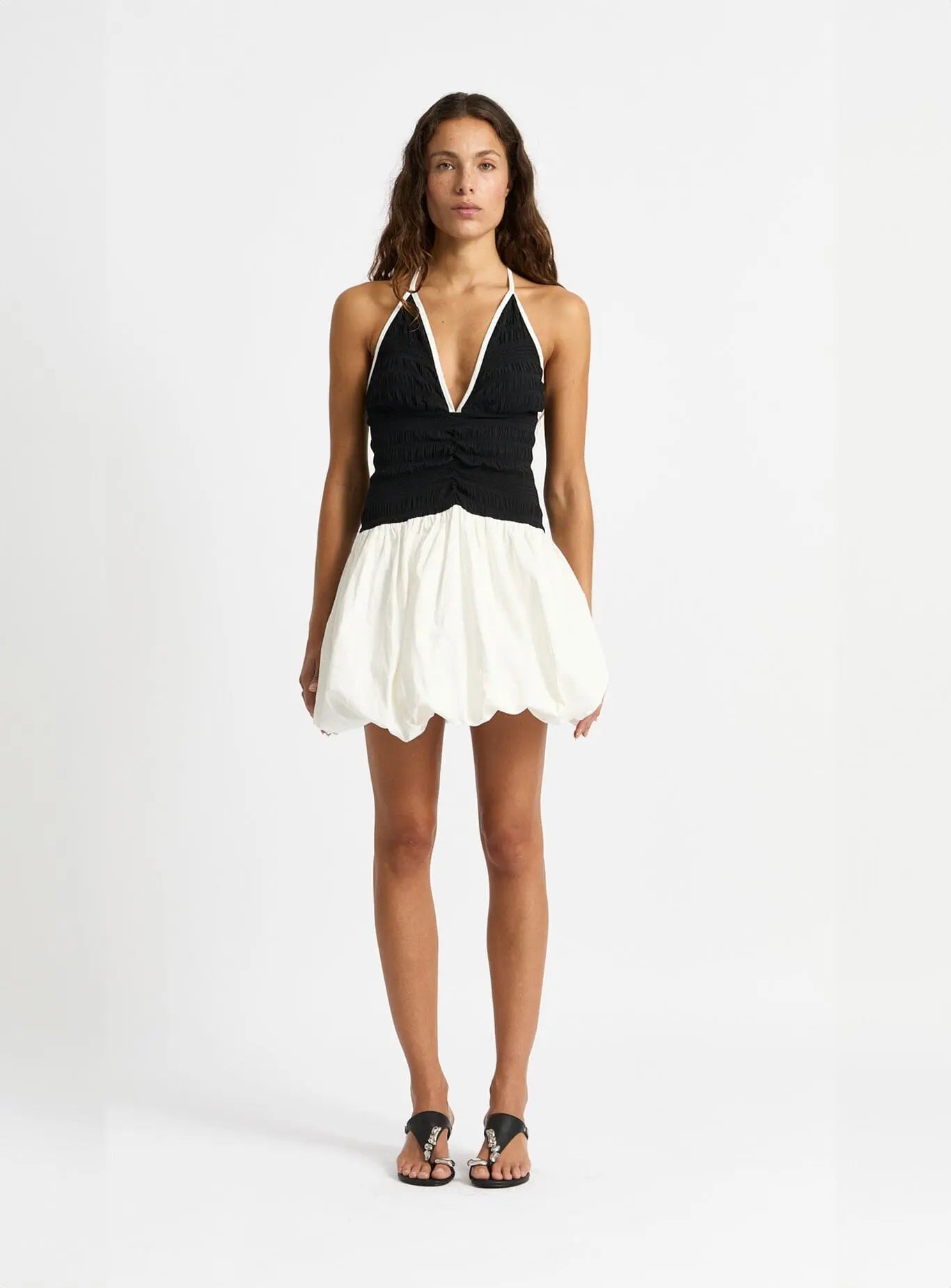 Mini abito corto bicolore Laagam con scollo a V e tessuto nero strutturato, caratterizzato da dettagli piping bianchi. Schiena scoperta e vita aderente per una silhouette valorizzante. La gonna è in stile palloncino arricciato realizzata in tessuto popeline bianco.