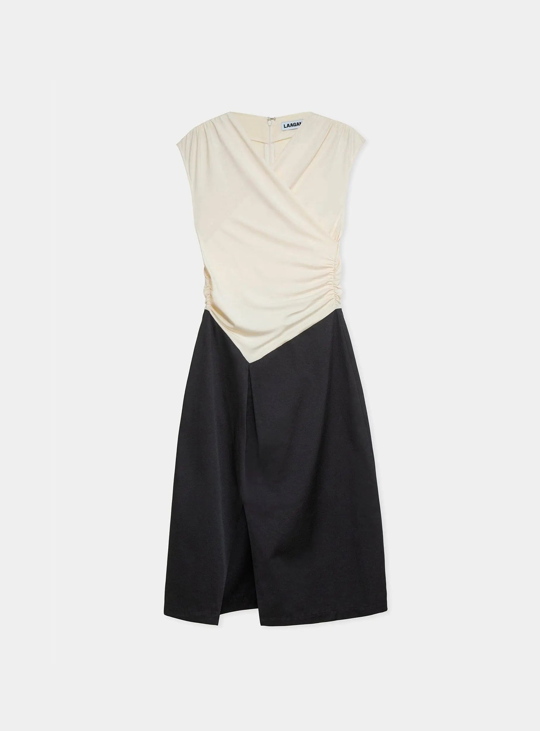 Abito midi Laagam con corpetto elasticizzato e gonna sartoriale. Scollo incrociato drappeggiato e vita drappeggiata. Taglio asimmetrico in vita. Gonna dritta con piega asimmetrica sul davanti e due tasche sul retro. Dettaglio in popeline bianco a contrasto sul fondo. Chiusura con zip invisibile sul retro.