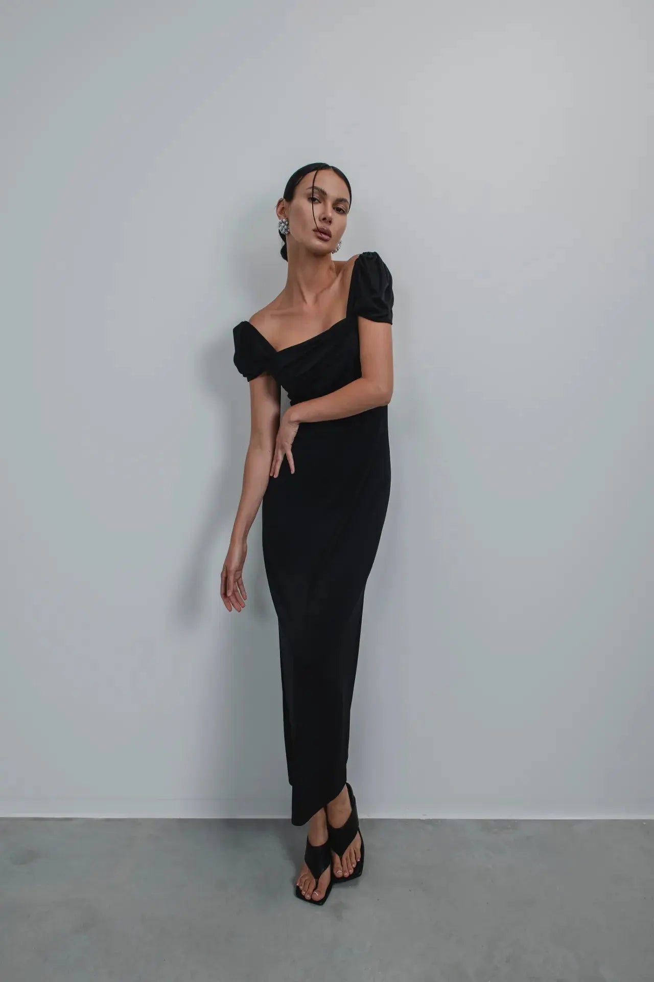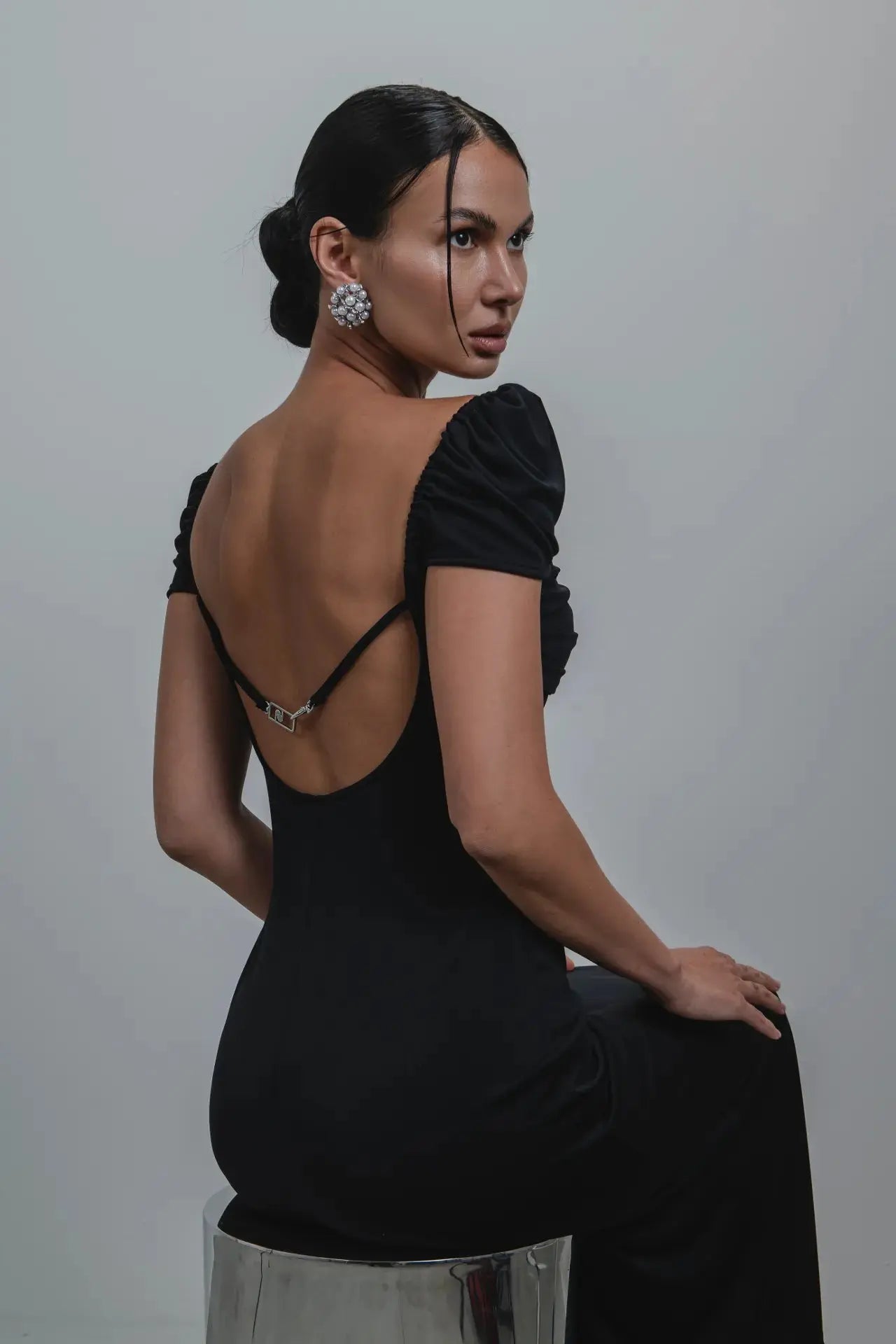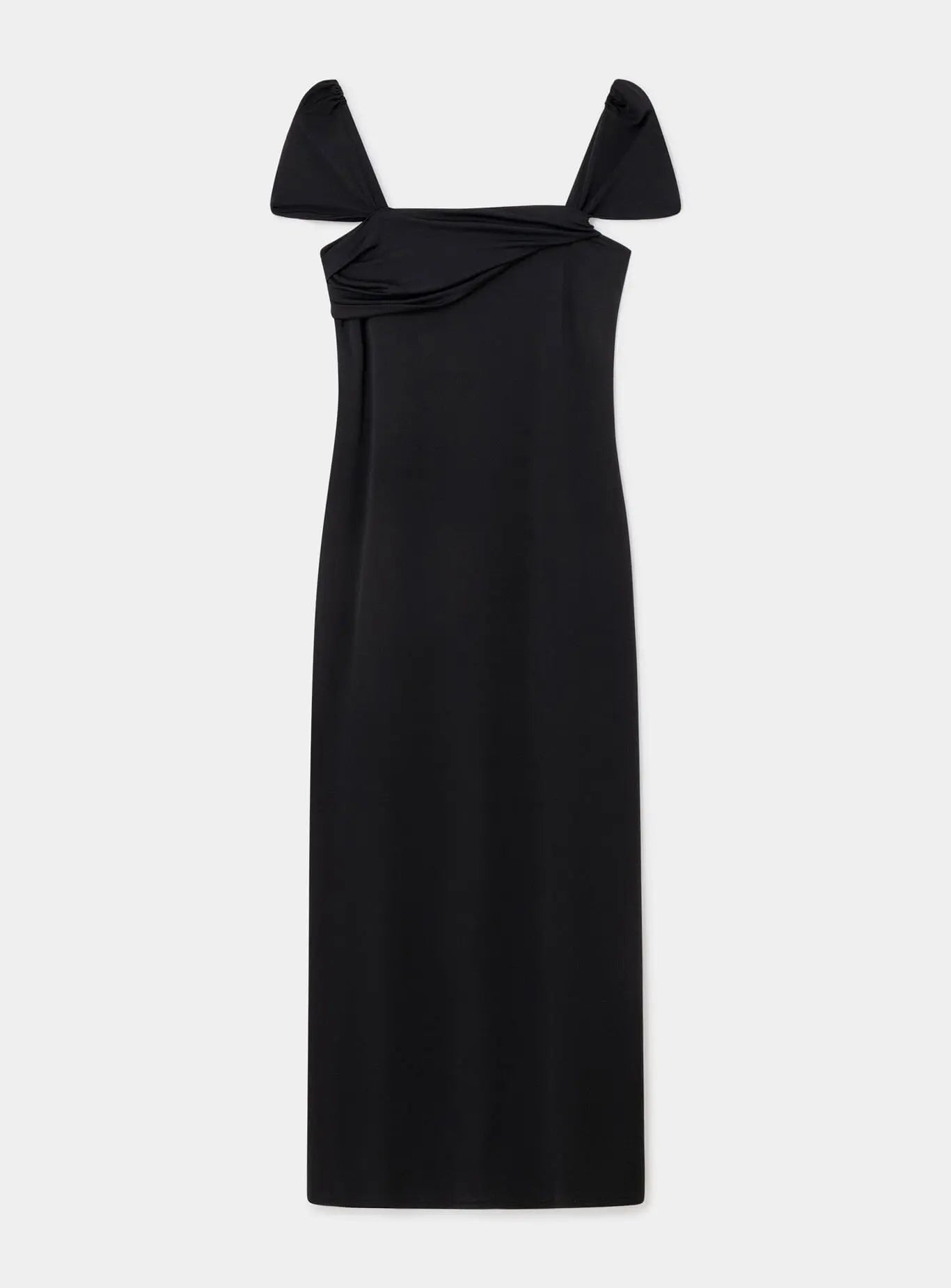 Abito lungo Laagam in jersey con scollatura asimmetrica drappeggiata. Maniche corte drappeggiate. Schiena scoperta con fibbia metallica e logo.