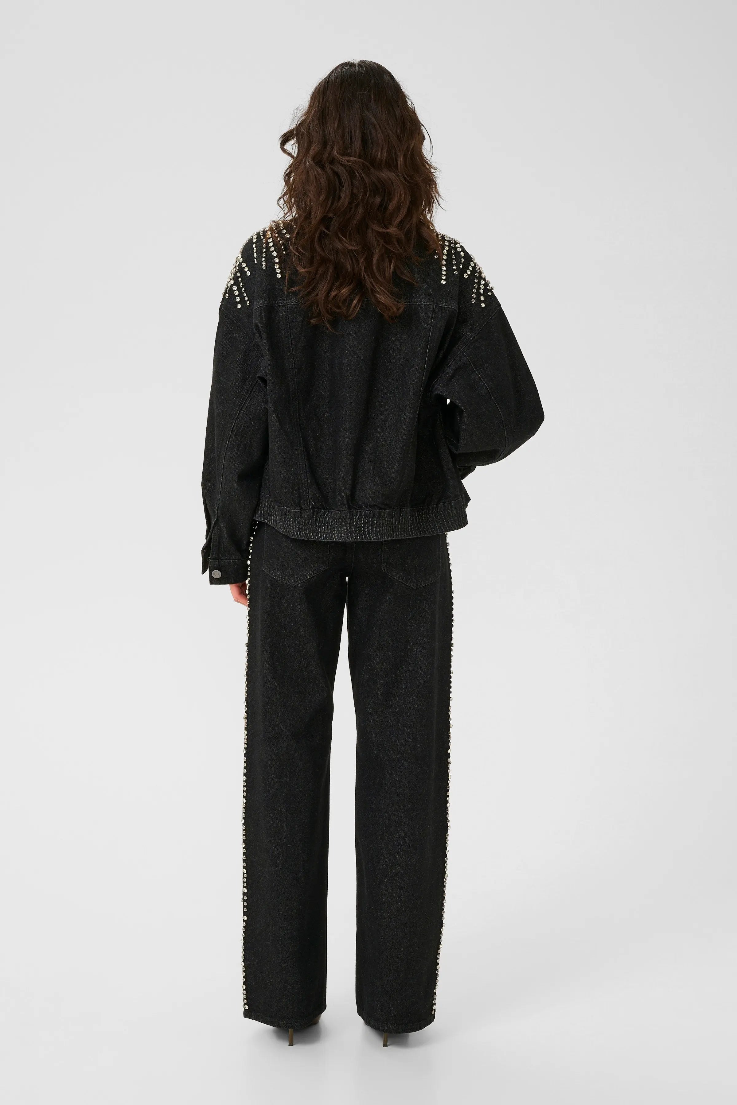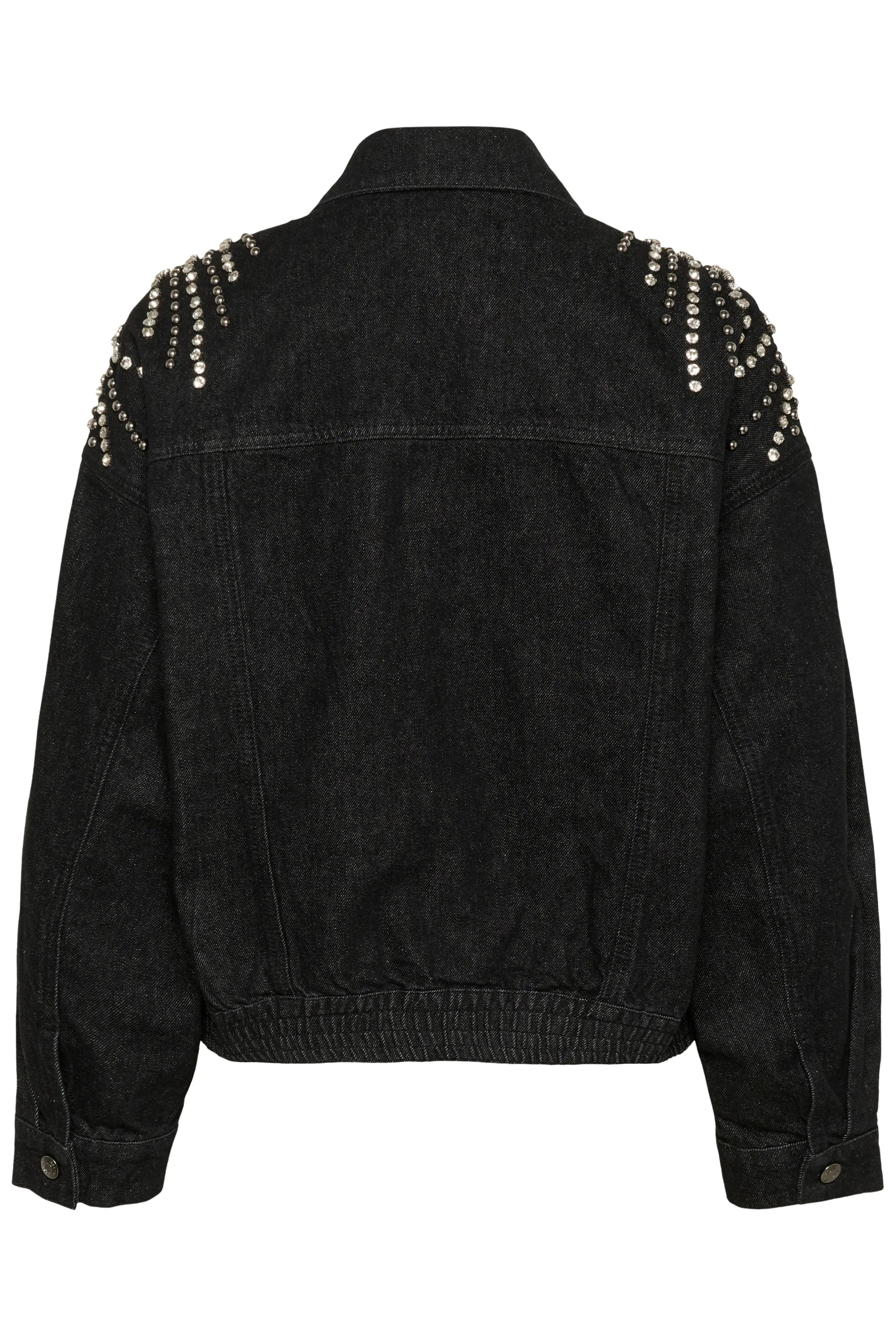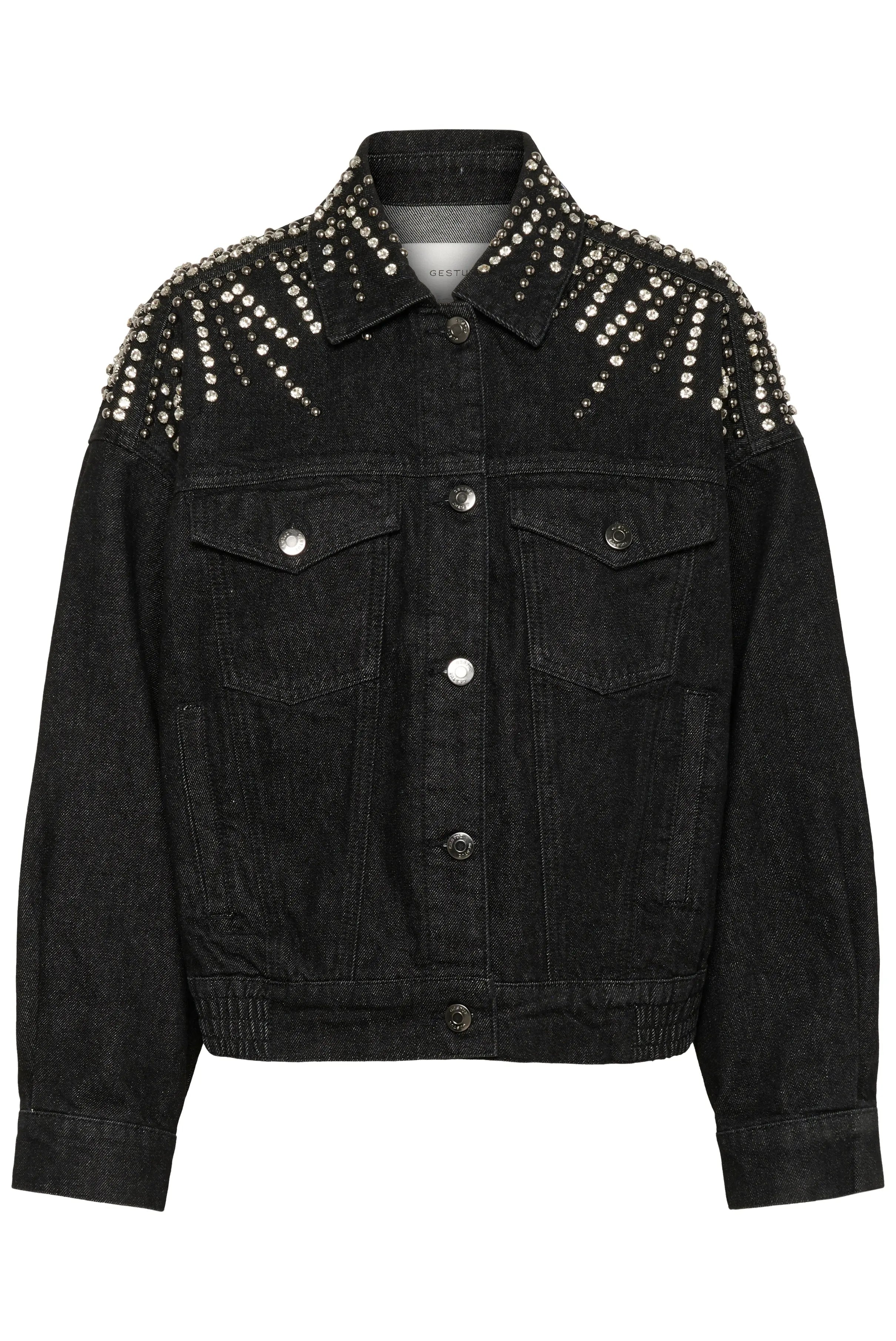 Giacca di jeans Gestuz con vestibilità dritta e colletto classico. Decorata con strass su spalle e colletto per un look audace e d'impatto.