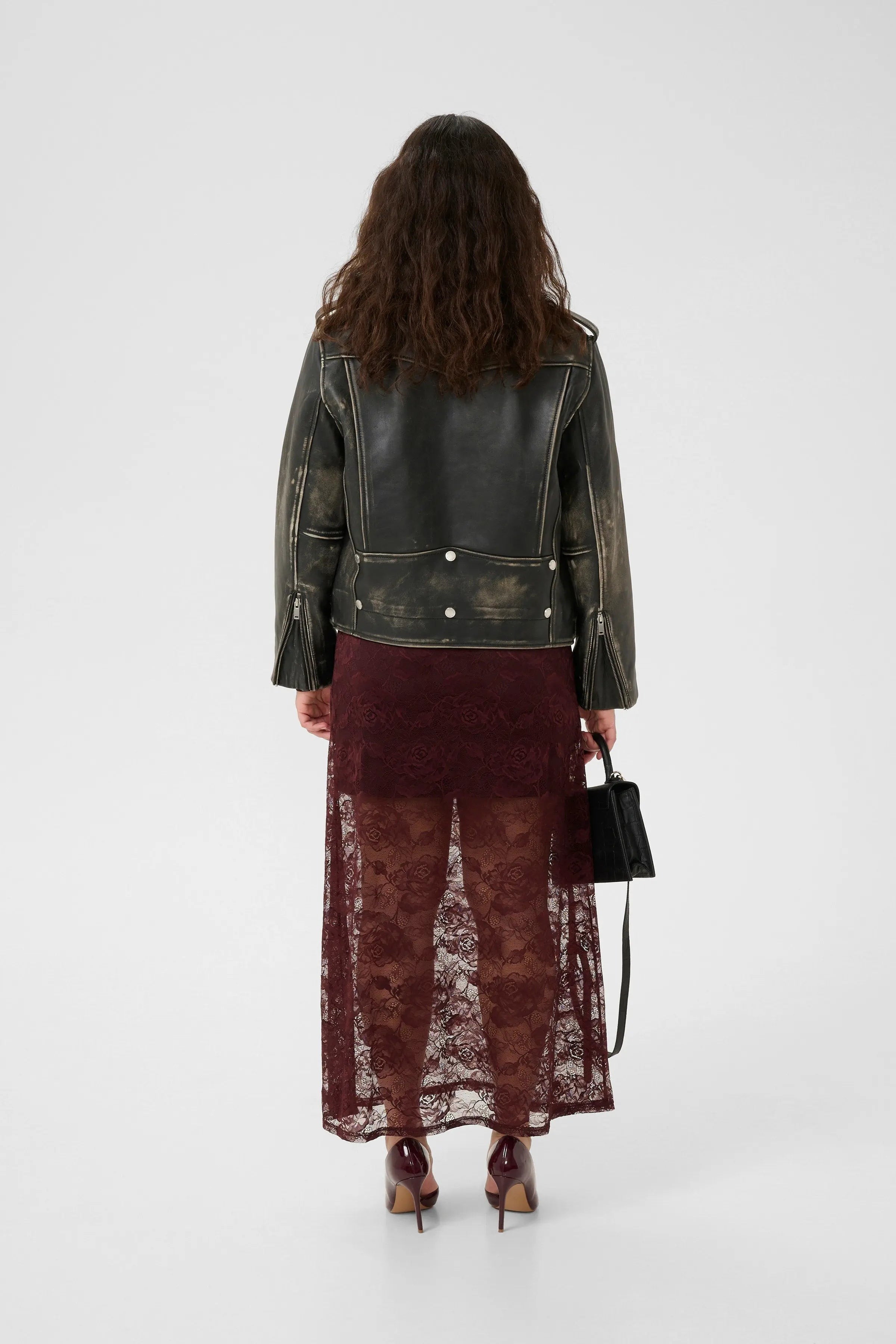 Giacca biker Gestuz in 100% pelle con finitura invecchiata. Disegnata con zip frontale asimmetrica, tasche con zip e bottoni, e cintura regolabile in vita.