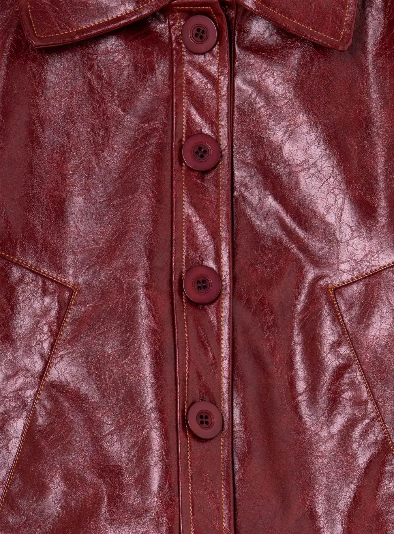 Giacca corta Laagam bordeaux in pelle vegana con cuciture a contrasto. Collo a revers e maniche lunghe. Due tasche laterali. Chiusura frontale con bottoni.