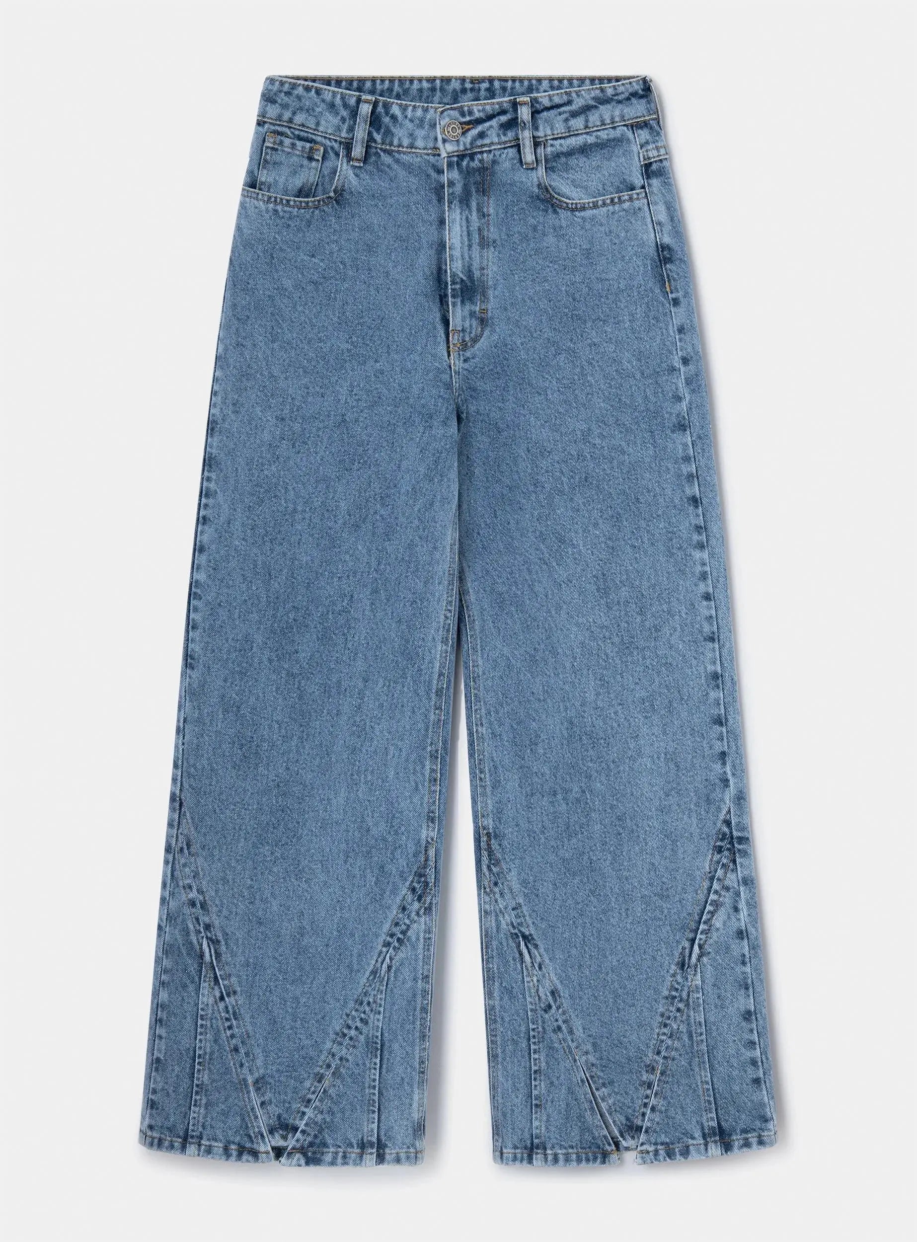 Jeans a vita media con cinque tasche. Effetto sbiadito. Vestibilità gamba ampia. Dettaglio spacco sugli orli. Chiusura frontale con zip e bottone in metallo.