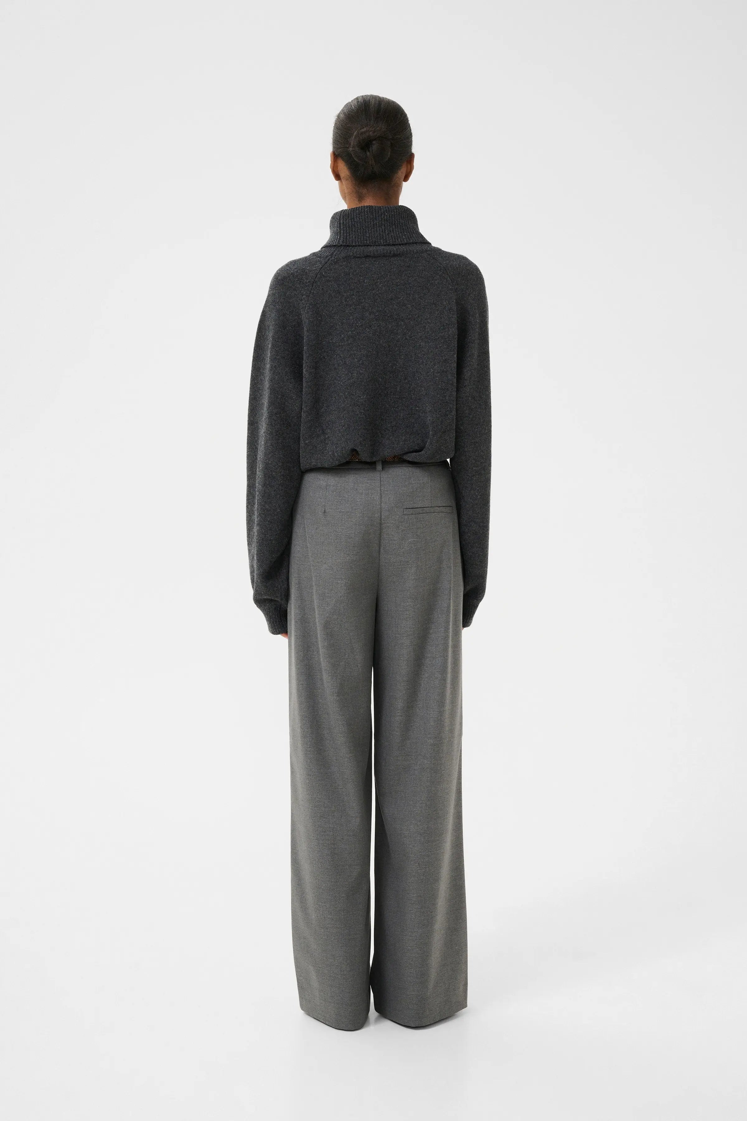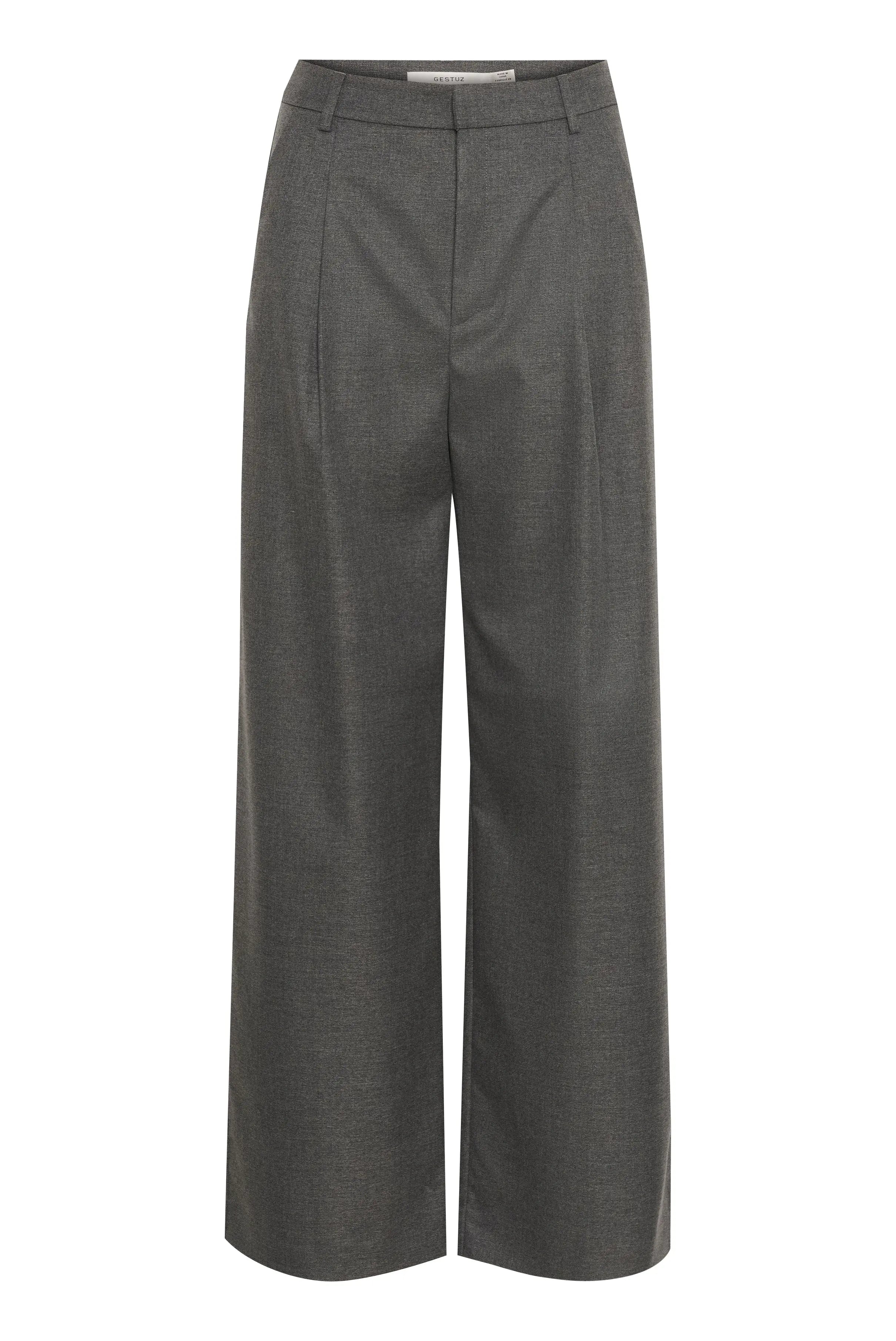 Pantaloni Gestuz Gzpaula grigi. Questi pantaloni sartoriali a gamba larga presentano morbide pieghe frontali, vita media e passanti per cintura per uno styling adattabile. Rifiniti con tasche laterali e una pulita tasca posteriore a filetto per un look smart e quotidiano.