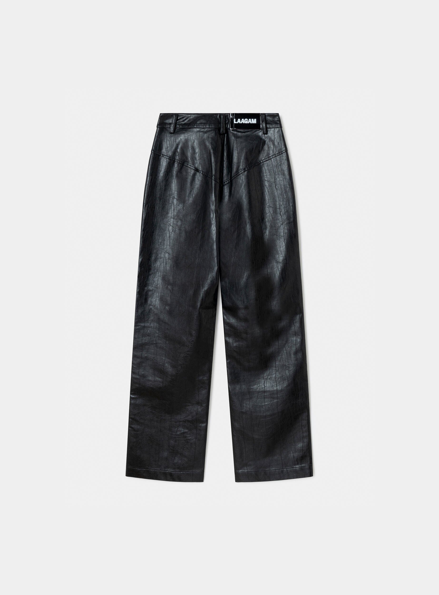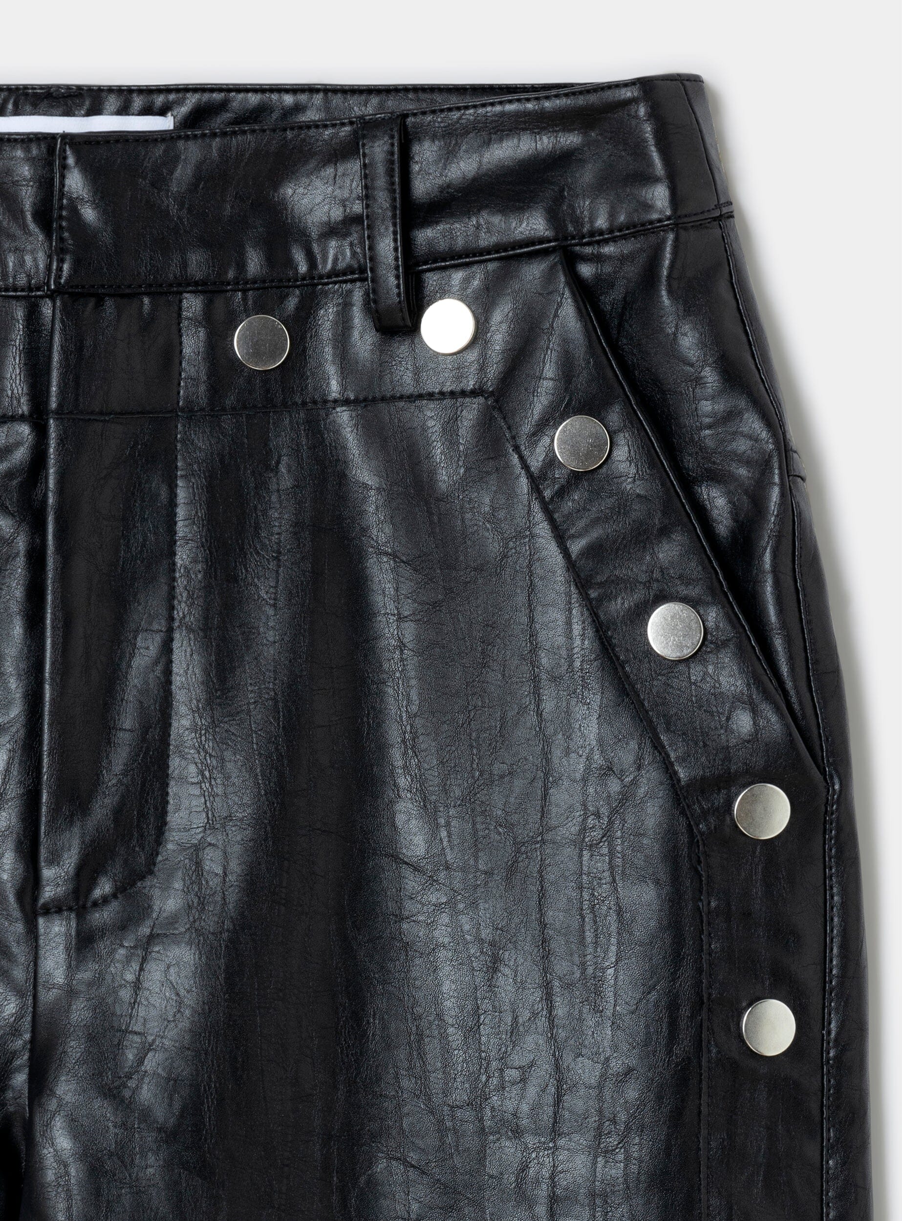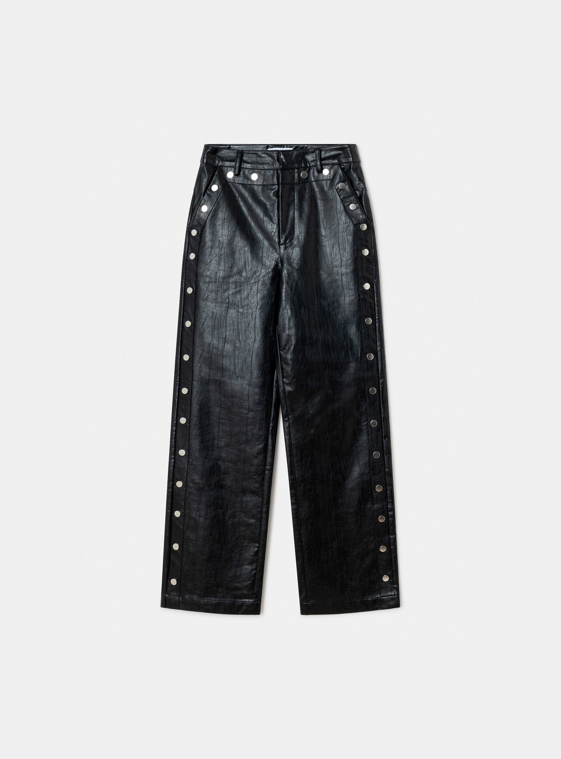 High-waist faux-leather pants featuring wide-leg fit. High waistband with belt loops and front fly closure. Metallic snap buttons design in front, under waist and in both sides. Side pockets on front and curved seams with stitchings on back.