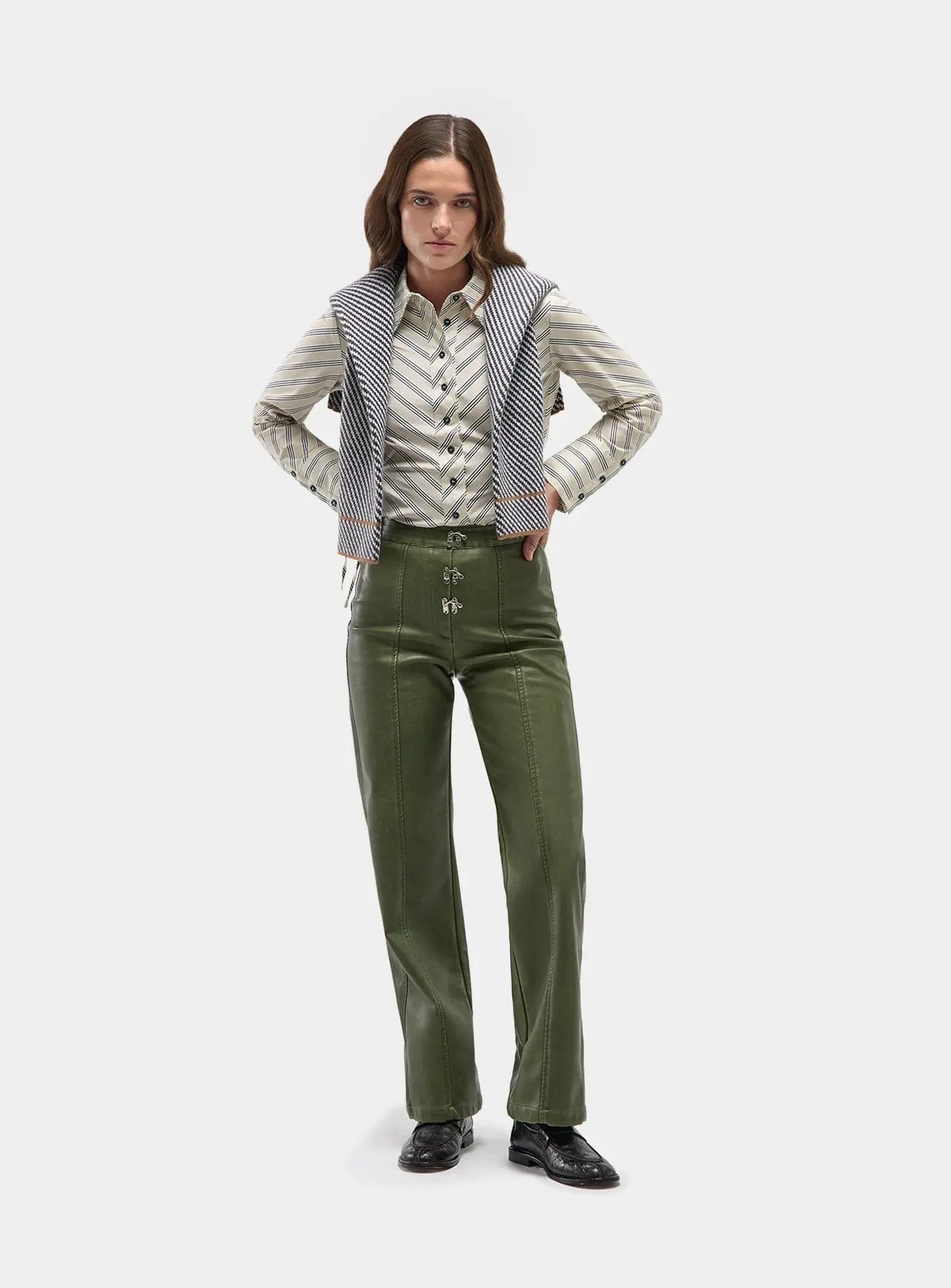 High-waist faux leather long pants with metallic trims details in fly. Invisible zip fastening. Straight-leg fit.
