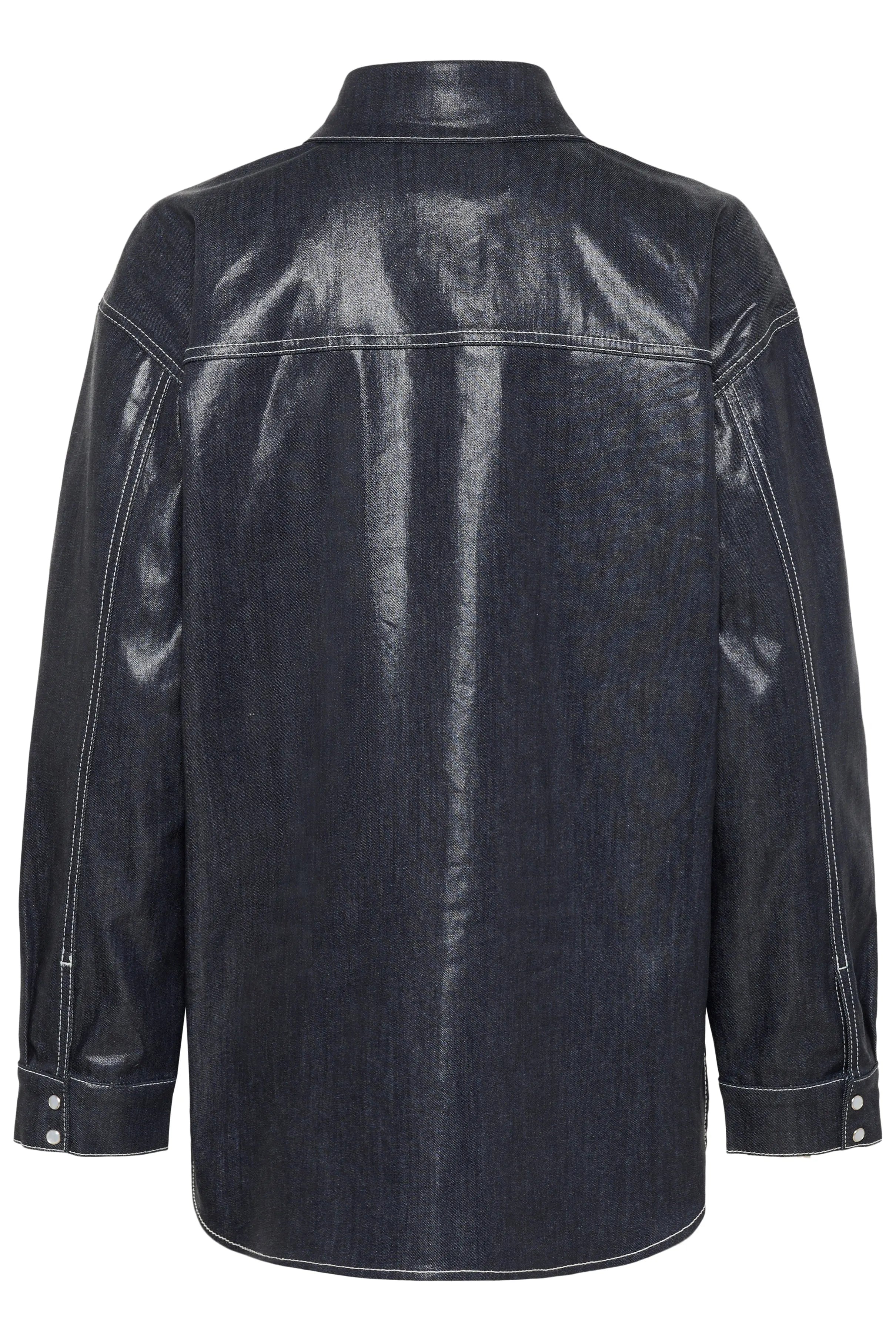 Camicia Gestuz in denim spalmato leggermente oversize con colletto a punta, chiusura con bottoni a pressione e tasche sul petto. La silhouette strutturata e la finitura lucida creano un look elegante e raffinato.