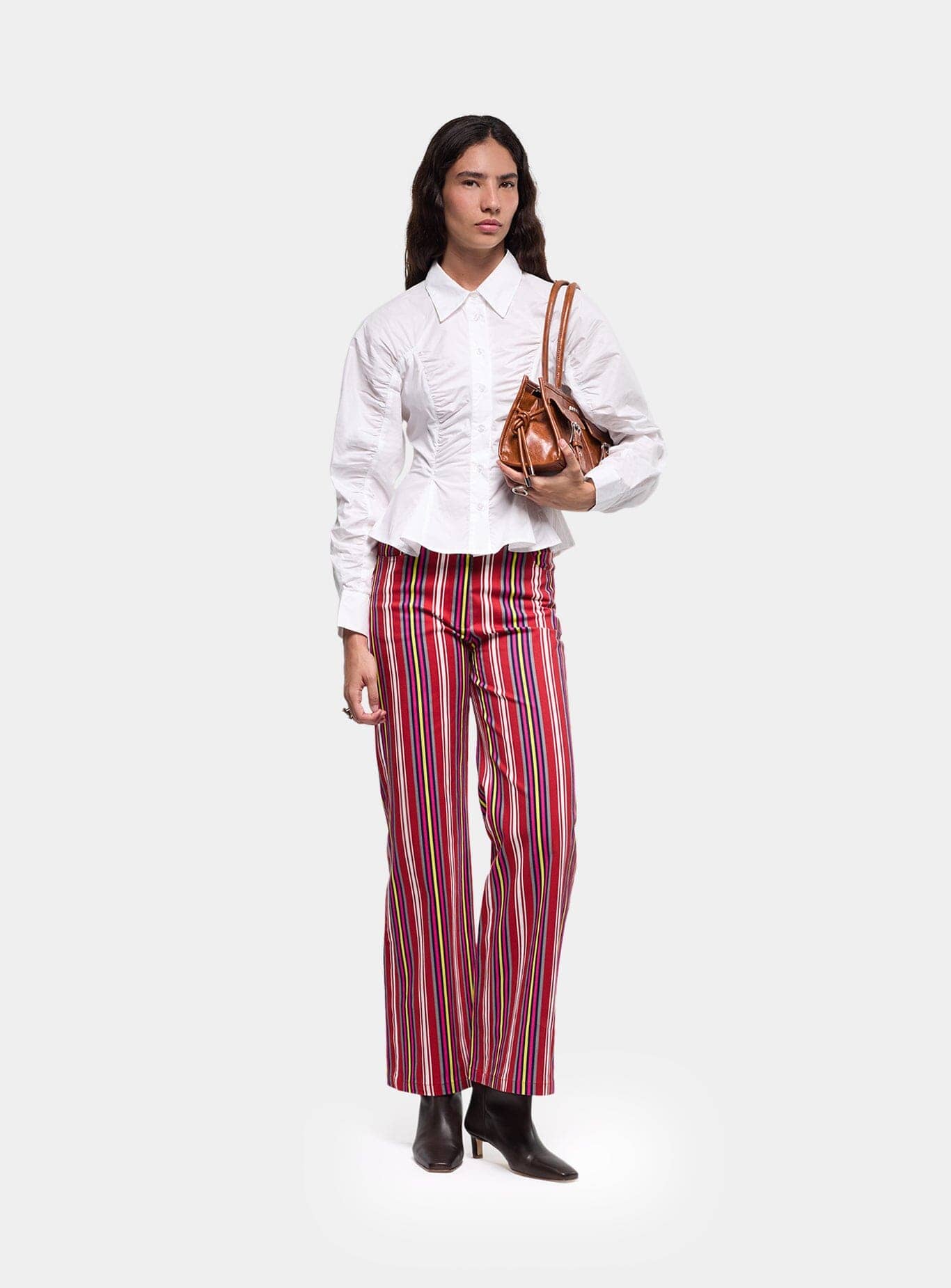 Long volume sleeves poplin shirt. Ruched seams along sleeve and body, both in front and back. Button-up closure. Flare pieces details in dusts and cuffs.