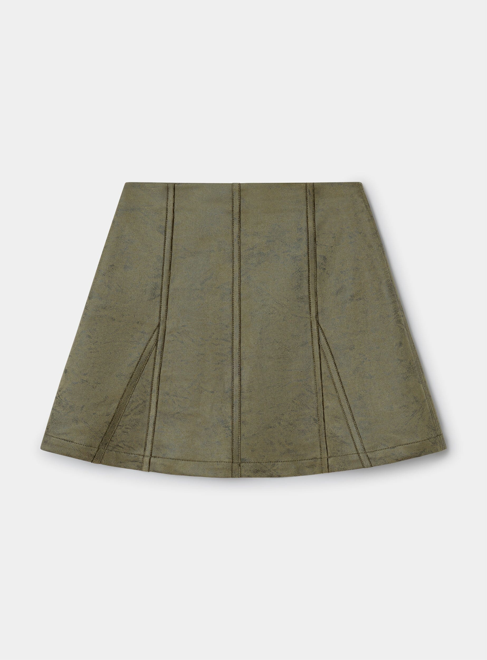 High-waist suede short skirt with piping details on seams and flare shape. Back closure with invisible zipper.