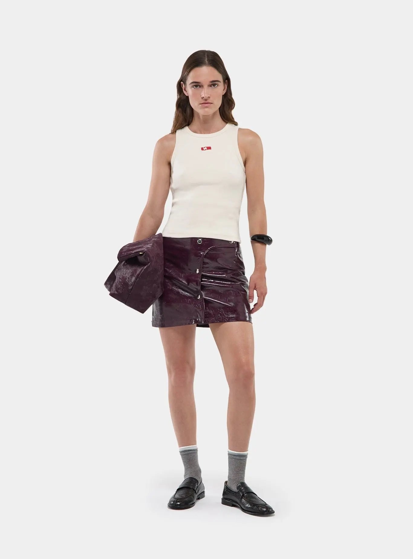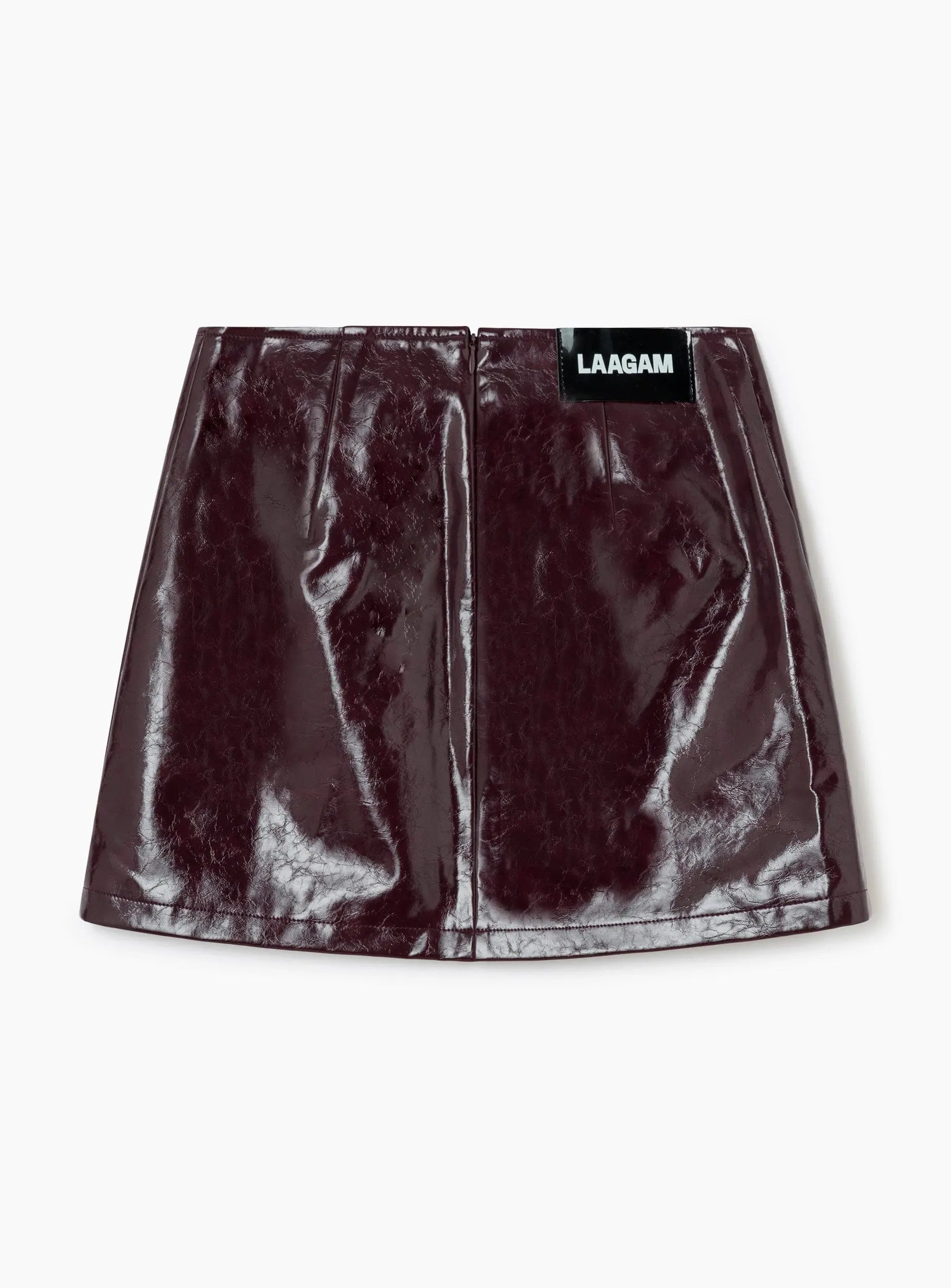 Gonna corta Laagam a vita alta in ecopelle con chiusura frontale asimmetrica e bottoni a pressione argento metallizzato. Chiusura posteriore con cerniera invisibile. Fodera nera.