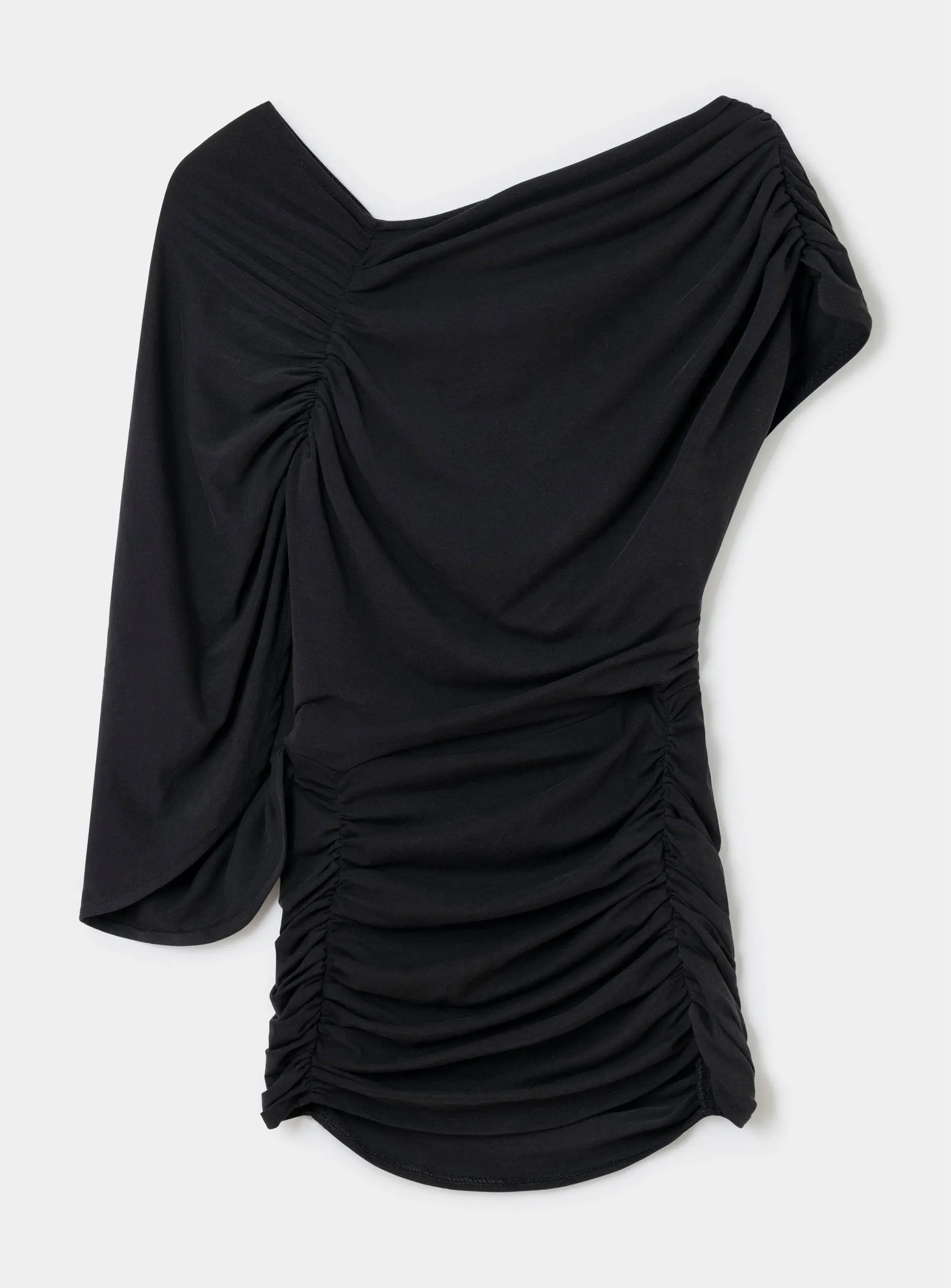 Asymmetric draped top. Fitted silhouette. Draped neckline piece in one side and sleeve piece in the other, from shoulder to back. Open back. Draped waist piece with draped side pieces.