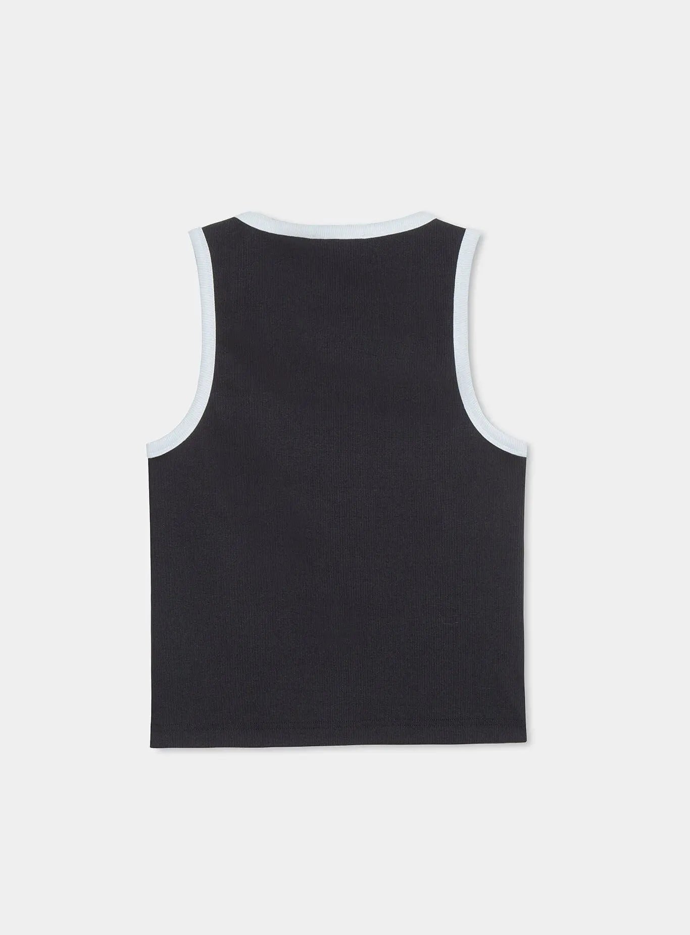 Top nero Laagam Kelsi realizzato in leggero cotone a costine. Bordo bianco a contrasto su scollo e giromanica. Design aderente senza maniche, con scollo rotondo e logo ricamato sul davanti. Vestibilità stretta. Lunghezza normale.