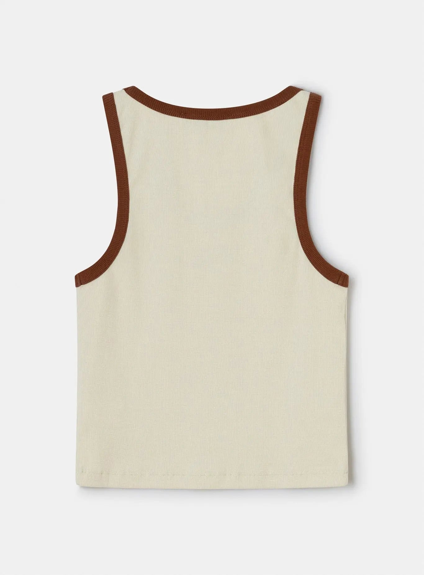 Top Laagam smanicato ecru in leggero cotone a costine. Presenta una costina marrone a contrasto su scollo e giromanica. Design aderente con scollo rotondo e logo ricamato sul davanti. Vestibilità stretta. Lunghezza standard.