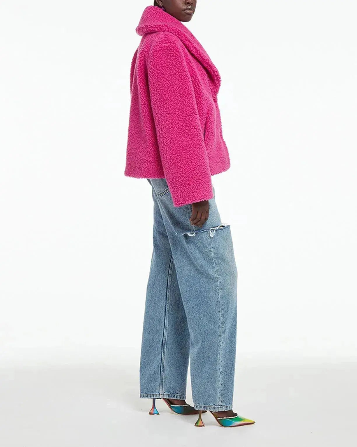 Apparis faux fur teddy jacket. True to size. Snap closure. Shawl collar. Wide sleeves. Slash pockets. Signature rainbow print lining.