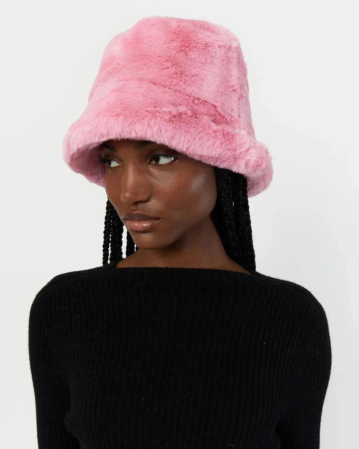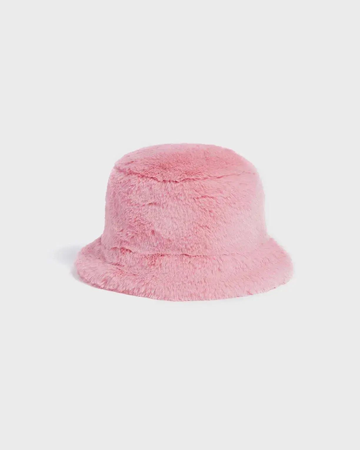 Plant Based fur bucket hat. Faux suede interior. Circumference: 23 inches.