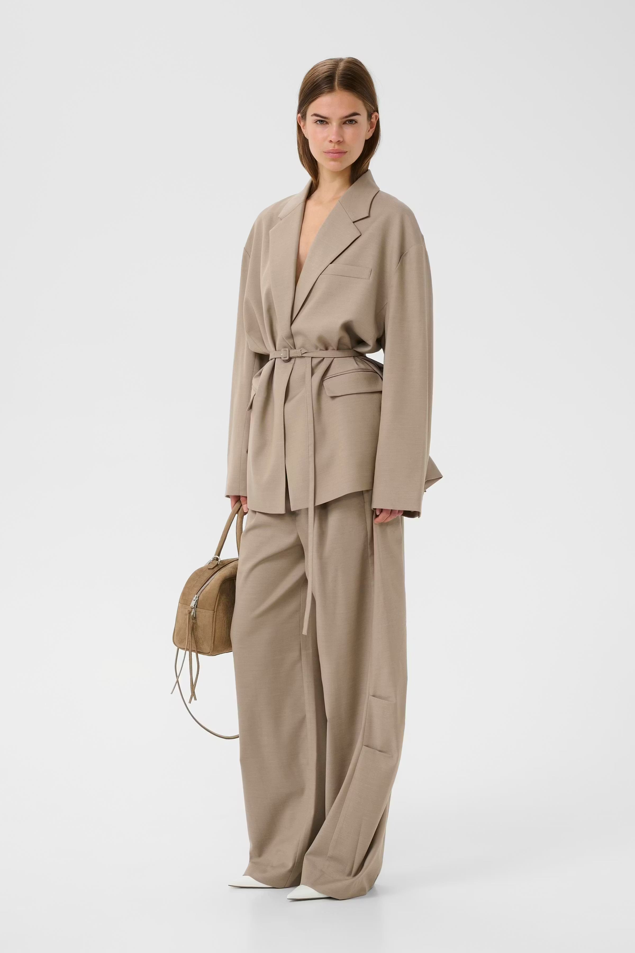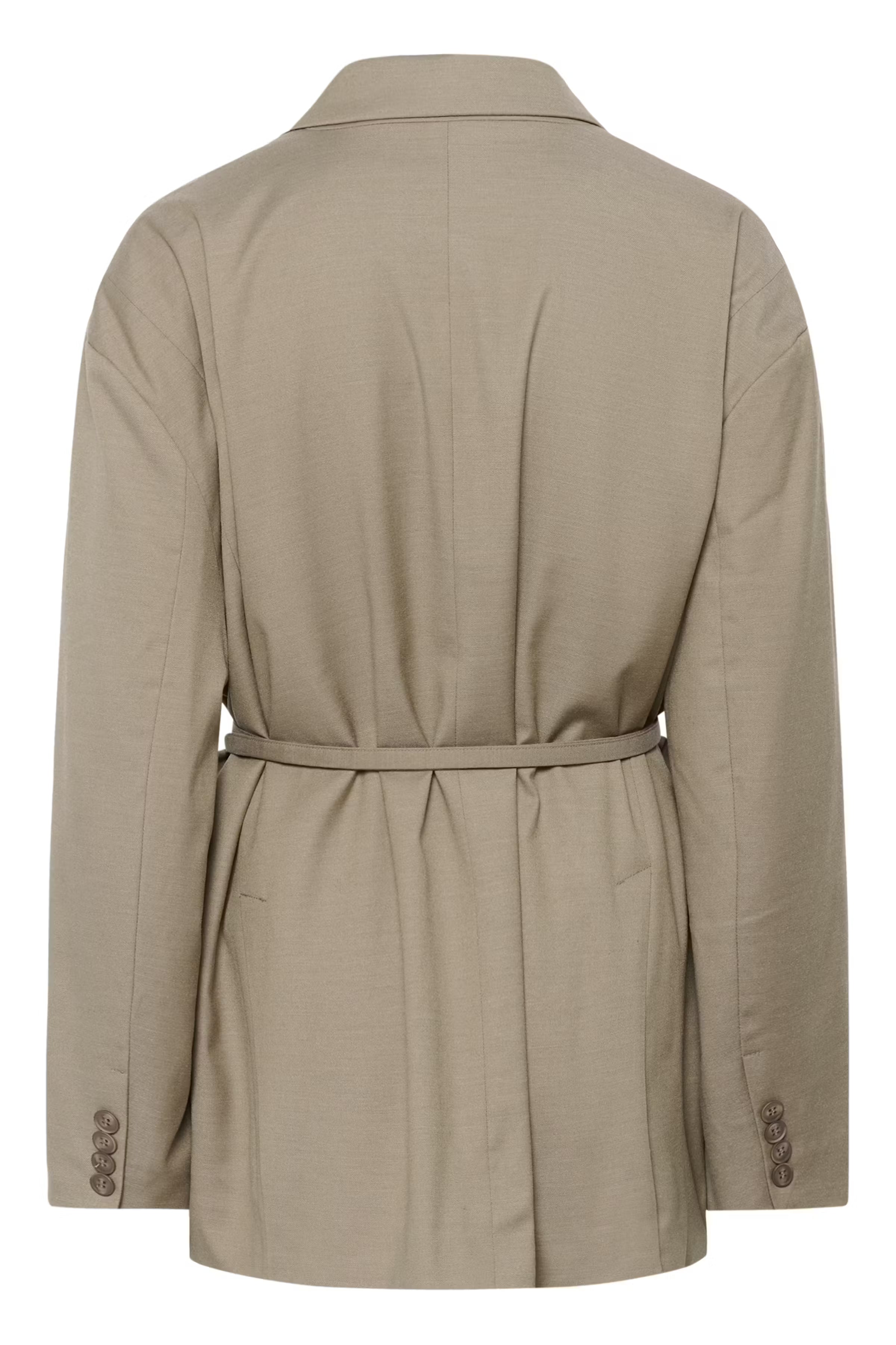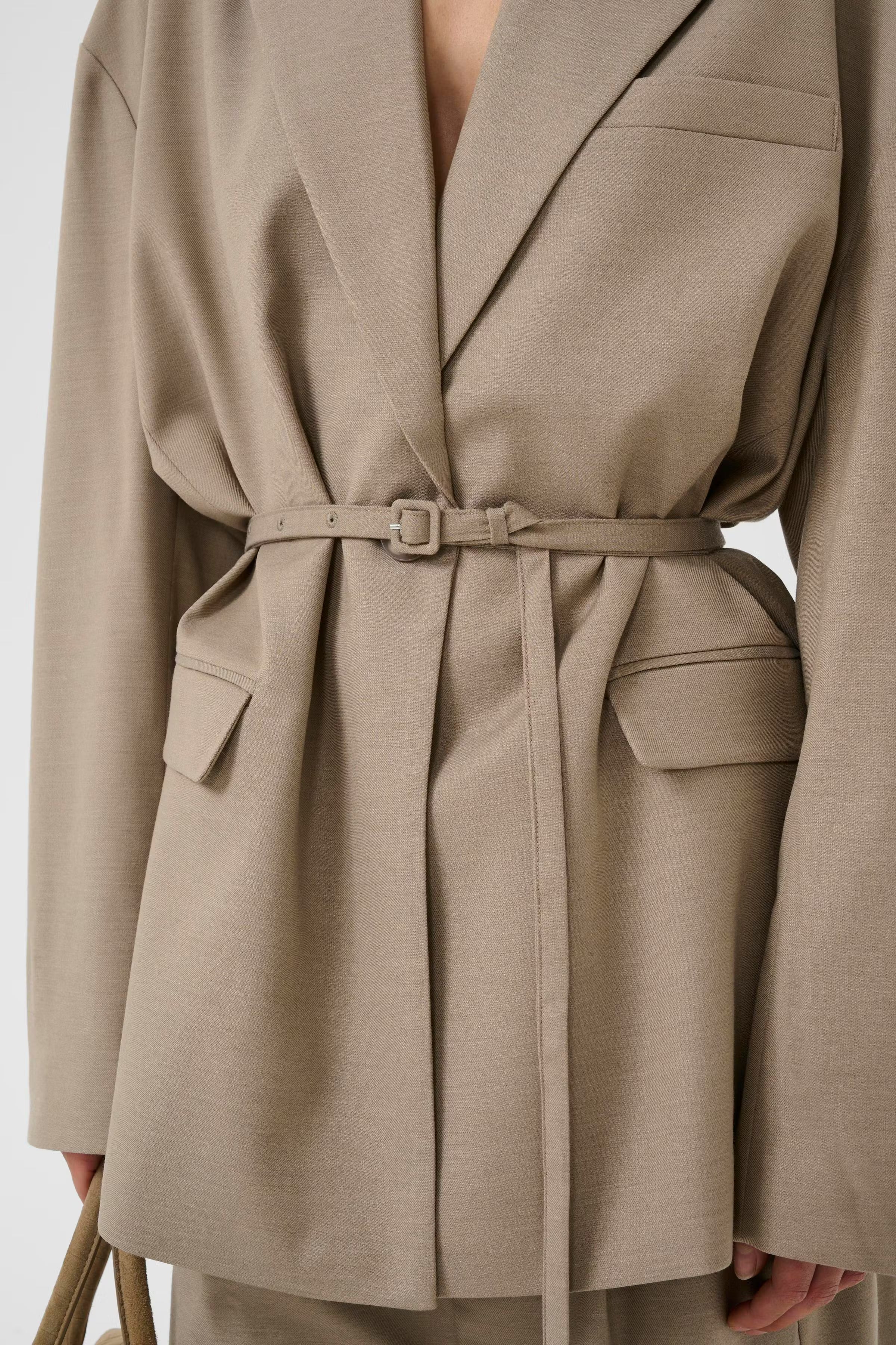 This tailored blazer features a relaxed silhouette, notch lapel, and adjustable waist belt for versatile styling. Designed for comfort and ease, it suits both business and casual occasions with functional pockets and long sleeves. Hidden elastic at cuff. Thin detachable double wrap belt.