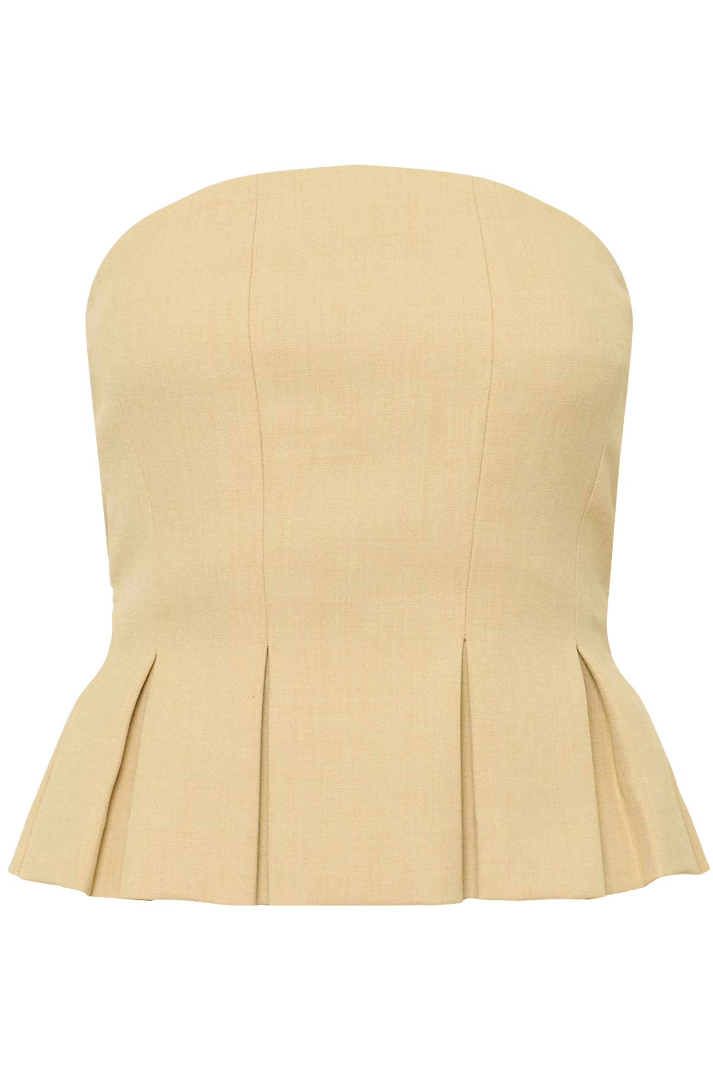 This strapless top features a tailored fit, structured silhouette, and pleated hem detail. Perfect for versatile styling, its clean design and comfortable cut enhance both casual and formal looks.