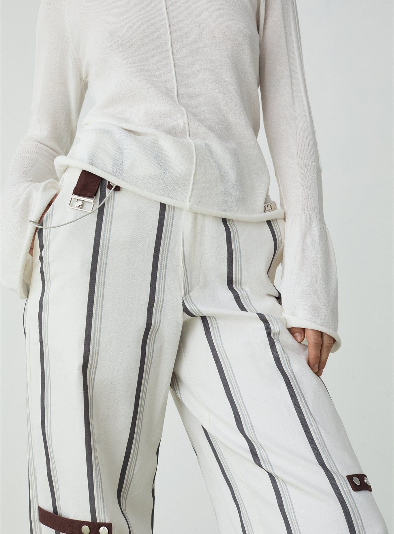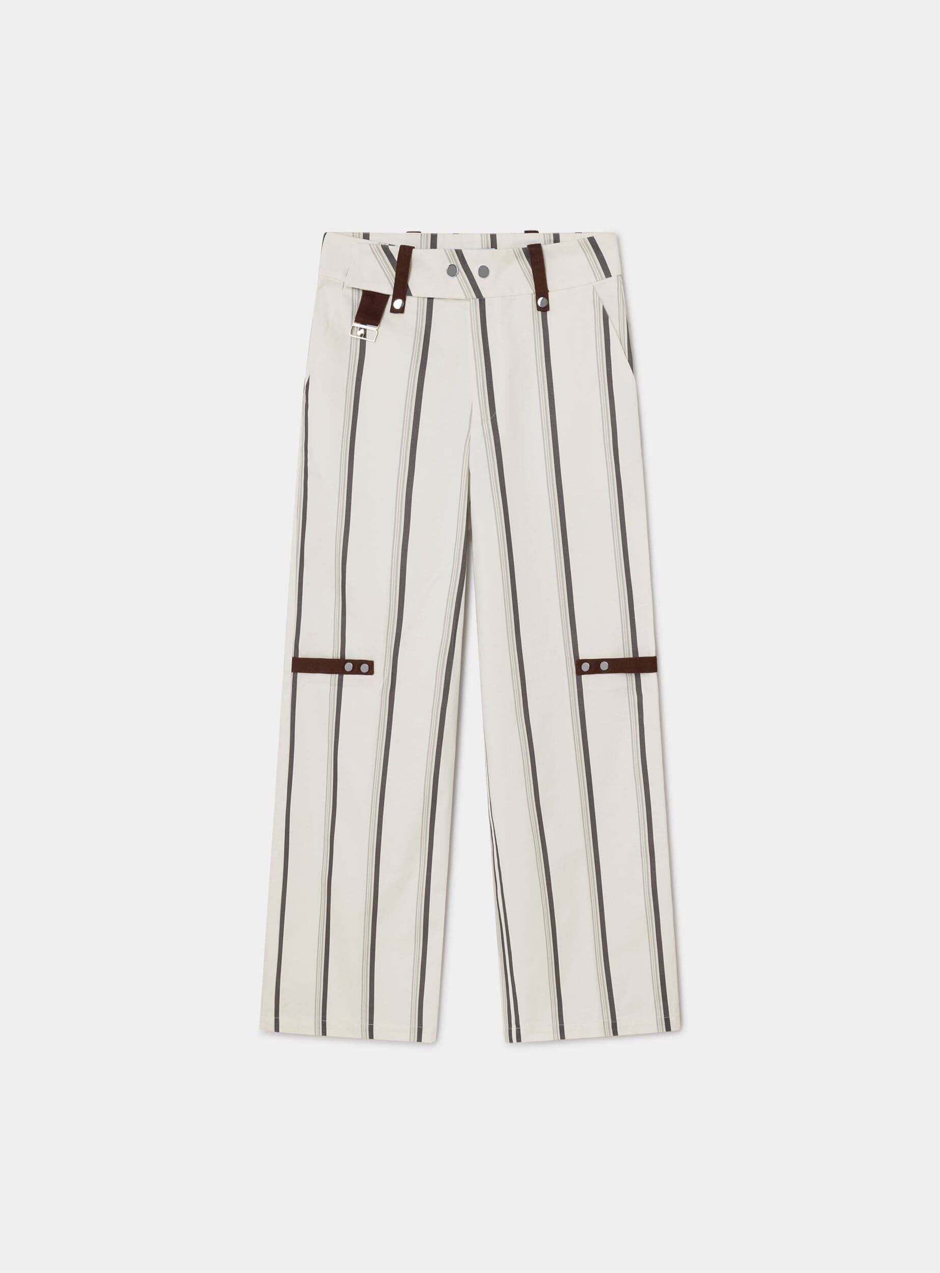 High-waist tailored pants featuring a wide-leg silhouette and side pockets. Contrast belt loops on waistband and strip with metal imagotype. Side tape details with snaps. Curved back seams and front fly with zipper and snap closure.