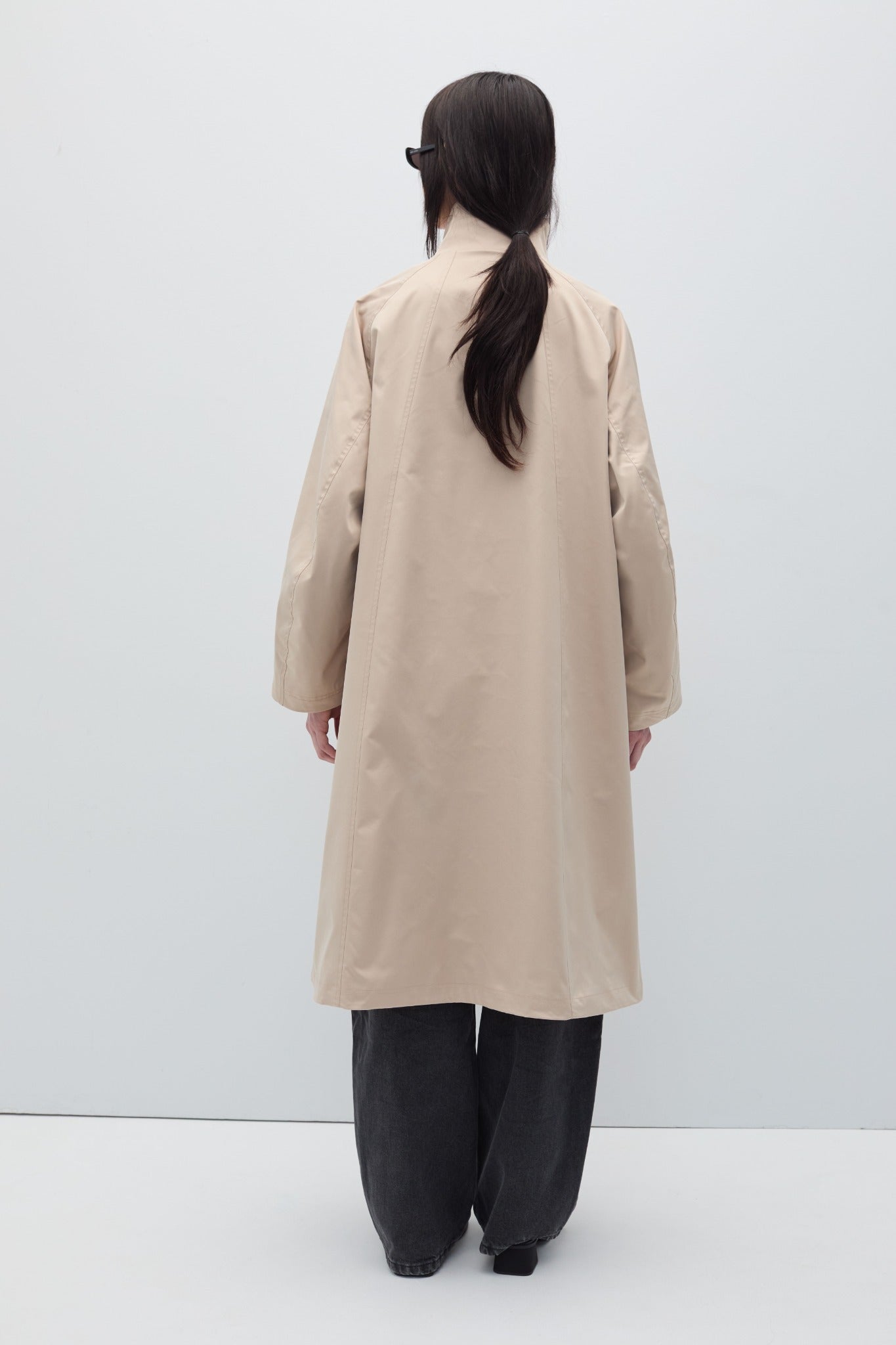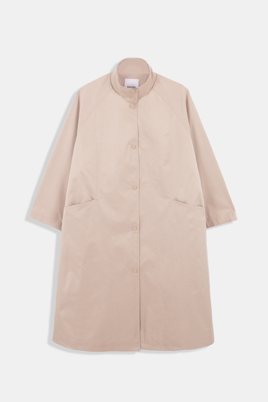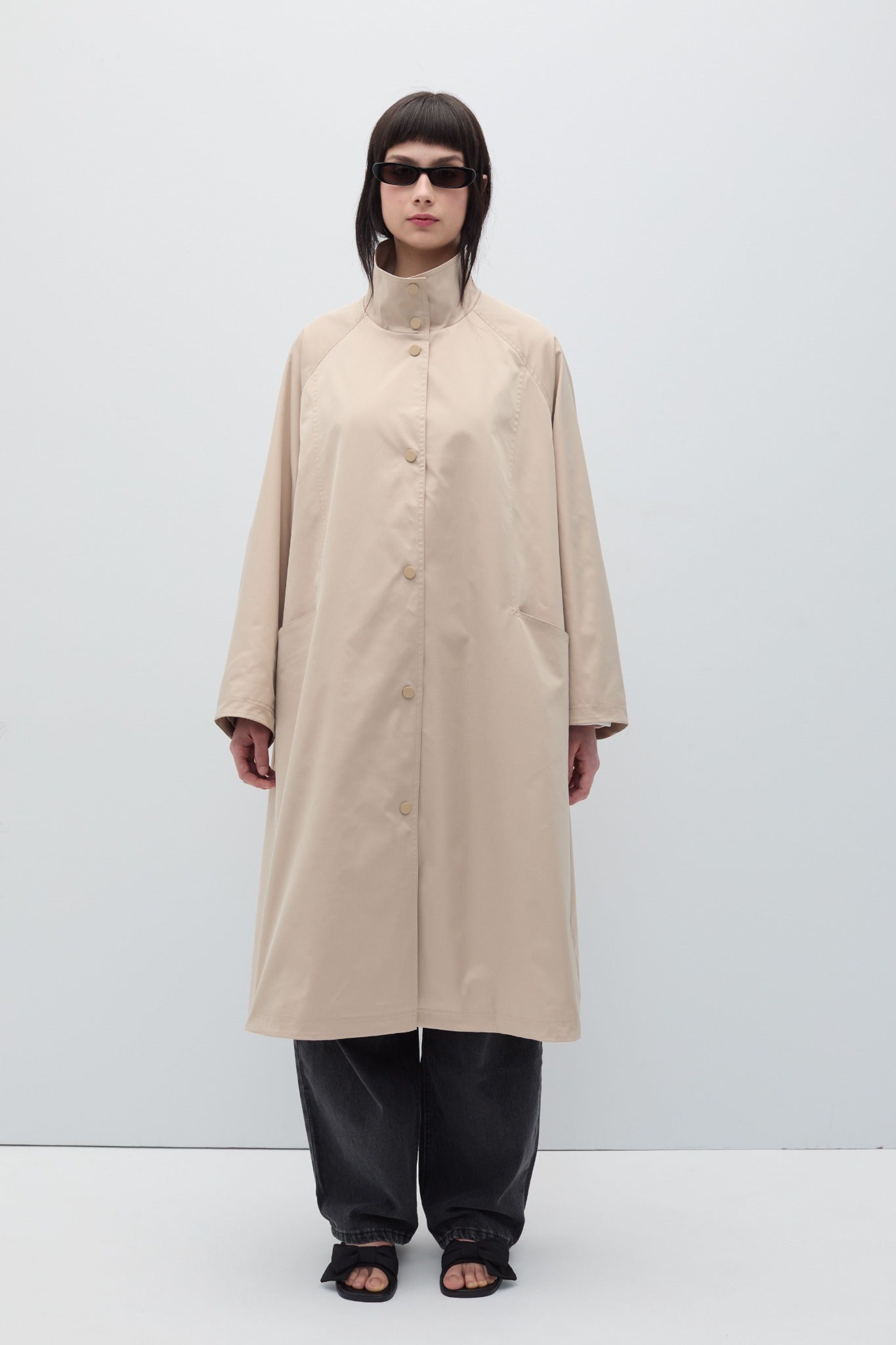 Oversized parka jacket with automatic buttons and high neck collar.