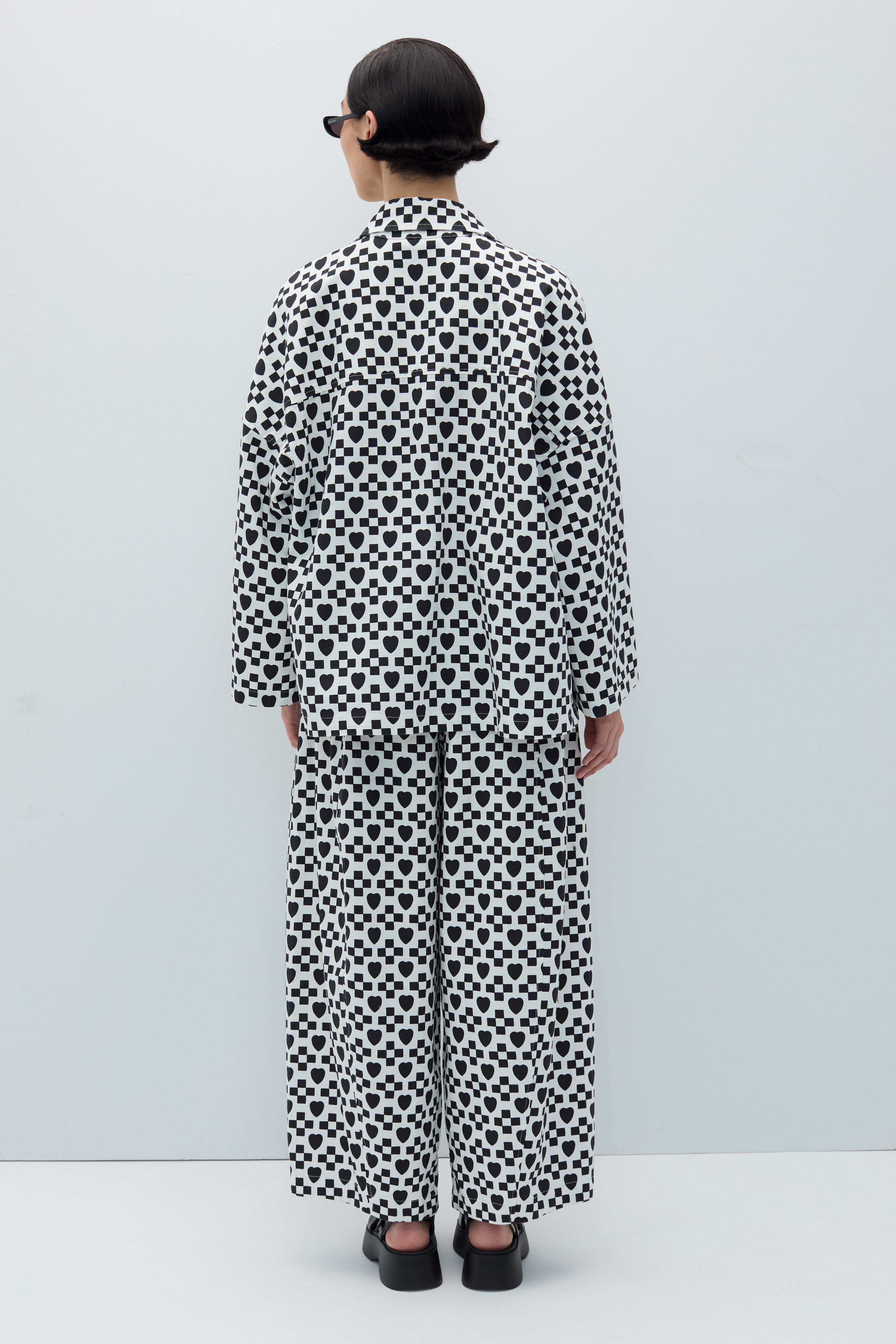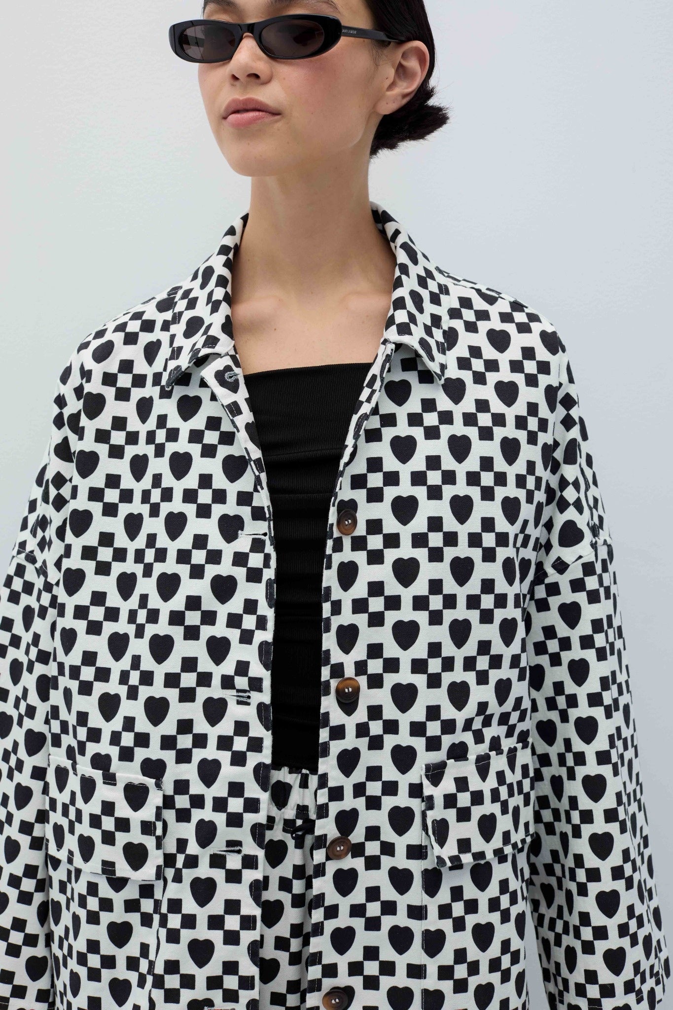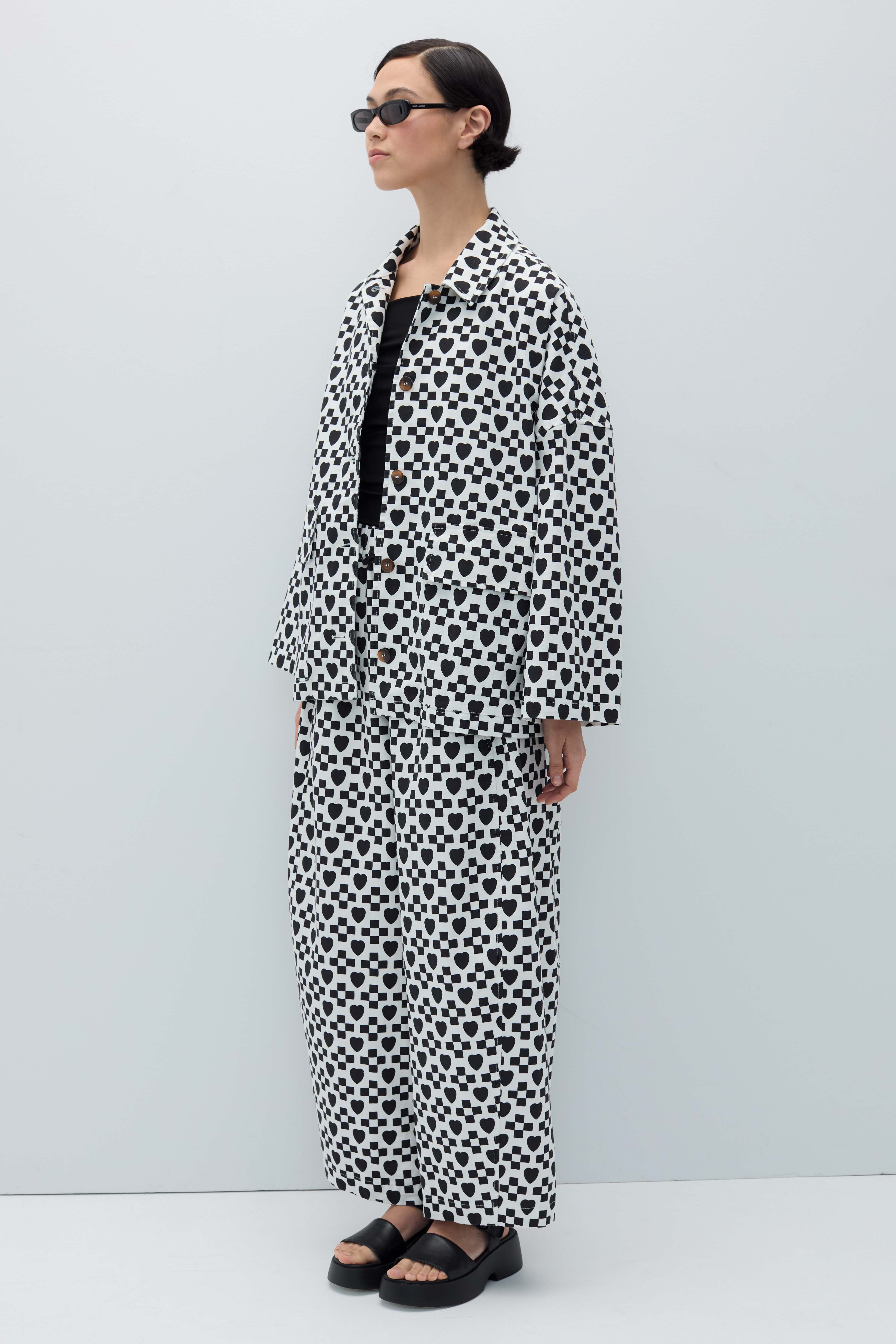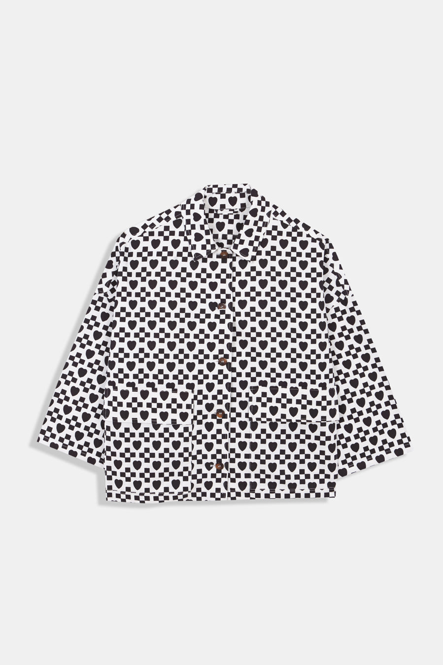 Short car jacket crafted from recycled cotton with a pointed collar and front patch pockets. Tailored in a laid-back silhouette, featuring a split hem at the back. Relaxed fit. Button closure.