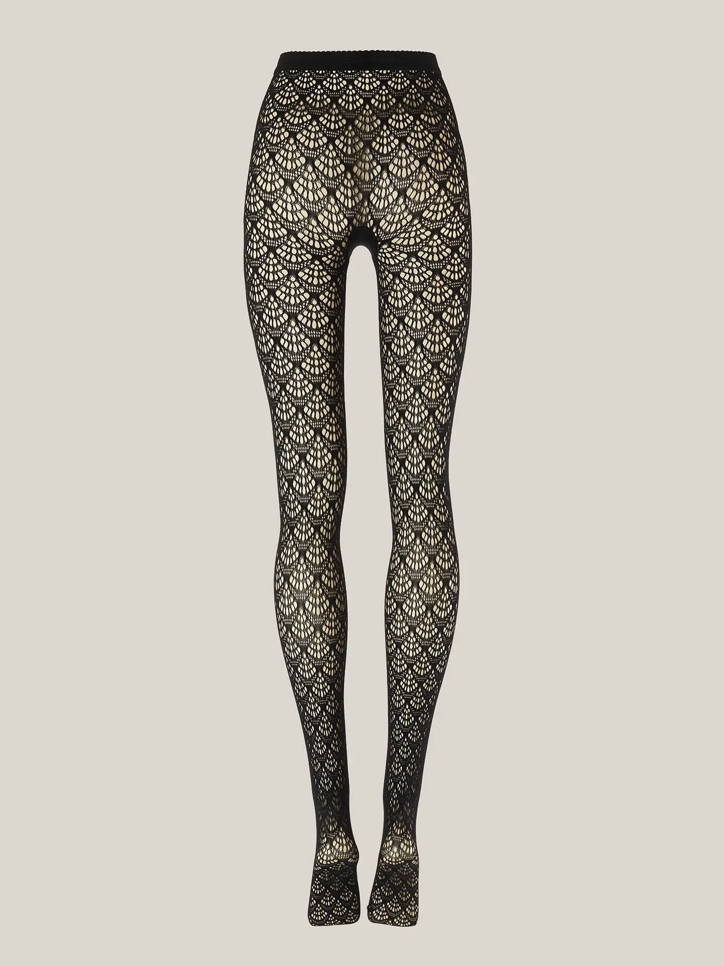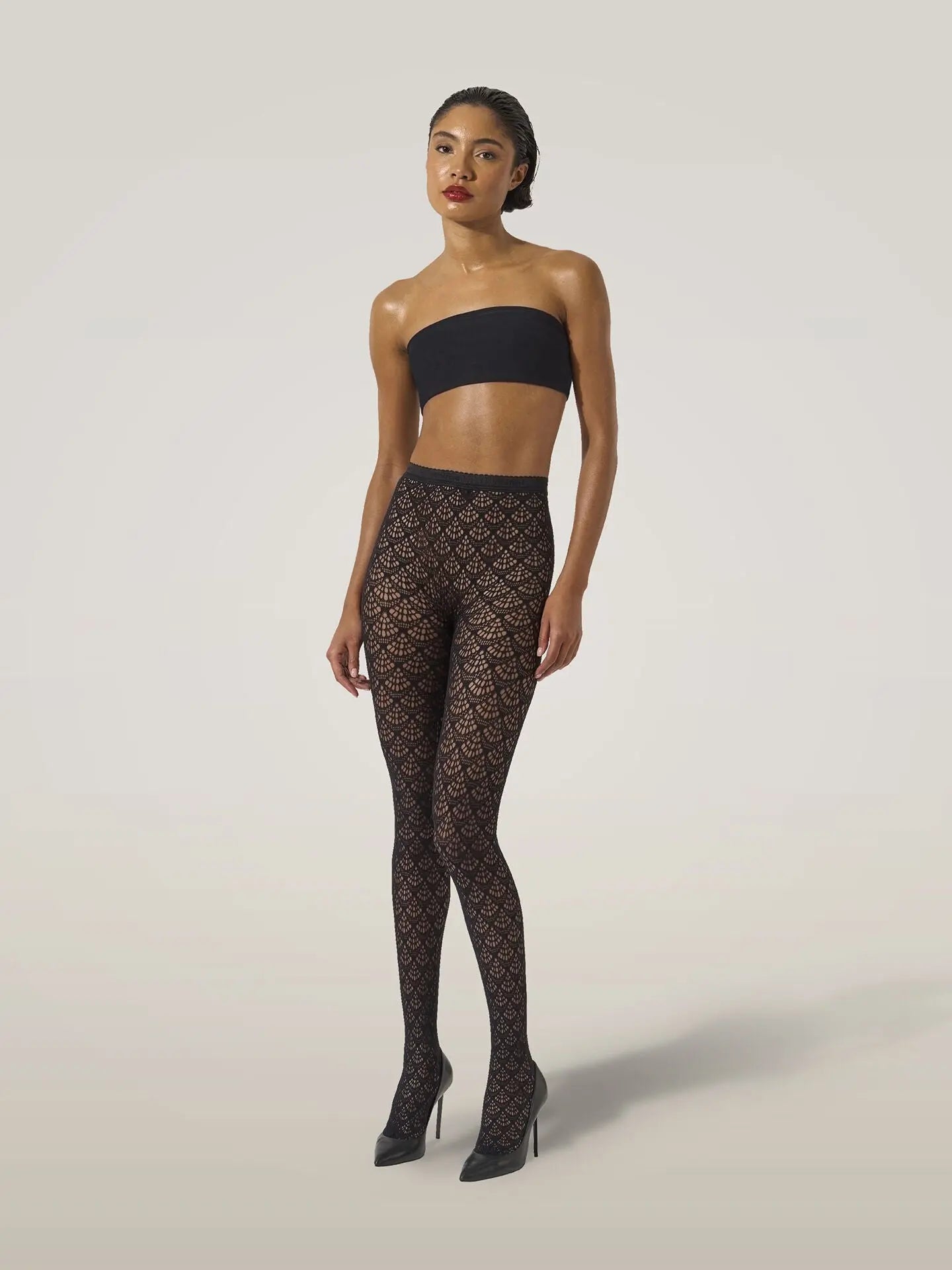 These tights channel a mermaid-inspired look with their geometric scale-like pattern and seamless construction, crafted using Wolford's signature warp knitting technique. They're made from sustainably dyed, recycled ECONYL® yarn and treated to achieve a modern, velvety matt finish. The soft elastic waistband with logo detailing completes this must-have seasonal pair.