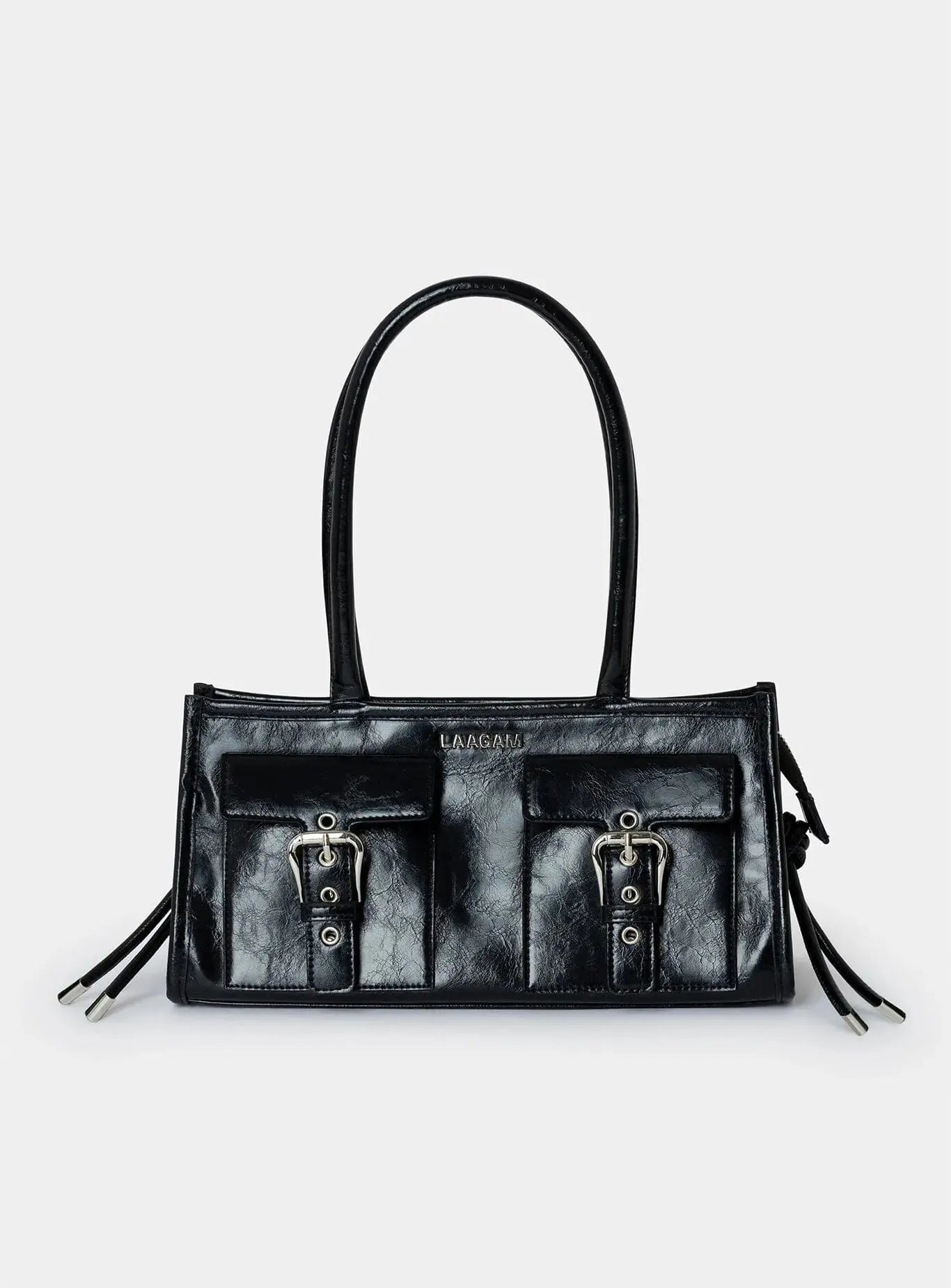 Black multi-pocket vegan leather bag with logo detail and metal buckles on the front. Shoulder handles, metal zipper closure and interior pocket. The vegan leather used for this style has texture and shine.Height x Length x Width / 13 x 25 x 6 cm