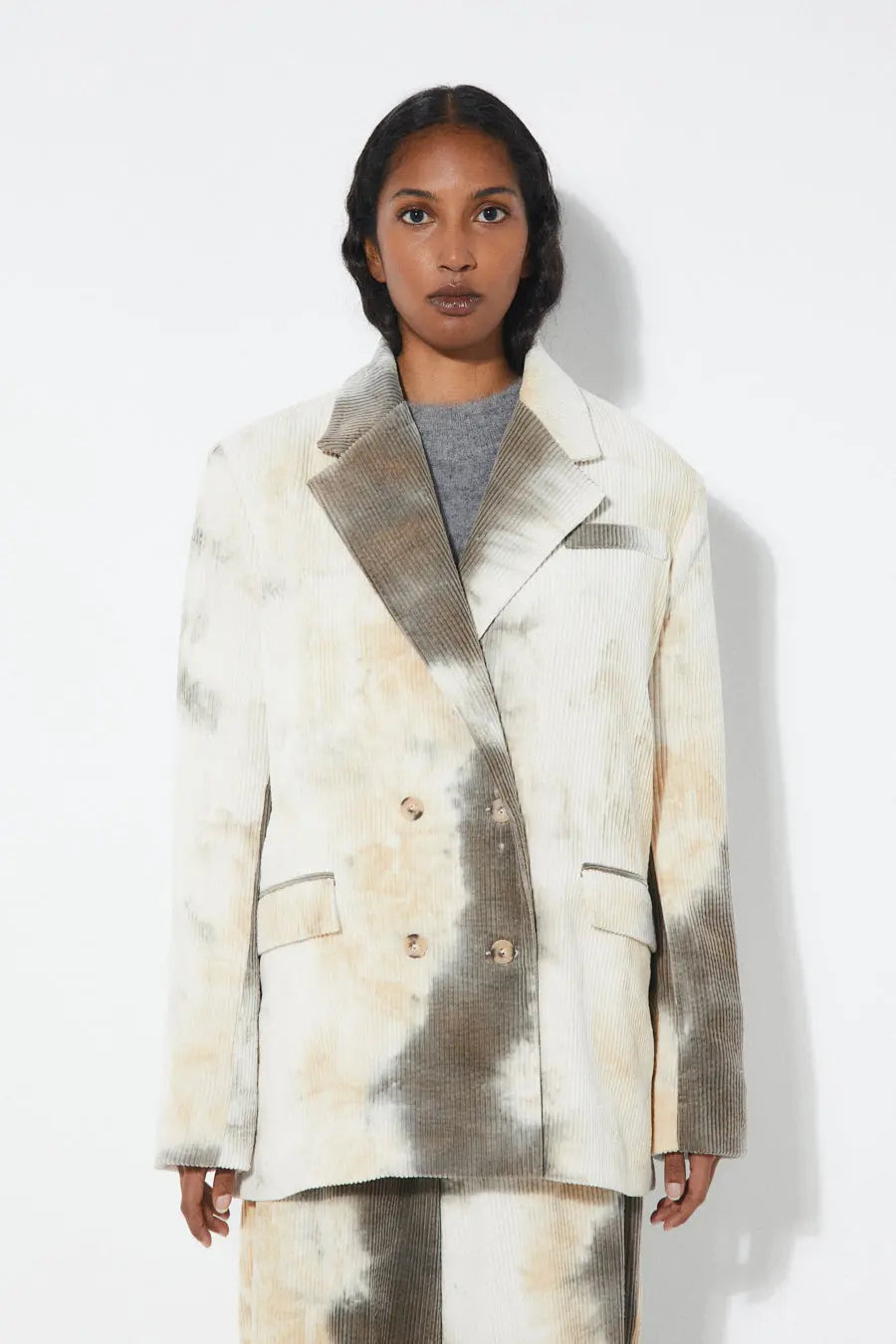 Rita Row oversize corduroy boyfriend-style blazer. Double-breasted model with notched lapels, four-button closure and inset front flap pockets. Inserted chest pocket. Lined and with shoulder pads.