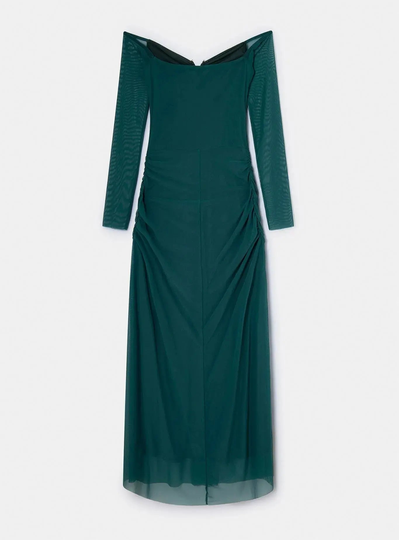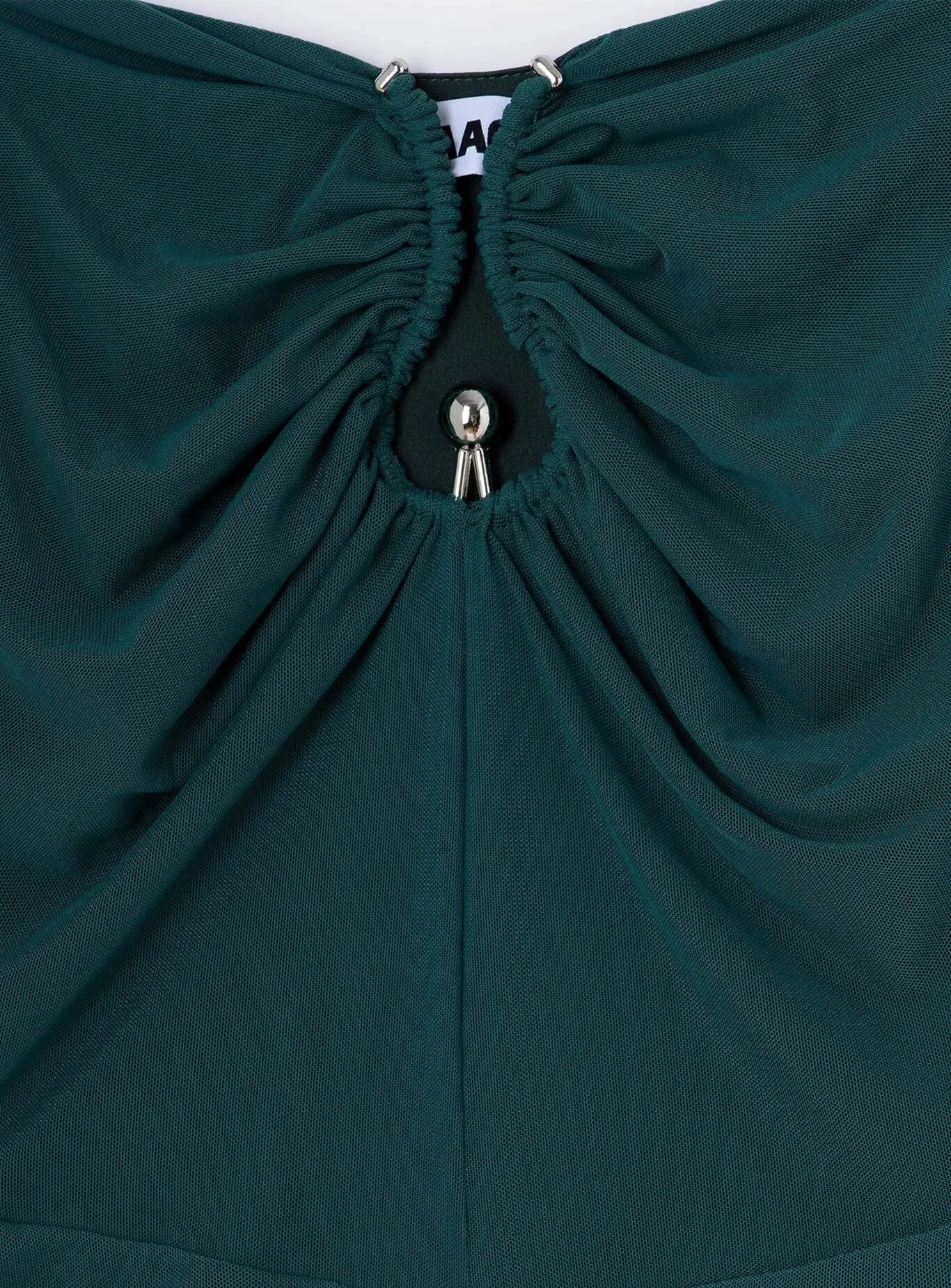 Midi tulle dress with thin straps and metal appliqué at chest. Ruched hip detail and sheer sleeves. Lining.