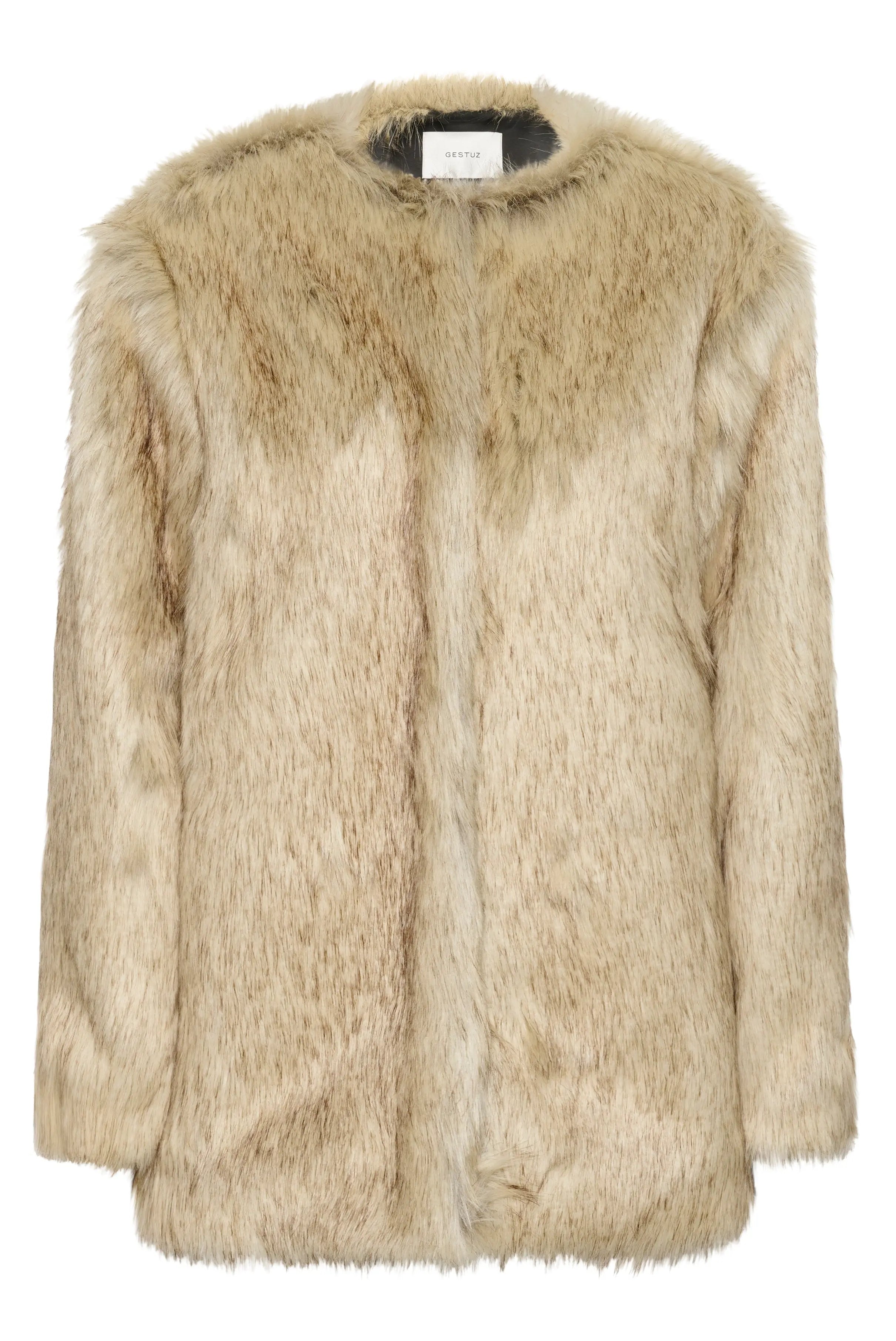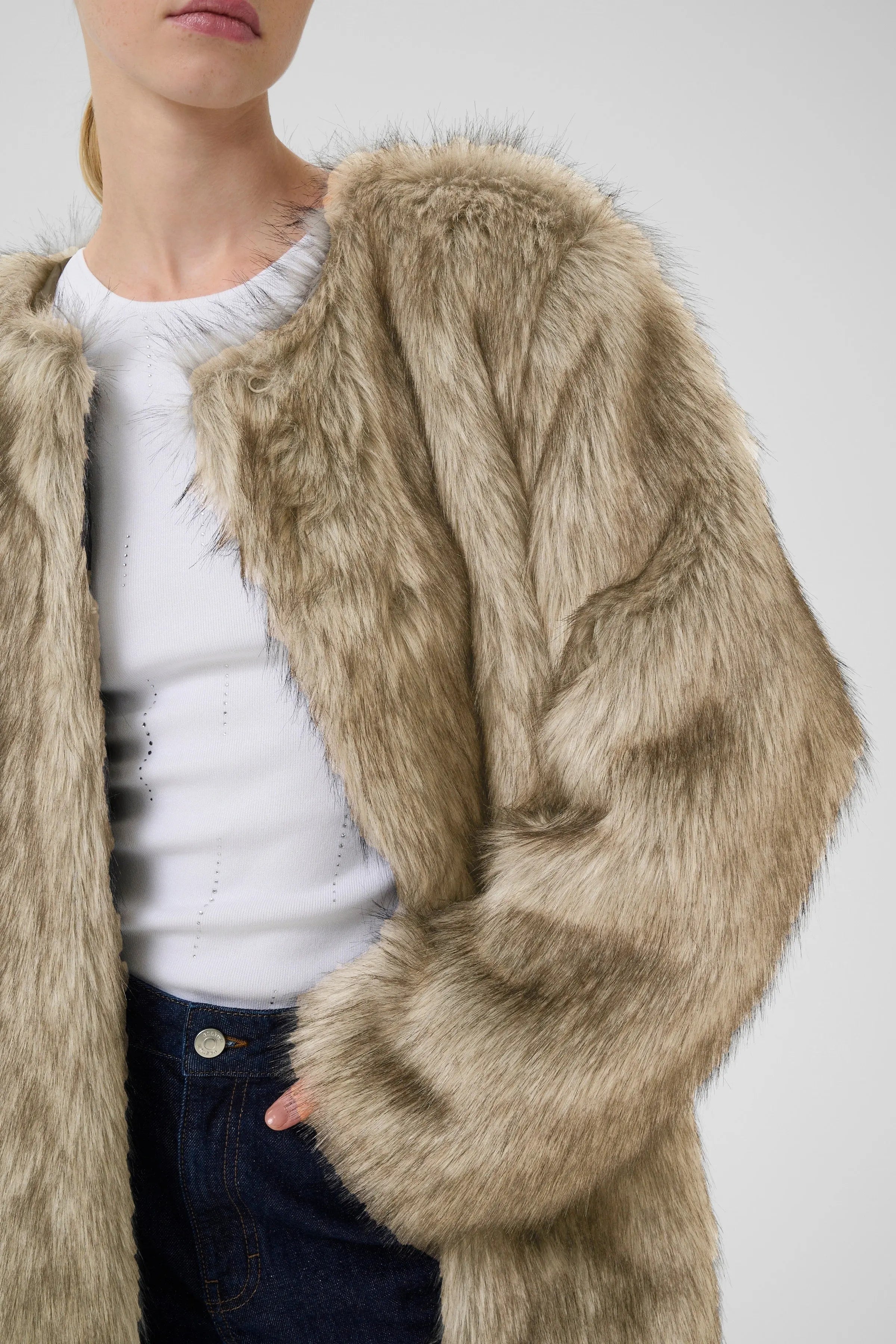 Faux fur jacket with a soft, voluminous surface and straight fit. Designed with long sleeves, round neckline, and hidden closure for a sleek expression.