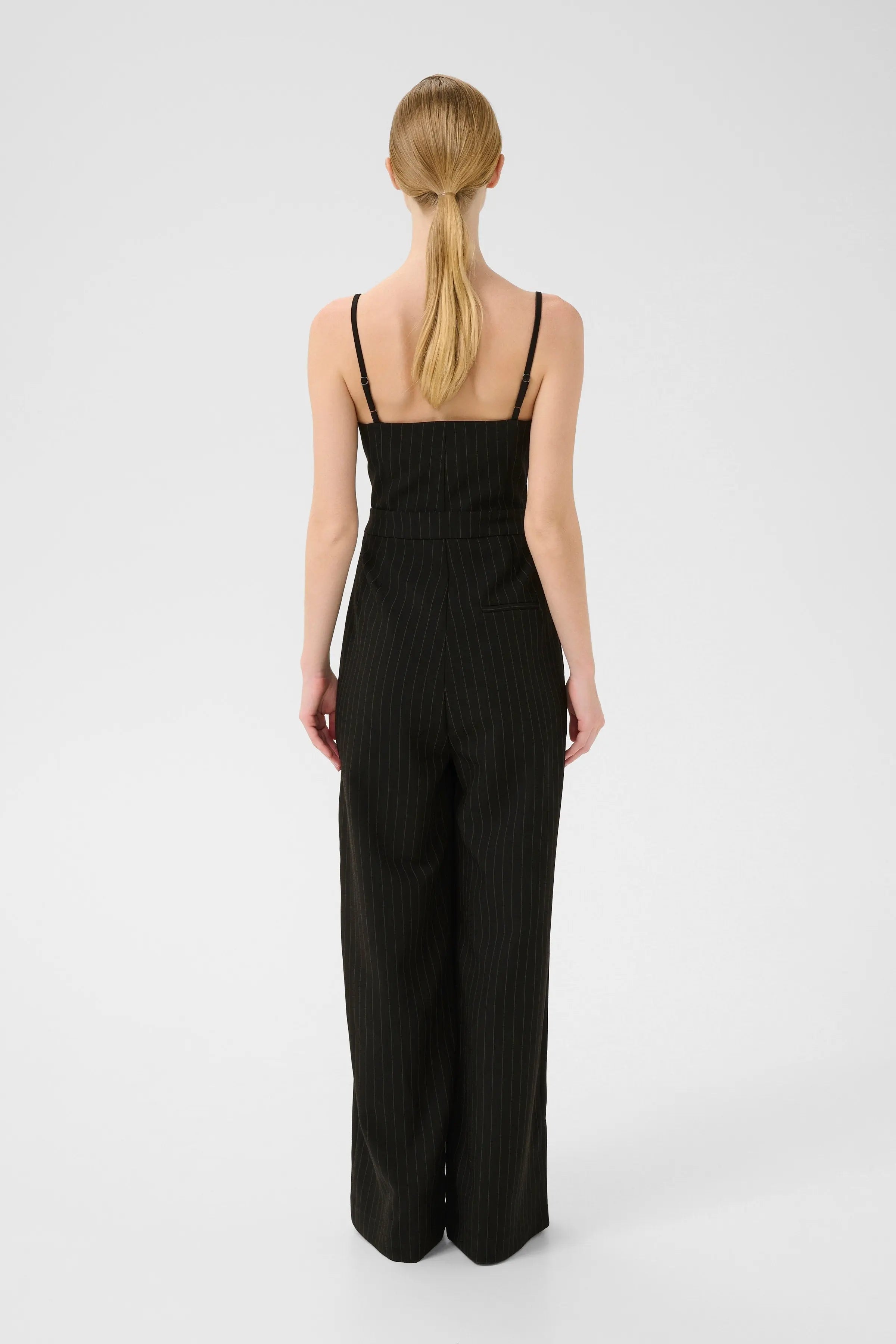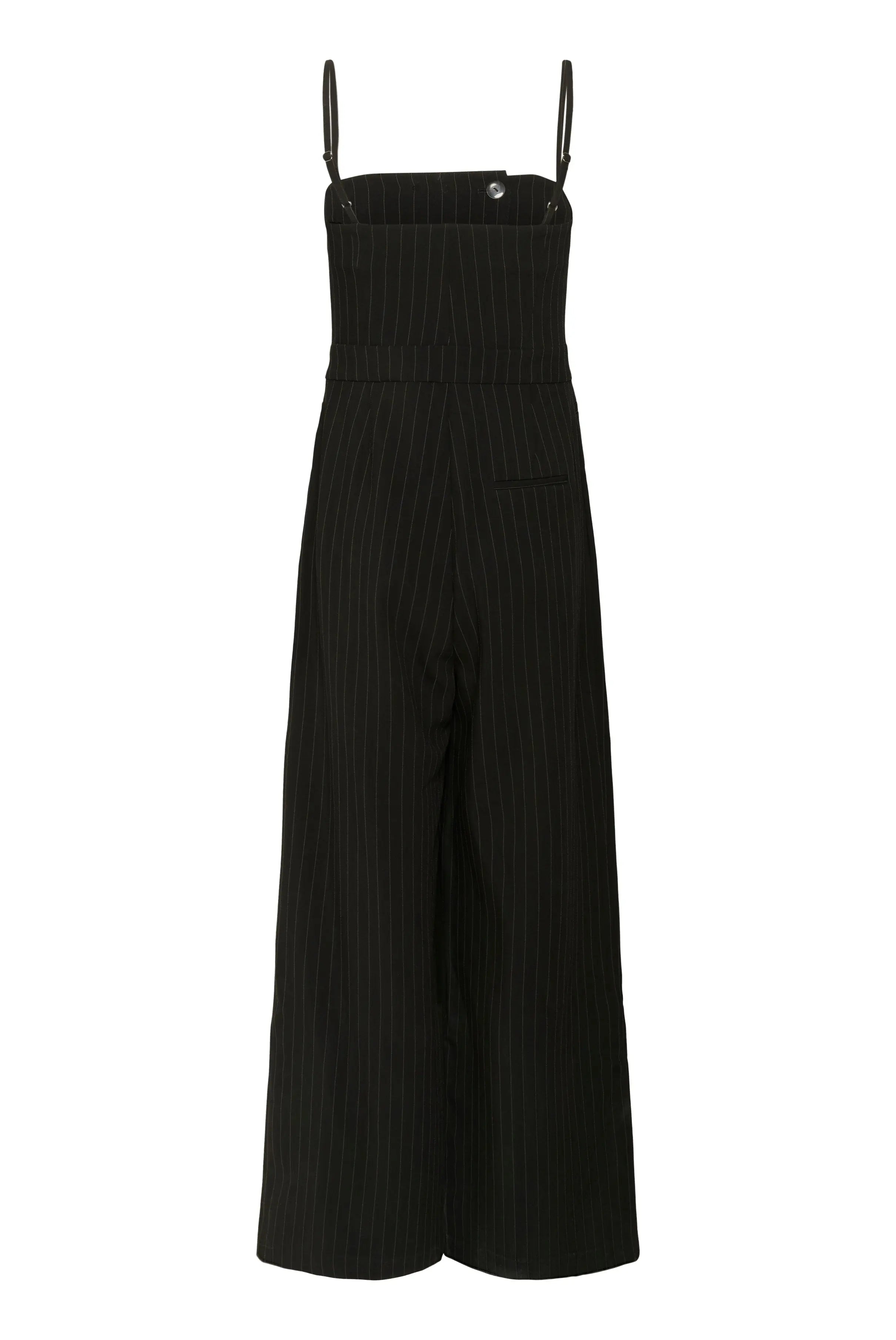 Gestuz pinstriped jumpsuit with a fitted bodice, double-breasted button detail, and adjustable spaghetti straps. Features wide-leg trousers and subtle tailoring for a clean, elongated silhouette.