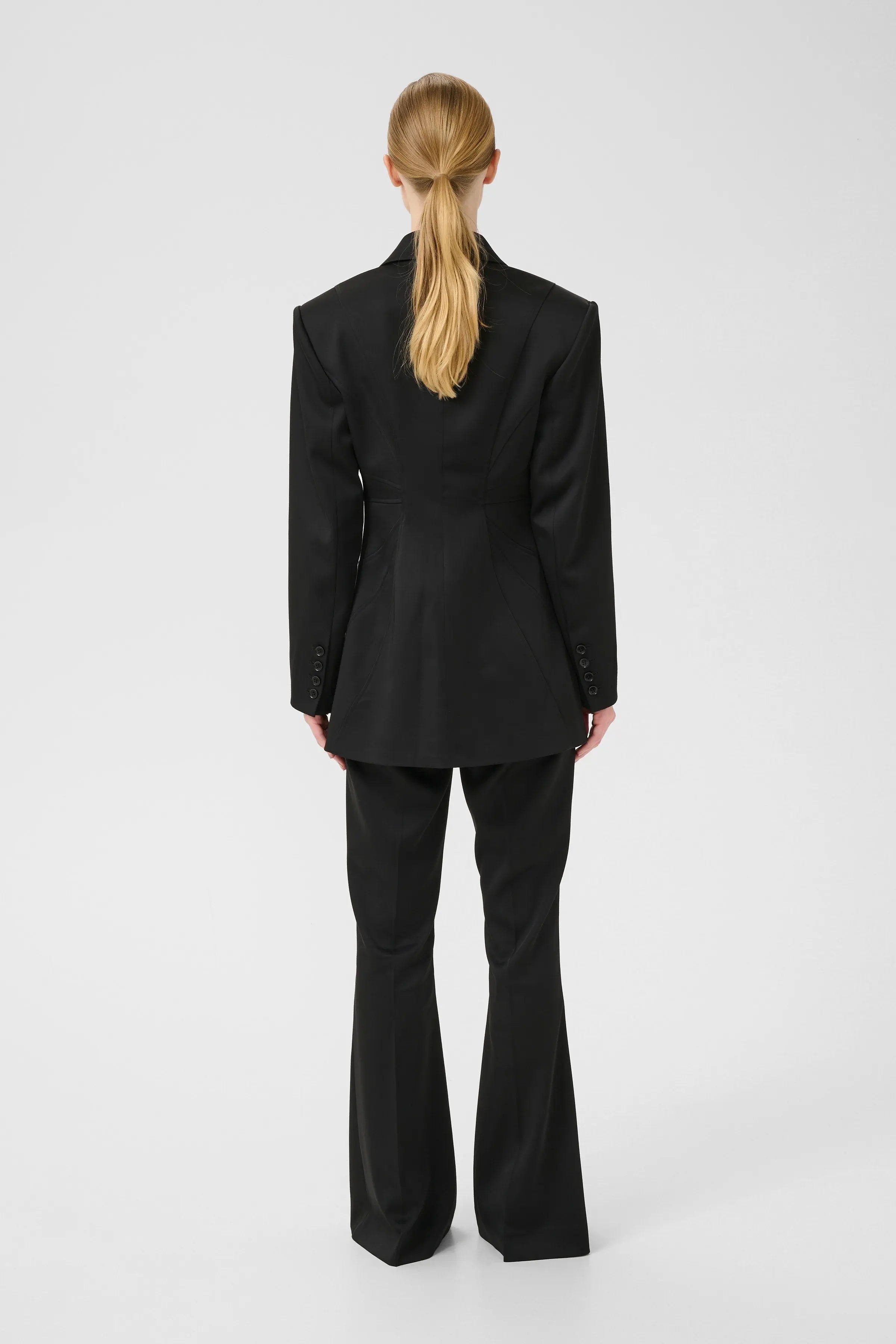 Gestuz fitted trousers with a mid-rise waist and trumpet-shaped legs. Made from smooth fabric and designed with belt loops and side pockets for a sleek, structured look.