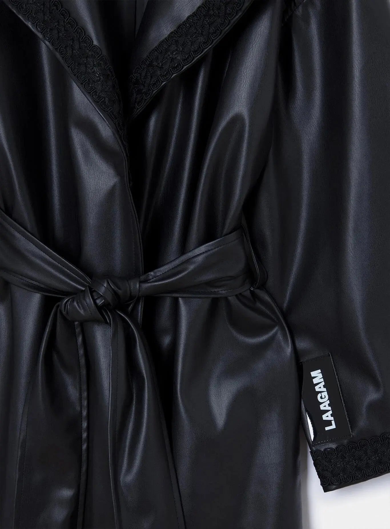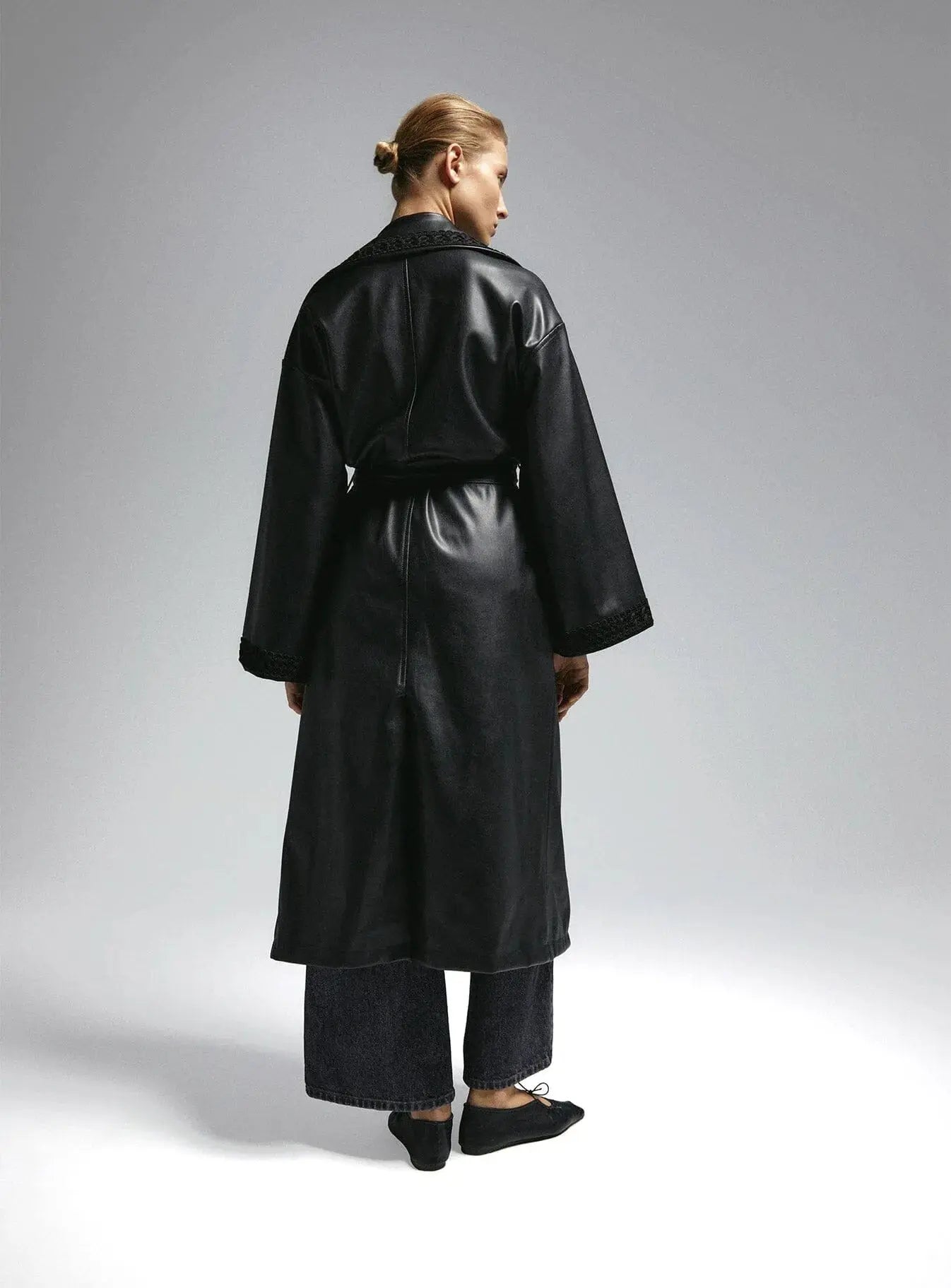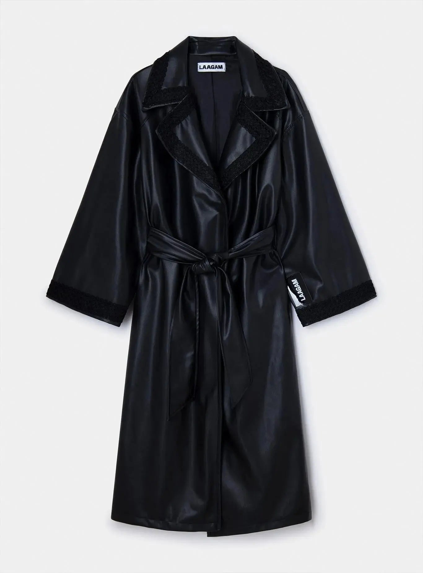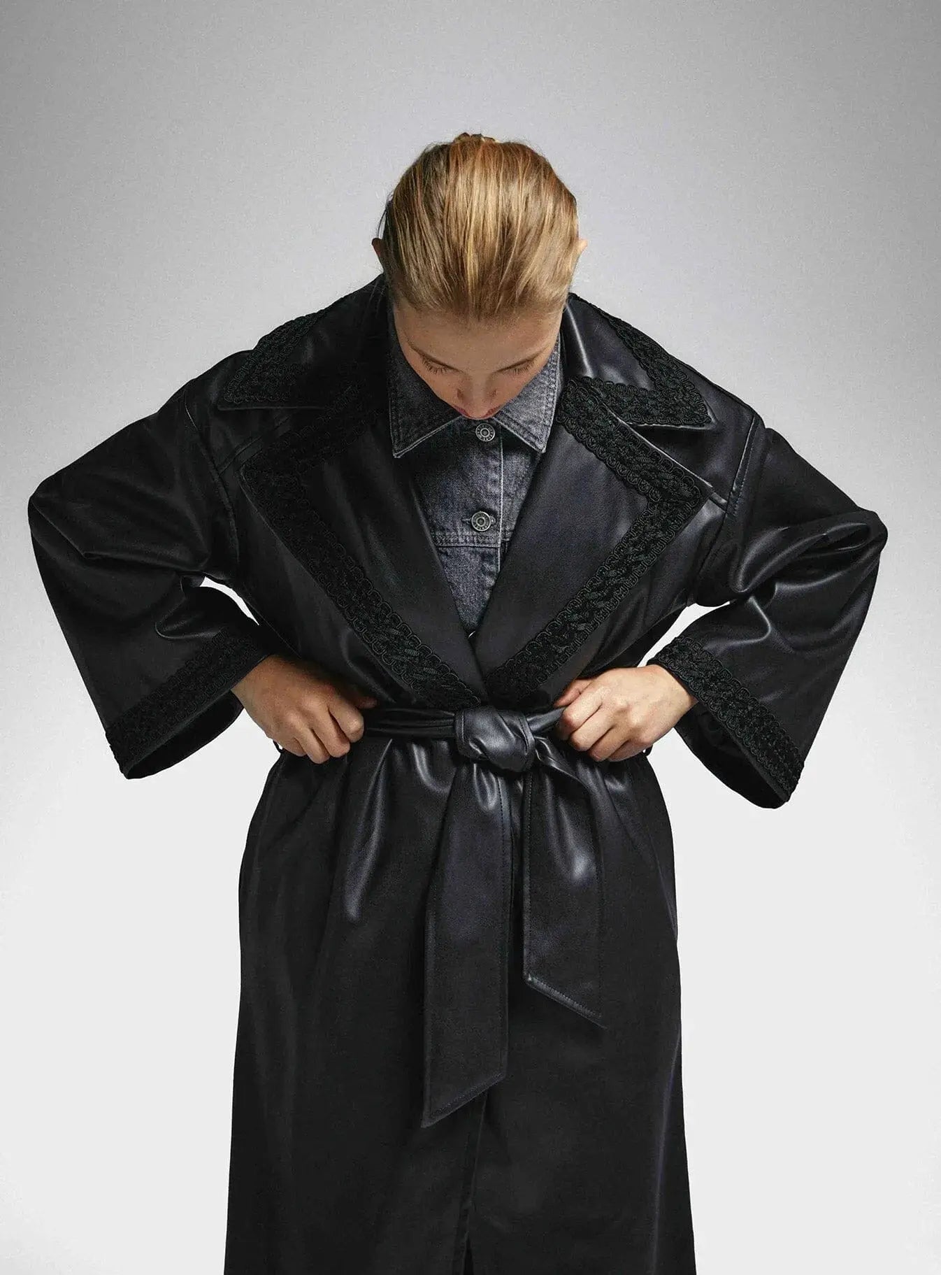 Long trench coat with lapel collar and long sleeves. Trimmings on lapel and cuffs. Side pockets. Tied belt in the same material. Vent at the hem.